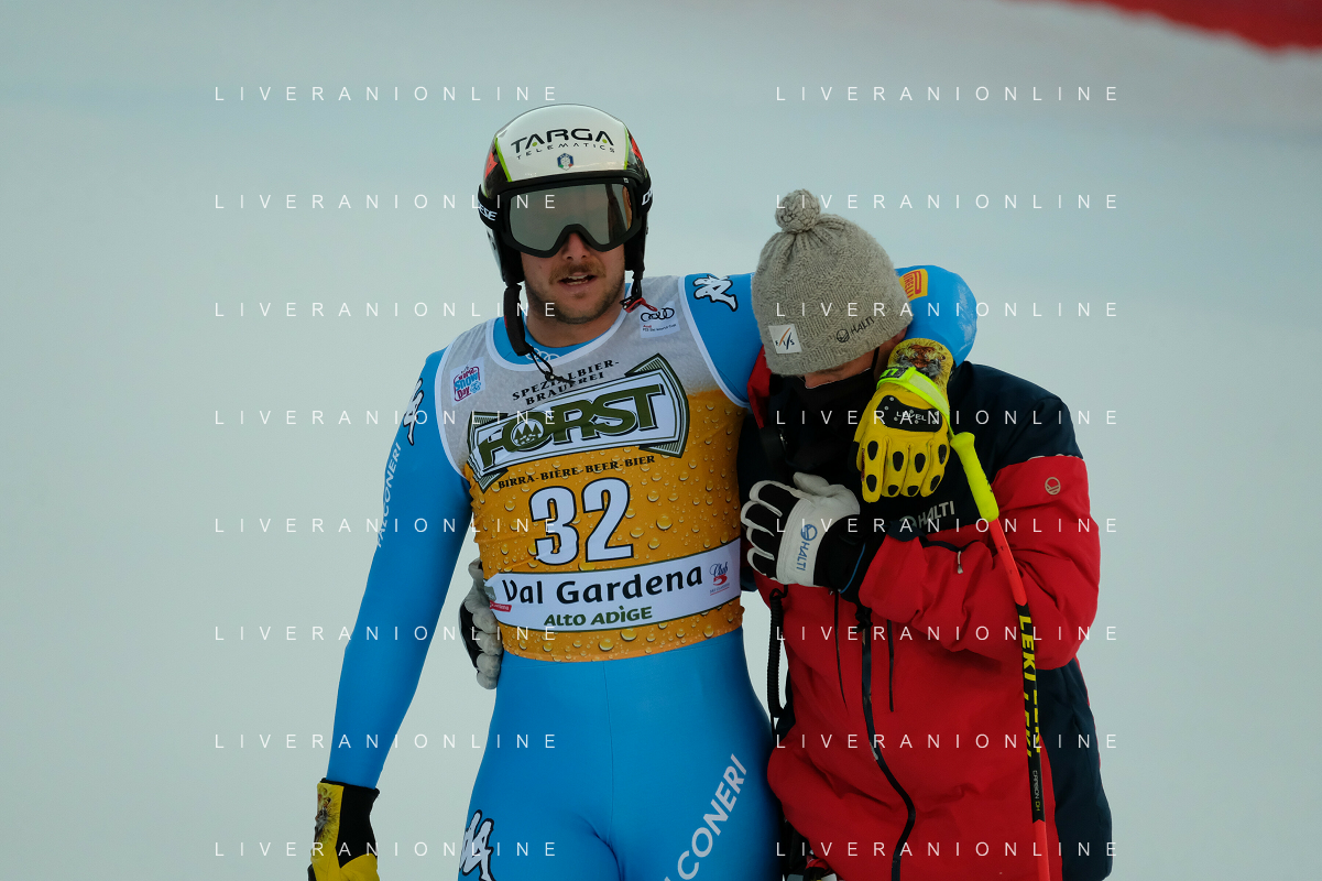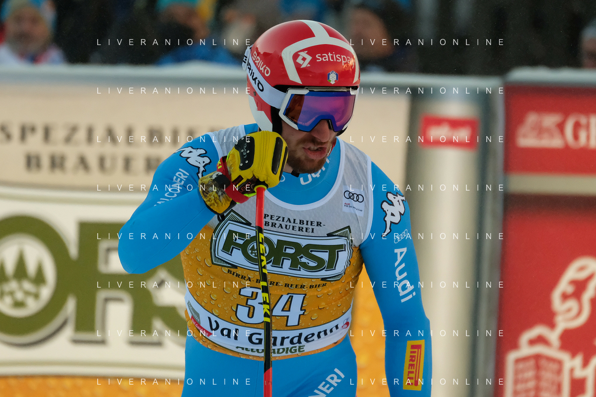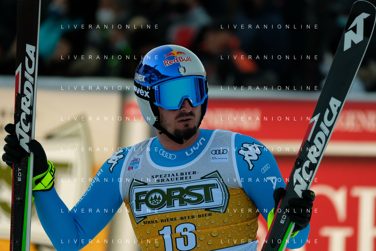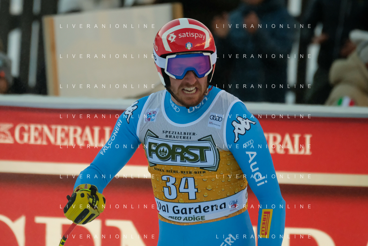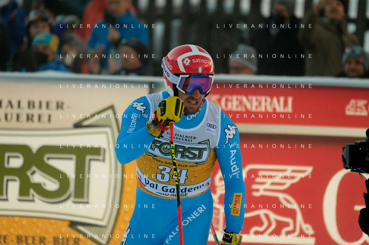 TommasiniR/LMedia - 2021 FIS Ski World Cup - Men's Downhill - alpine ski race 18 December 2021 - Saslong, Val Gardena, Italy Photo showing: Mattia Casse (ITA) at the finish line. @TommasiniR/LMedia/AGENZIA ALDO LIVERANI SAS