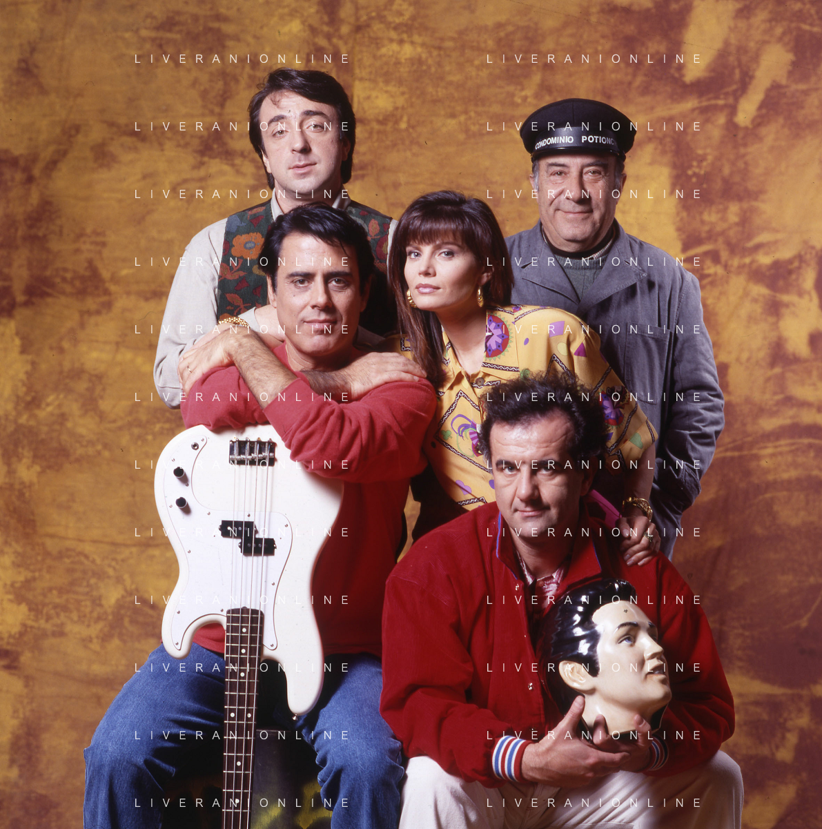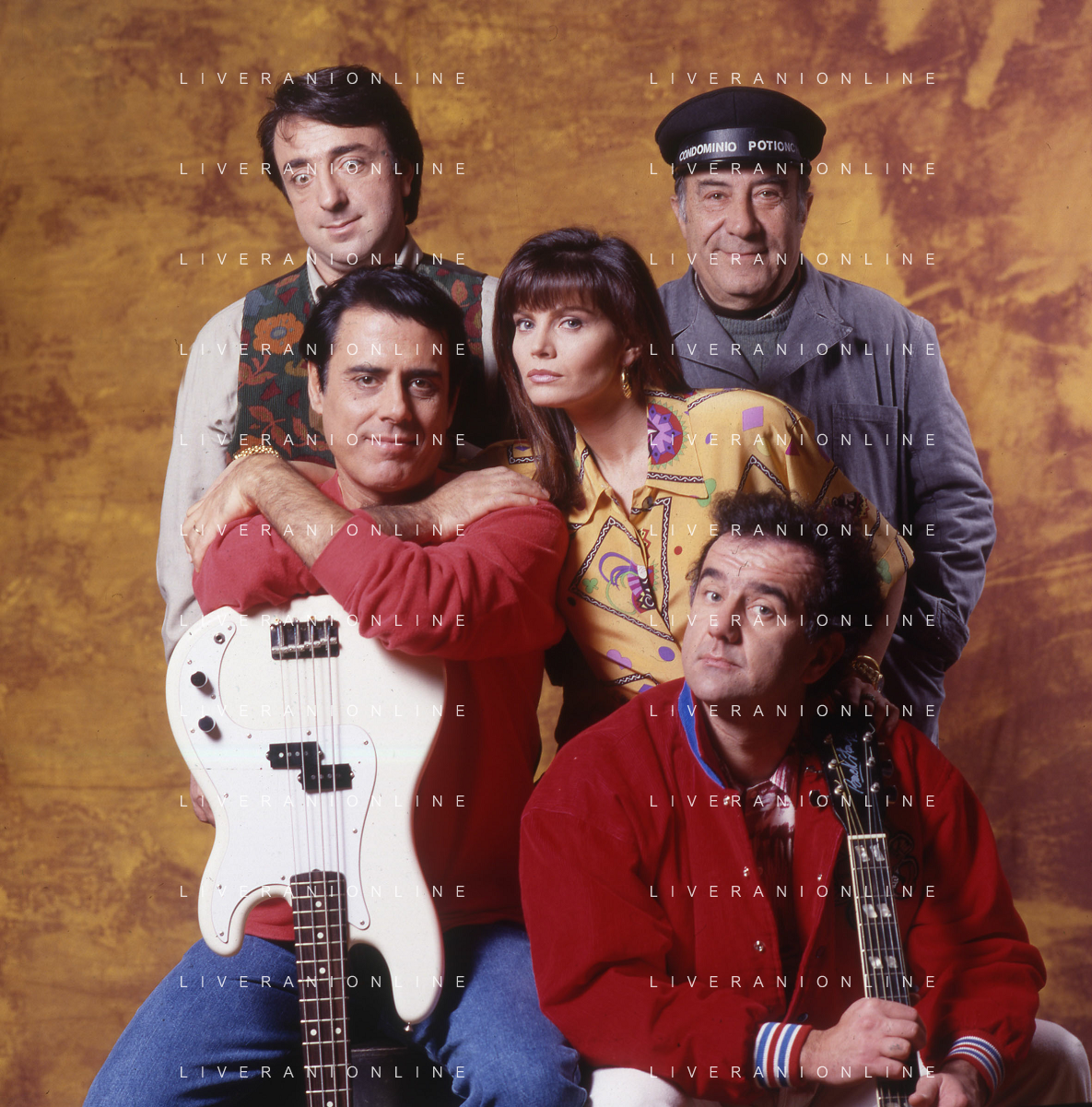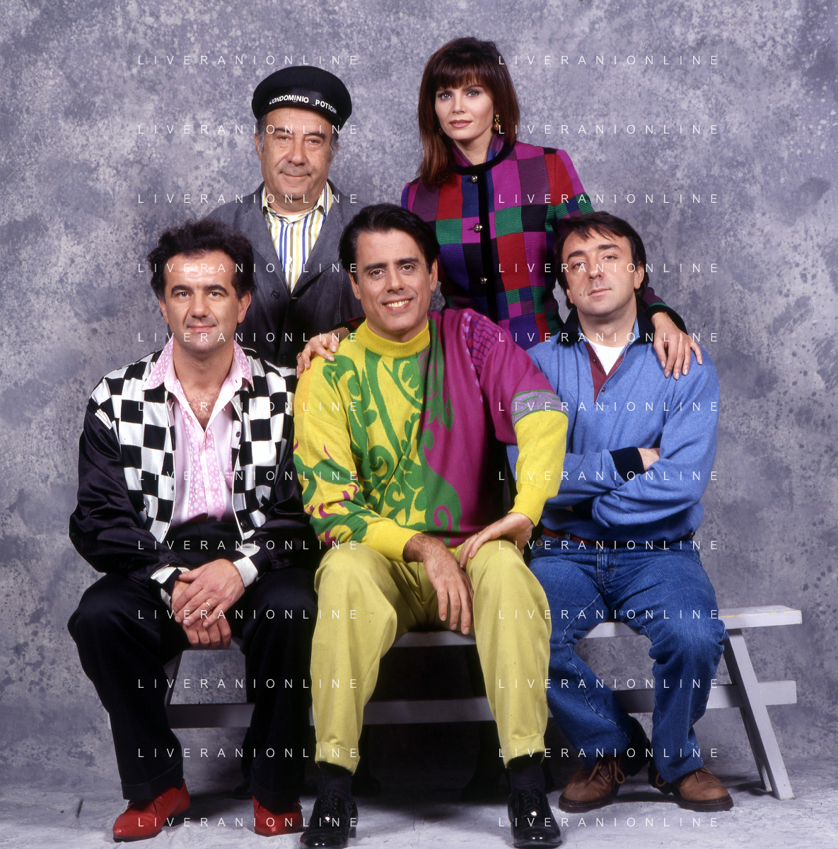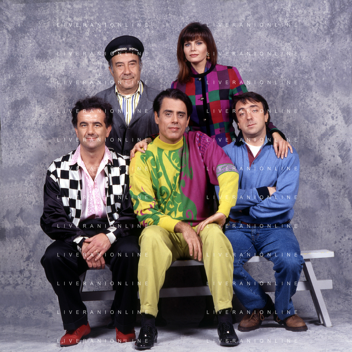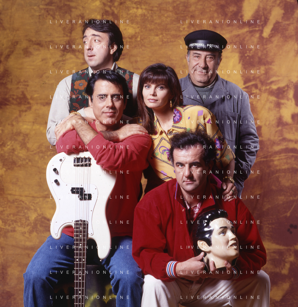 RETROSPETTIVA TEO TEOCOLI ATTORE NELLA FOTO TEO TEOCOLI NELLA SERIE TELEVISIVA“ VICINI DI CASA“ A MILANO NELL'ANNO 1991 CON ENZO CANNAVALE-GABRIELLA GOLIA-SILVIO ORLANDO E GENE GNOCCHI AG ALDO LIVERANI SAS