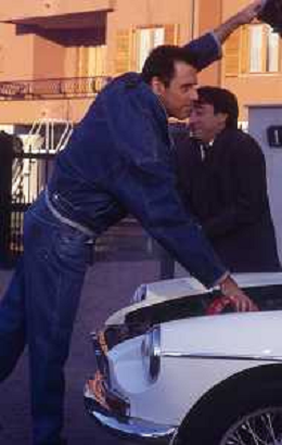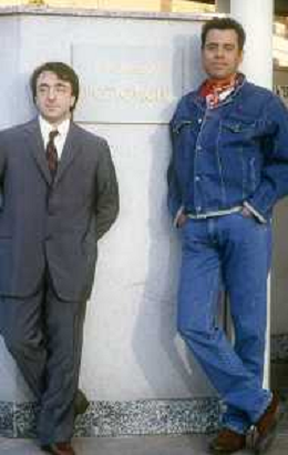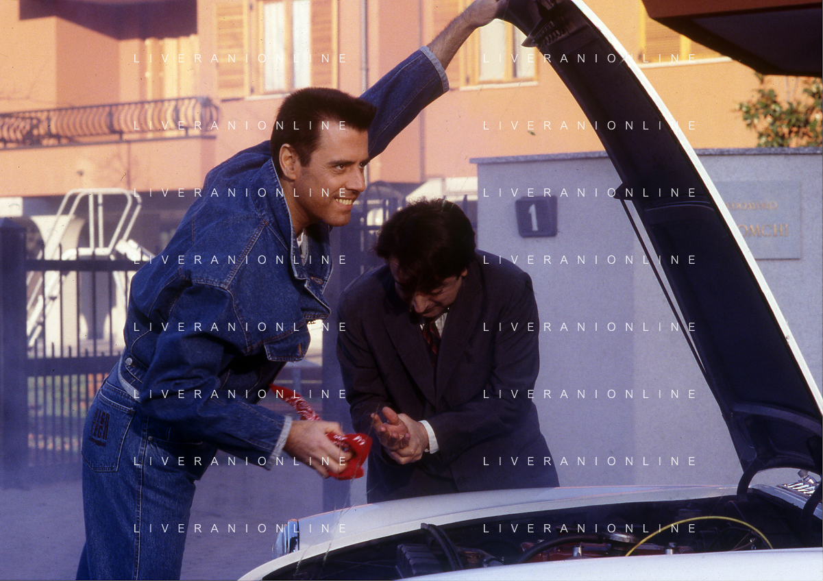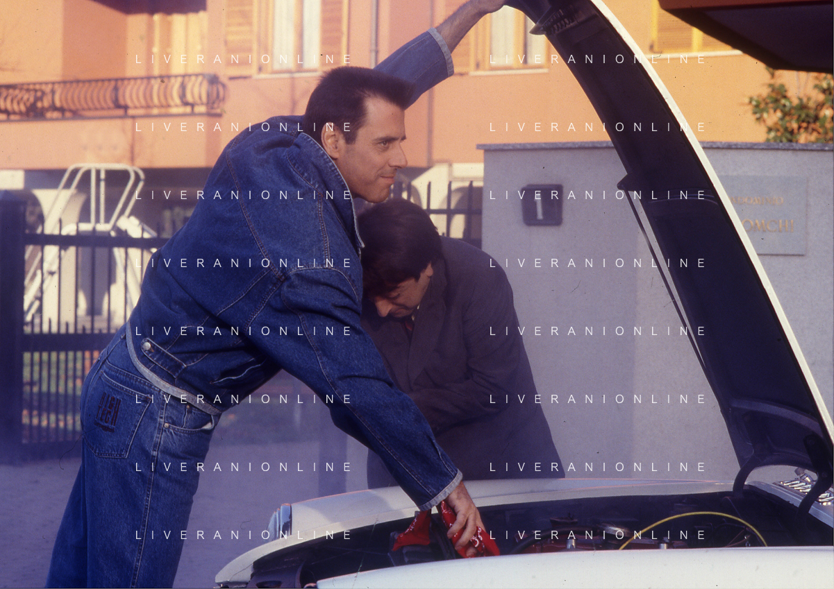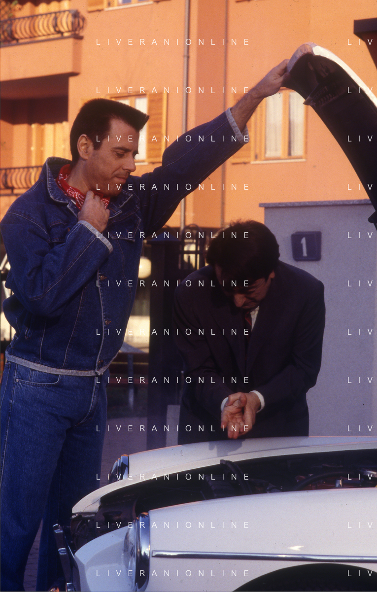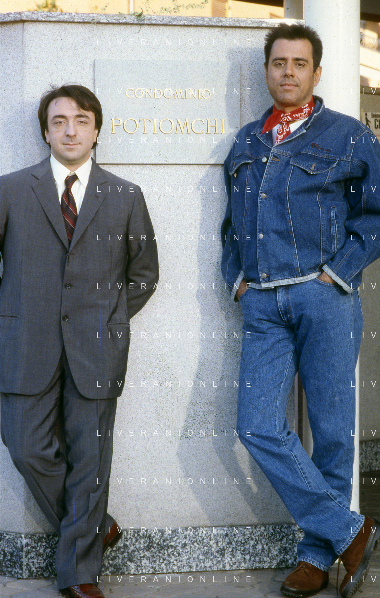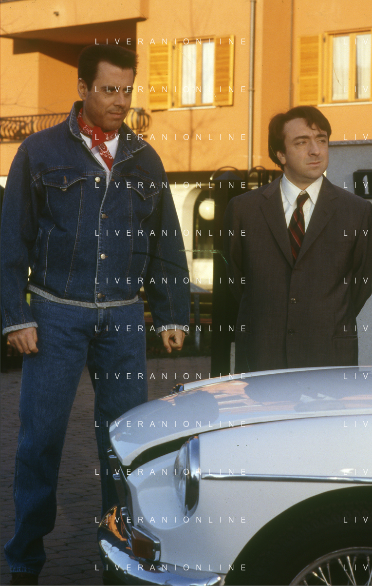 RETROSPETTIVA TEO TEOCOLI ATTORE NELLA FOTO TEO TEOCOLI NELLA SERIE TELEVISIVA“ VICINI DI CASA“ A MILANO NELL'ANNO 1991 CON SILVIO ORLANDO AG ALDO LIVERANI SAS