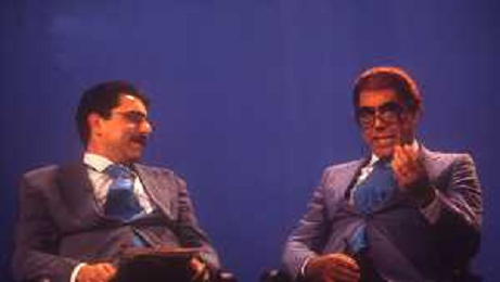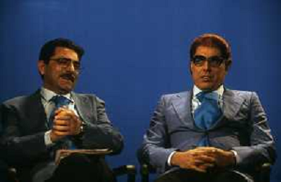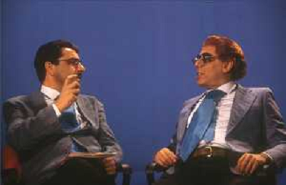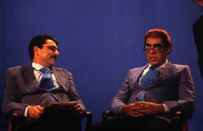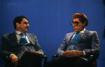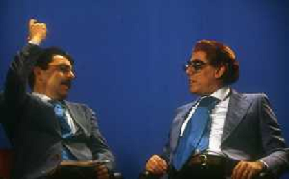 RETROSPETTIVA TEO TEOCOLI ATTORE NELLA FOTO TEO TEOCOLI IMITAZIONE DI FELICE CACCAMO NELLA TRASMISSIONE “MAI DIRE GOAL“ NELL'ANNO 1993 CON IL GIORNALISTA FRANCO LIGAS AG ALDO LIVERANI SAS