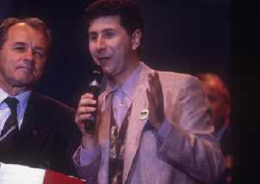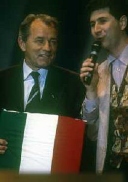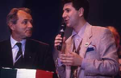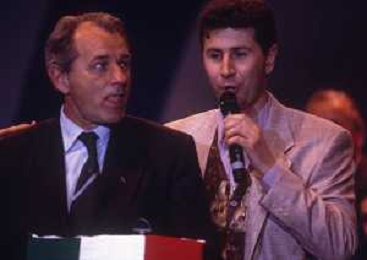 RETROSPETTIVA FABIO AGOSTINO FRANCESCO FAZIO CONDUTTORE TELEVISIVO-IMITATORE-SCRITTORE E PRODUTTORE ARTISTICO NELLA FOTO FABIO FAZIO NELL'ANNO 1991 ALLA FESTA SCUDETTO DELLA SAMPDORIA CALCIO CON VUJADIN BOSKOV AG ALDO LIVERANI SAS