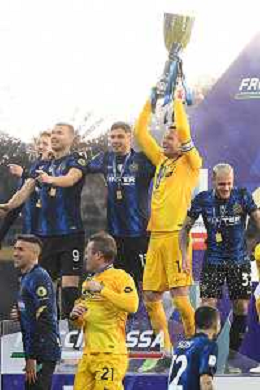 Milano 12.01.2022 Stadio Giuseppe Meazza ©Alessandro Falzone/Agenzia Aldo Liverani Inter vs Juventus Supercoppa Frecciarossa Nella foto : Esultanze premiazione Inter Samir Handanovic alza la supercoppa italiana