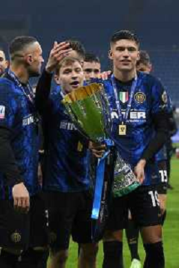 Milano 12.01.2022 Stadio Giuseppe Meazza ©Alessandro Falzone/Agenzia Aldo Liverani Inter vs Juventus Supercoppa Frecciarossa Nella foto : Premiazione Finale Inter nicolo' barella e correa joaquin