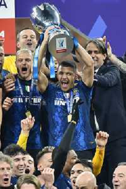 festeggiamenti Inter dopo la premiazione - Alexis Sanchez con il trofeo Inter vs Juventus Finale Supercoppa Frecciarossa Milano 12-01-2022 Stadio Giuseppe Meazza - San Siro foto Roberto Garavaglia/ag. Aldo Liverani sas /AGENZIA ALDO LIVERANI SAS
