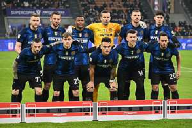 la formazione dell'Inter, in piedi da SX Milan Skriniar, Stefan de Vrij, Denzel Dumfries, Samir Handanovic, Edin Dzeko e Alessandro Bastoni; in basso da SX Marcelo Brozovic, Nicolo' Barella, Lautaro Martinez, Ivan Perisic e Hakan Calhanoglu Inter vs Juventus Finale Supercoppa Frecciarossa Milano 12-01-2022 Stadio Giuseppe Meazza - San Siro foto Roberto Garavaglia/ag. Aldo Liverani sas /AGENZIA ALDO LIVERANI SAS