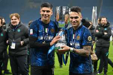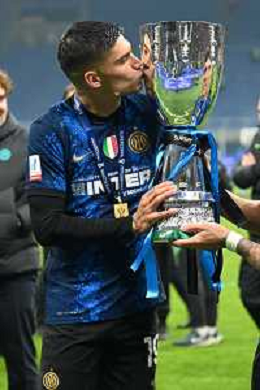 festeggiamenti Inter dopo la premiazione - joaquin correa con il trofeo Inter vs Juventus Finale Supercoppa Frecciarossa Milano 12-01-2022 Stadio Giuseppe Meazza - San Siro foto Roberto Garavaglia/ag. Aldo Liverani sas /AGENZIA ALDO LIVERANI SAS