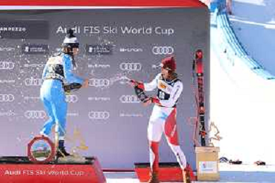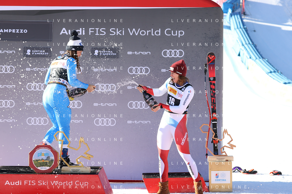 Luca Tedeschi/LMedia - 2022 FIS Ski World Cup - Women Super Giant - alpine ski race January 23 2022 - Olympia slope Cortina Ampezzo, Italy 2022 FIS Ski World Cup - Women Super Giant Photo showing: Elena Curtoni (ITA) e Michelle Gisin (SUI) @Luca Tedeschi/LiveMedia AG ALDO LIVERANI SAS