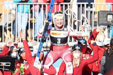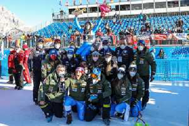 Luca Tedeschi/LMedia - 2022 FIS Ski World Cup - Women Super Giant - alpine ski race January 23 2022 - Olympia slope Cortina Ampezzo, Italy 2022 FIS Ski World Cup - Women Super Giant Photo showing: Elena Curtoni (ITA) celebrated by the team @Luca Tedeschi/LiveMedia AG ALDO LIVERANI SAS
