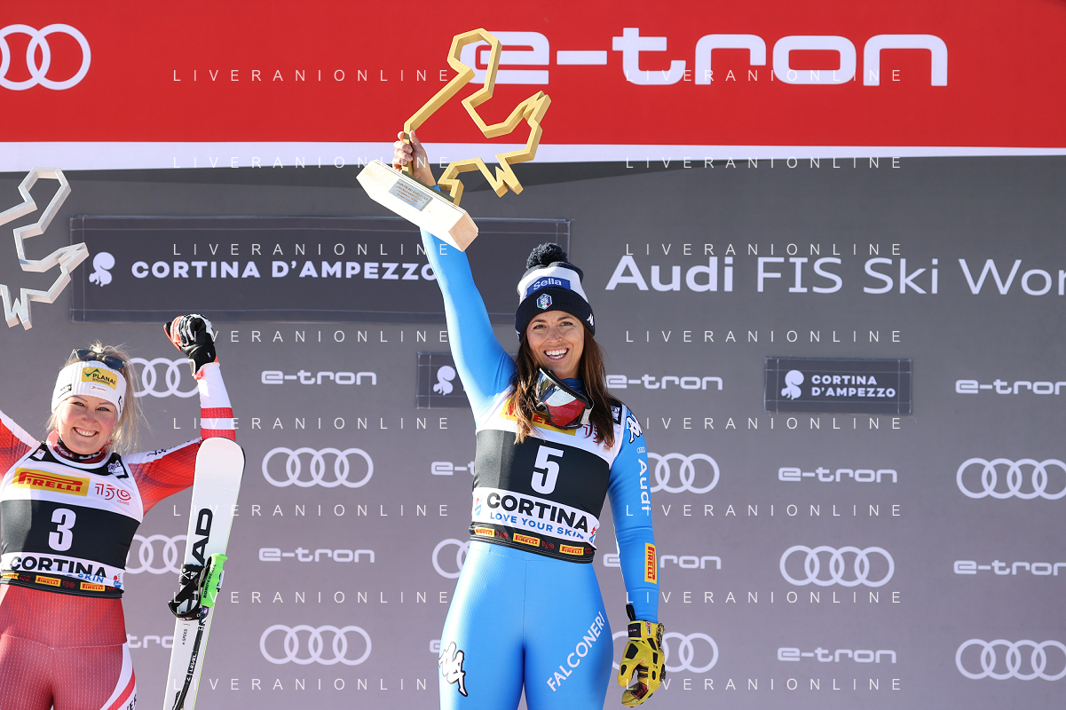Luca Tedeschi/LMedia - 2022 FIS Ski World Cup - Women Super Giant - alpine ski race January 23 2022 - Olympia slope Cortina Ampezzo, Italy 2022 FIS Ski World Cup - Women Super Giant Photo showing: Elena Curtoni (ITA) first, @Luca Tedeschi/LiveMedia AG ALDO LIVERANI SAS