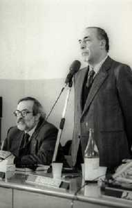 RETROSPETTIVA ANTONIO CARIGLIA POLITICO NELLA FOTO ANTONIO CARIGLIA A RIMINI AL CONGRESSO DEL PARTITO SOCIALISTA DEMOCRATICO PSDI NELL'ANNO 1989 CON GIORGIO BENVENUTO AG ALDO LIVERANI SAS