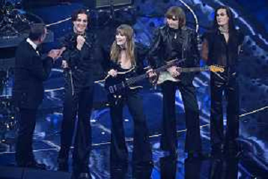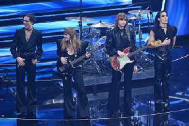 Maneskin, da SX Damiano David voce, Victoria De Angelis basso, Thomas Raggi chitarra ed Ethan Torchio batteria 72mo Festival della Canzone Italiana Sanremo 2022 - Prima Serata Teatro Ariston - Sanremo (IM) 01-02-2022 foto Roberto Garavaglia/ag. Aldo Liverani sas /AGENZIA ALDO LIVERANI SAS