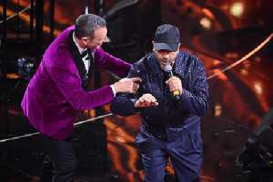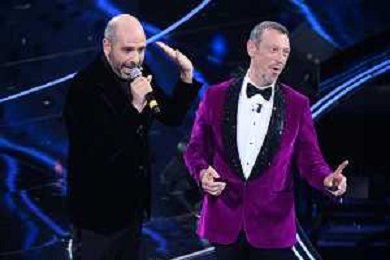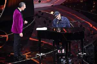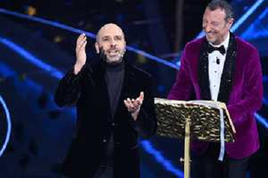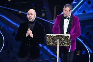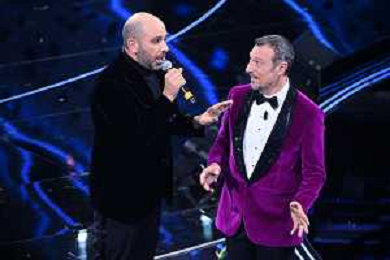 Checco Zalone SX e Amadeus DX 72mo Festival della Canzone Italiana Sanremo 2022 - Seconda Serata Teatro Ariston - Sanremo (IM) 02-02-2022 foto Roberto Garavaglia/ag. Aldo Liverani sas /AGENZIA ALDO LIVERANI SAS