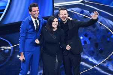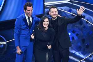 da SX Mika, Laura Pausini e Alessandro Cattelan 72mo Festival della Canzone Italiana Sanremo 2022 - Seconda Serata Teatro Ariston - Sanremo (IM) 02-02-2022 foto Roberto Garavaglia/ag. Aldo Liverani sas /AGENZIA ALDO LIVERANI SAS