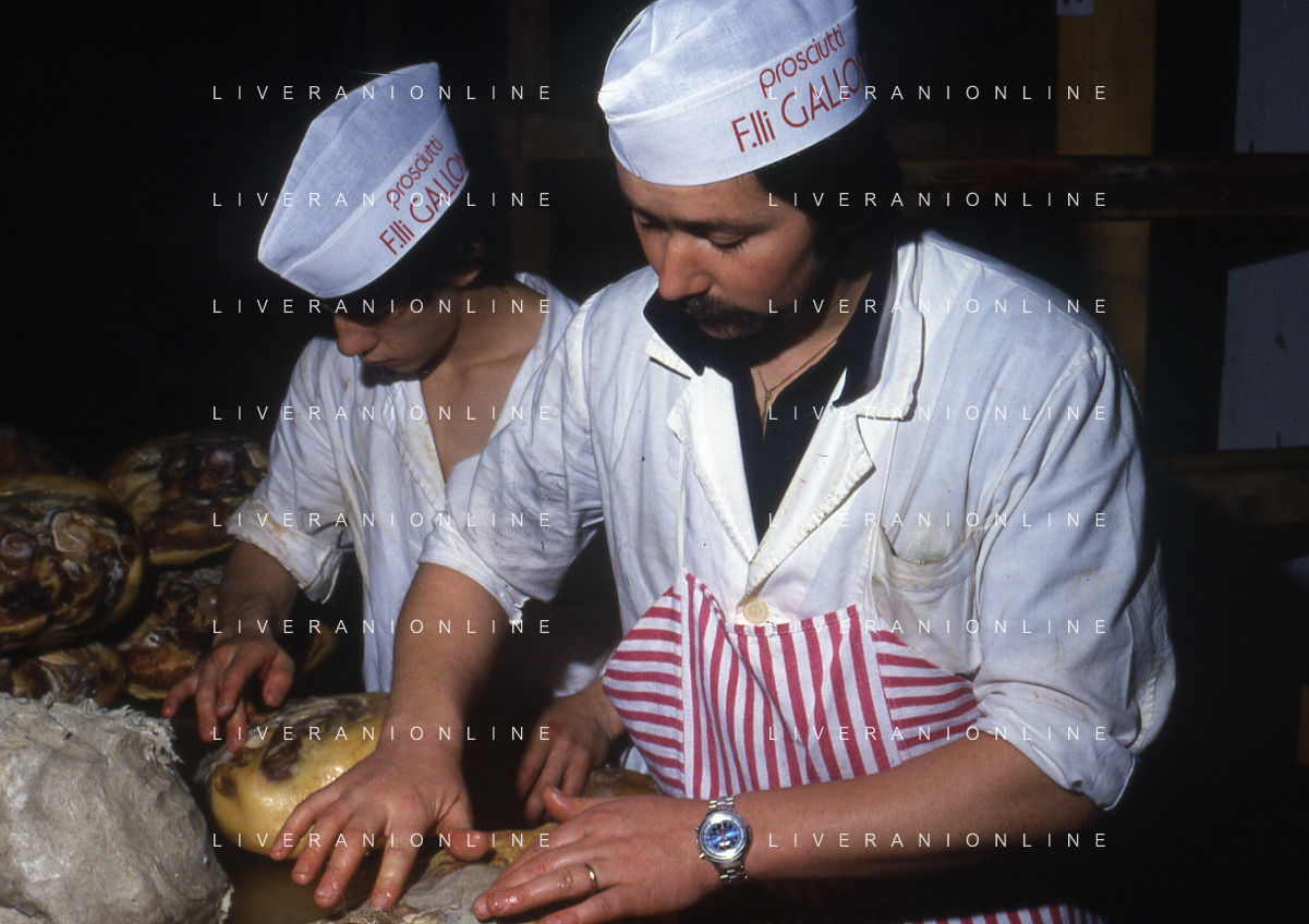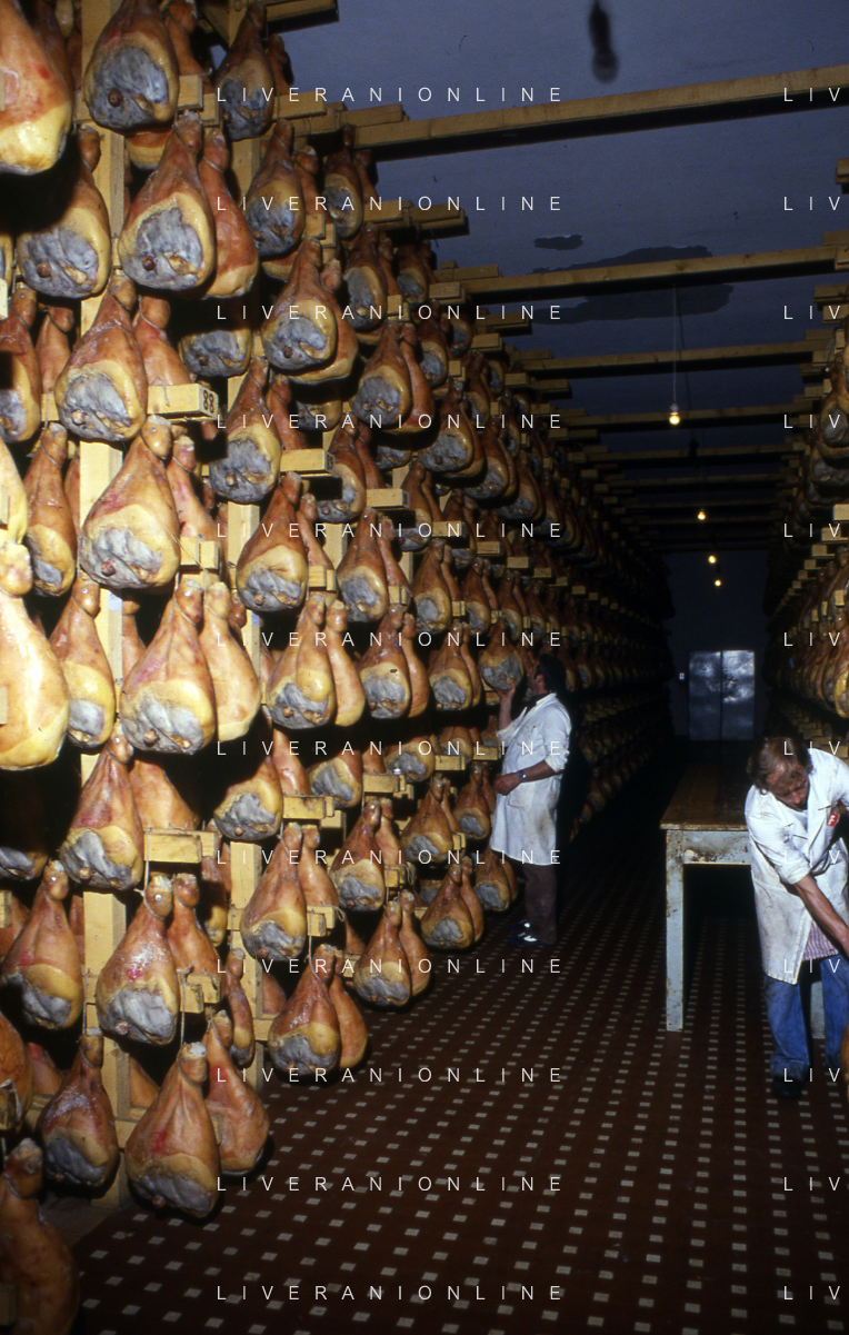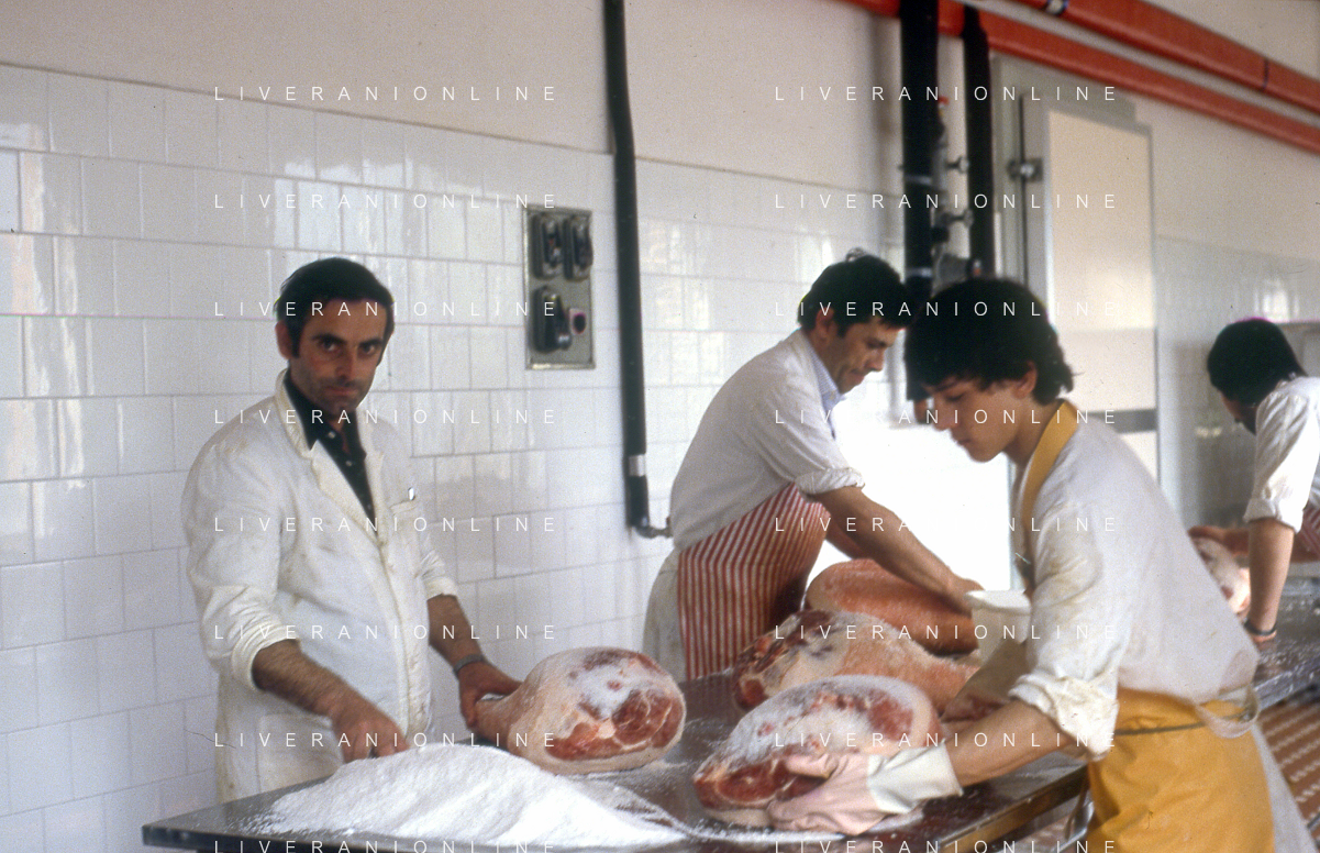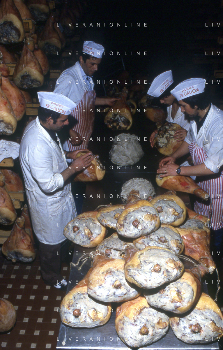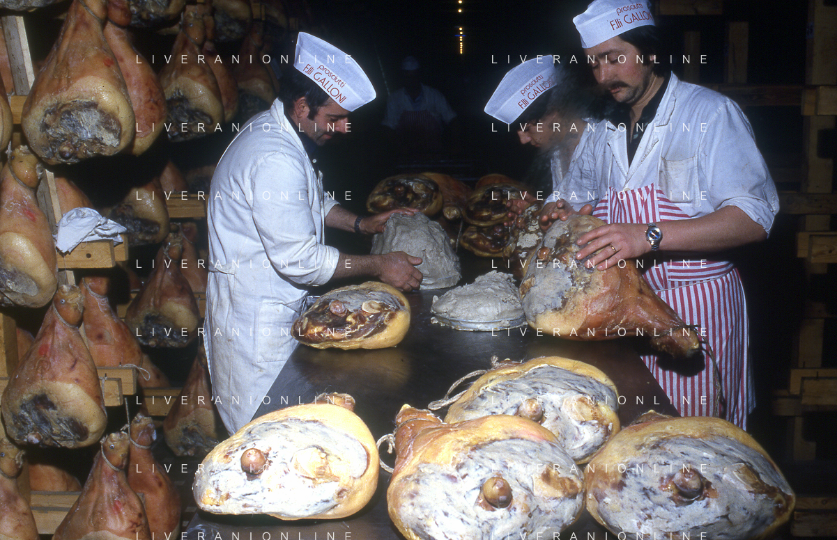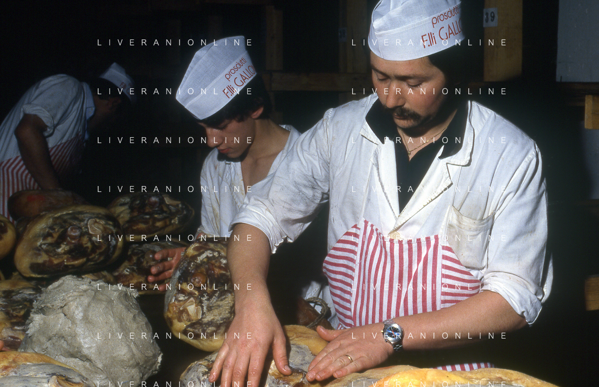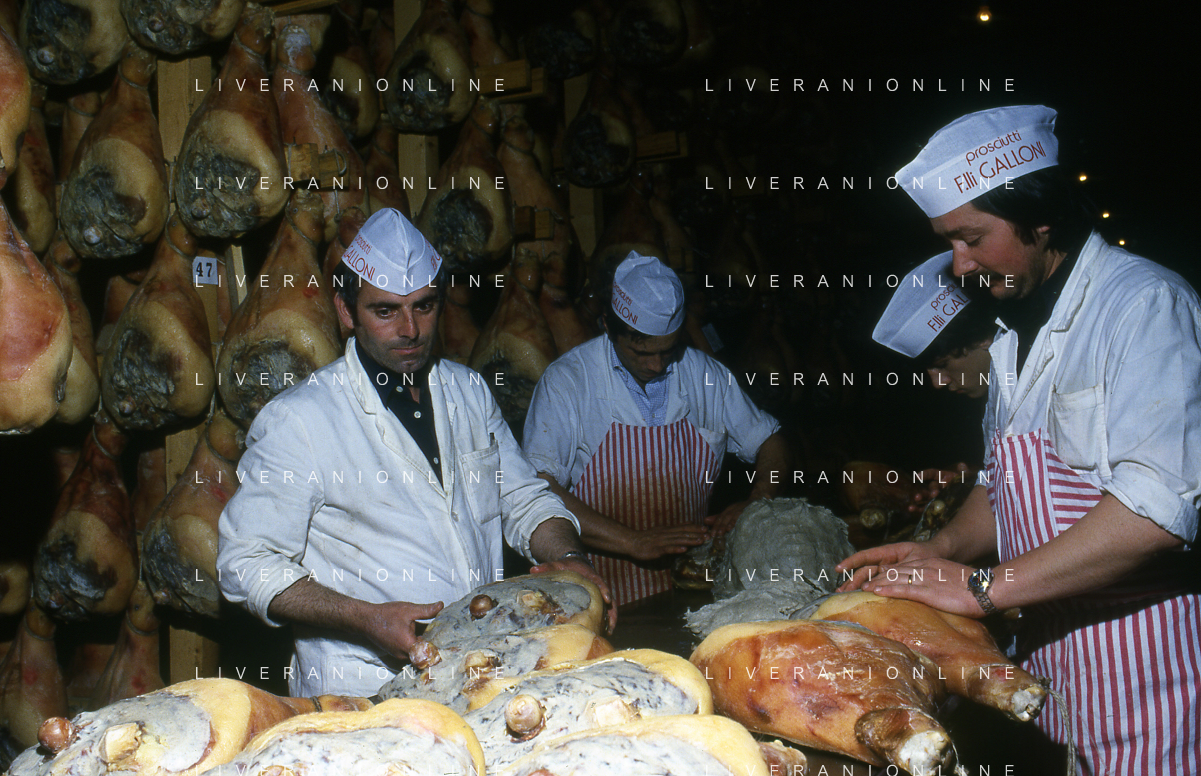 1990 LANGHIRANO SALUMIFICIO FRATELLI GALLONI NELLA FOTO LA LAVORAZIONE DEL PROSCIUTTO CRUDO NEL SALUMIFICIO DEI FRATELLI GALLONI A LANGHIRANO NELL'ANNO 1982 AG ALDO LIVERANI SAS