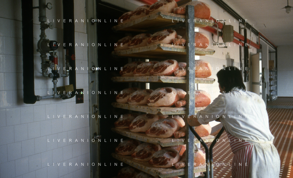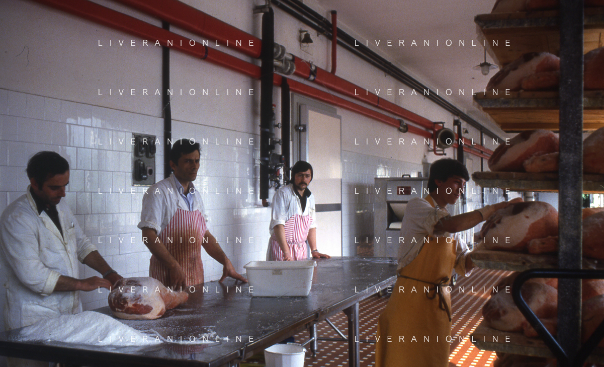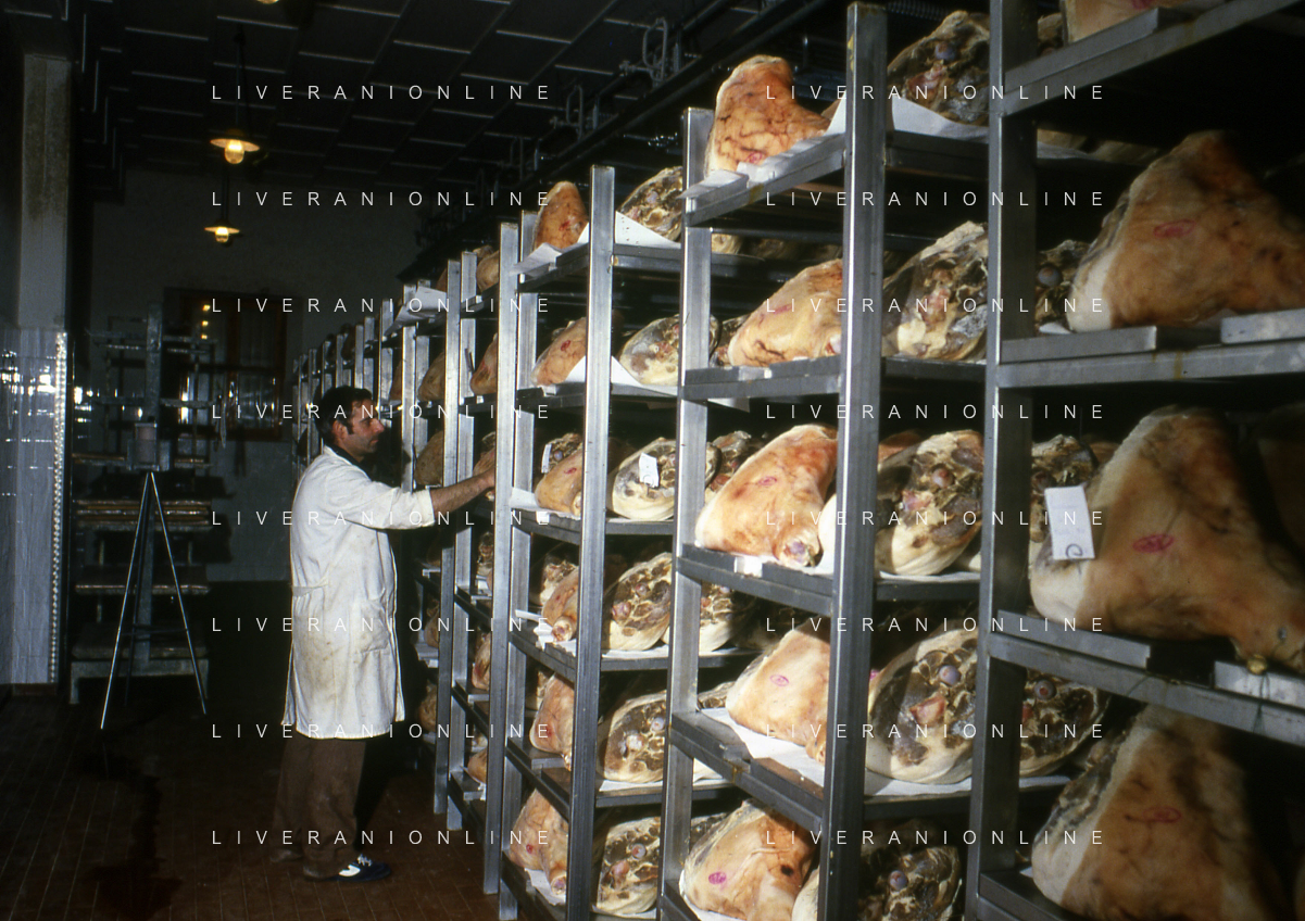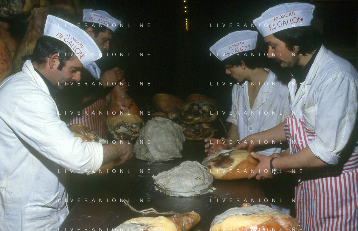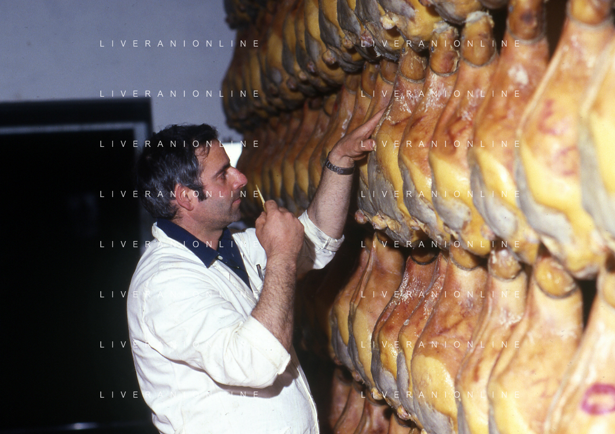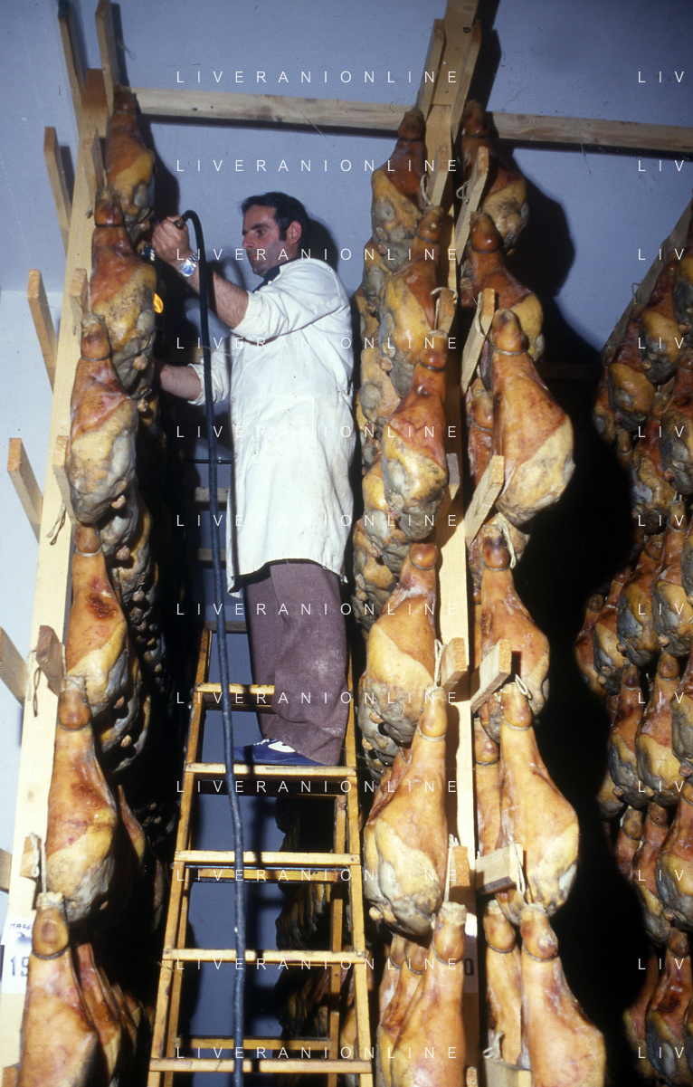 1990 LANGHIRANO SALUMIFICIO FRATELLI GALLONI NELLA FOTO LA LAVORAZIONE DEL PROSCIUTTO CRUDO NEL SALUMIFICIO DEI FRATELLI GALLONI A LANGHIRANO NELL'ANNO 1982 AG ALDO LIVERANI SAS