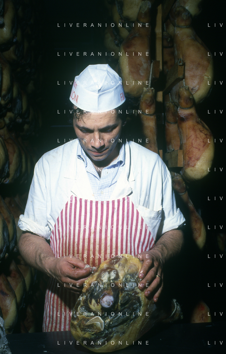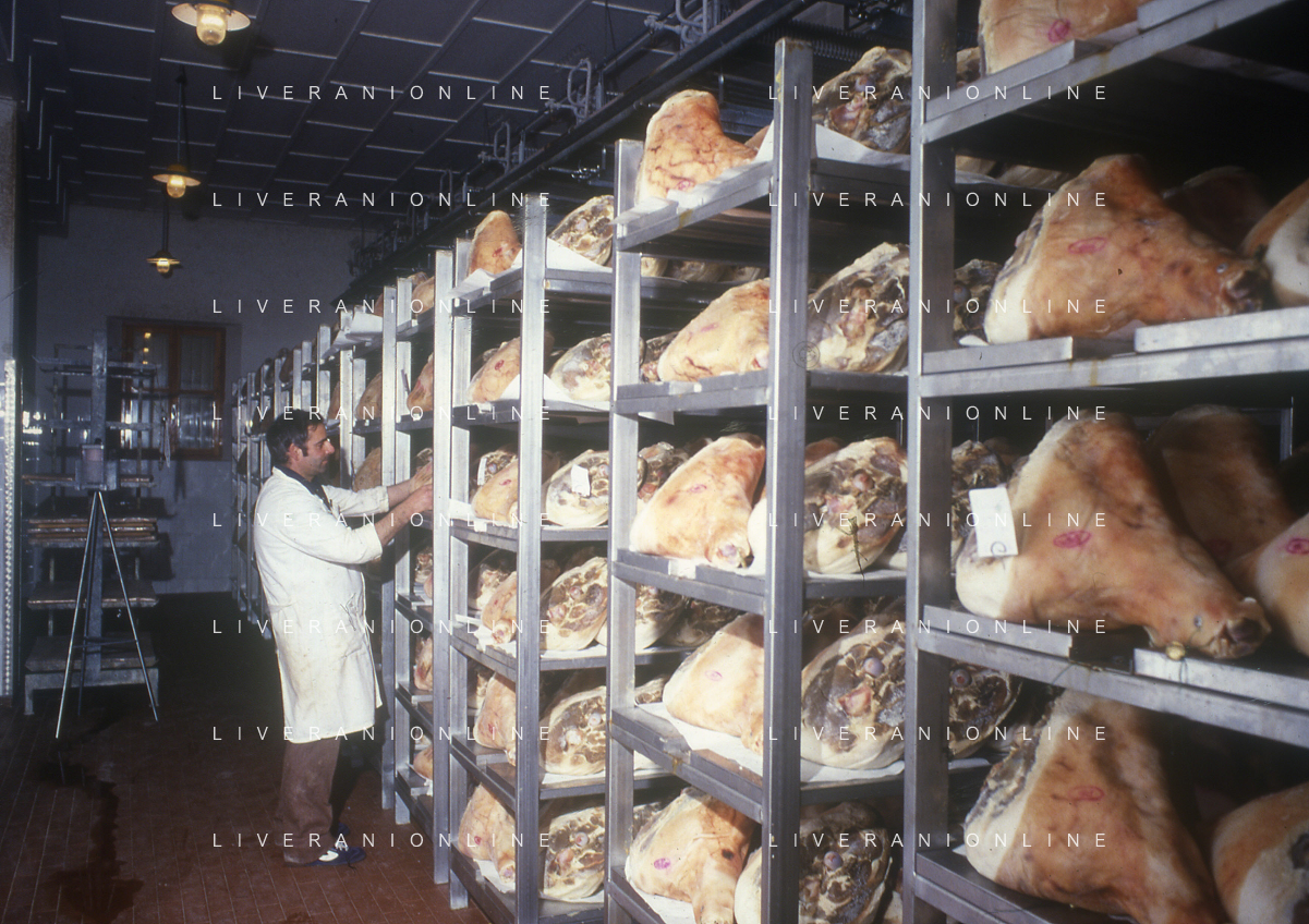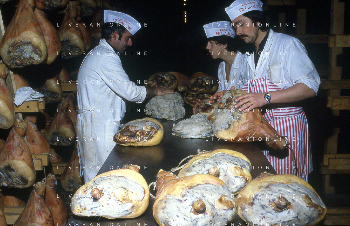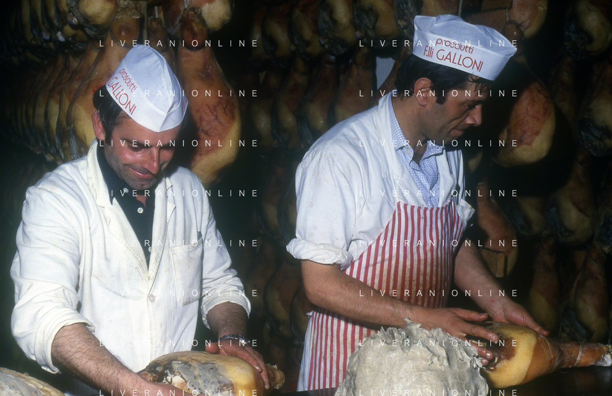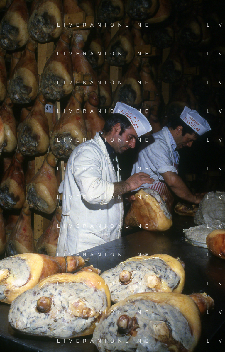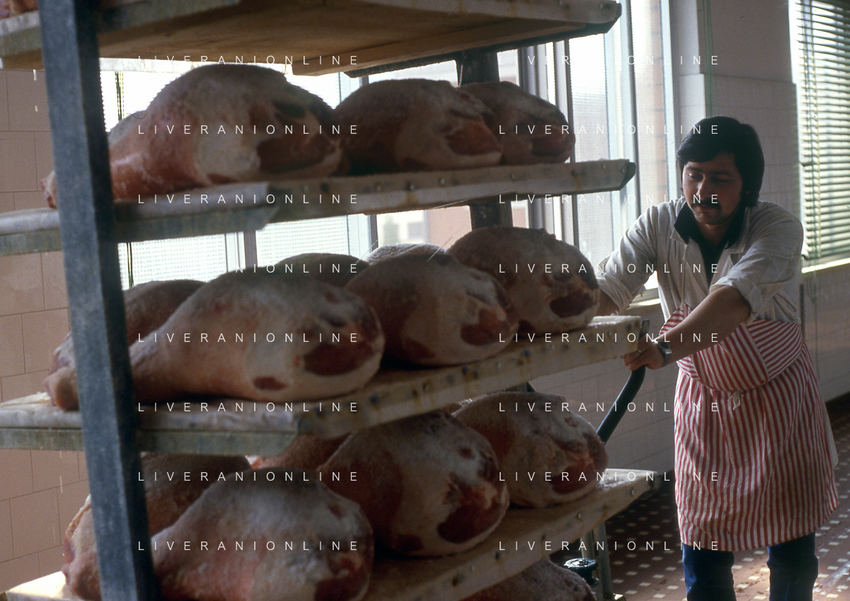 1990 LANGHIRANO SALUMIFICIO FRATELLI GALLONI NELLA FOTO LA LAVORAZIONE DEL PROSCIUTTO CRUDO NEL SALUMIFICIO DEI FRATELLI GALLONI A LANGHIRANO NELL'ANNO 1982 AG ALDO LIVERANI SAS