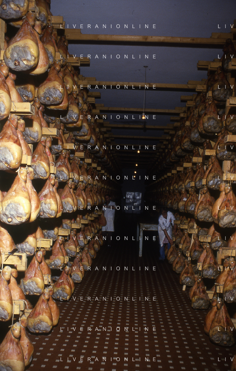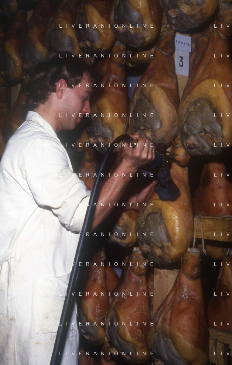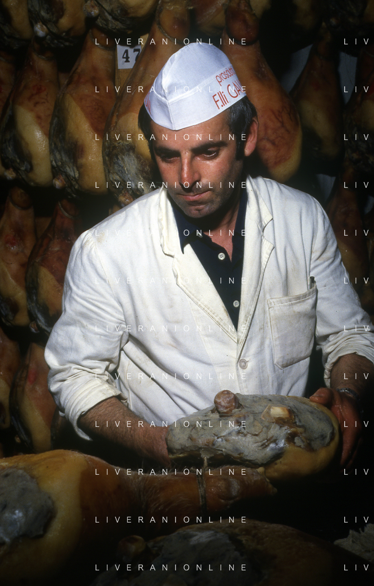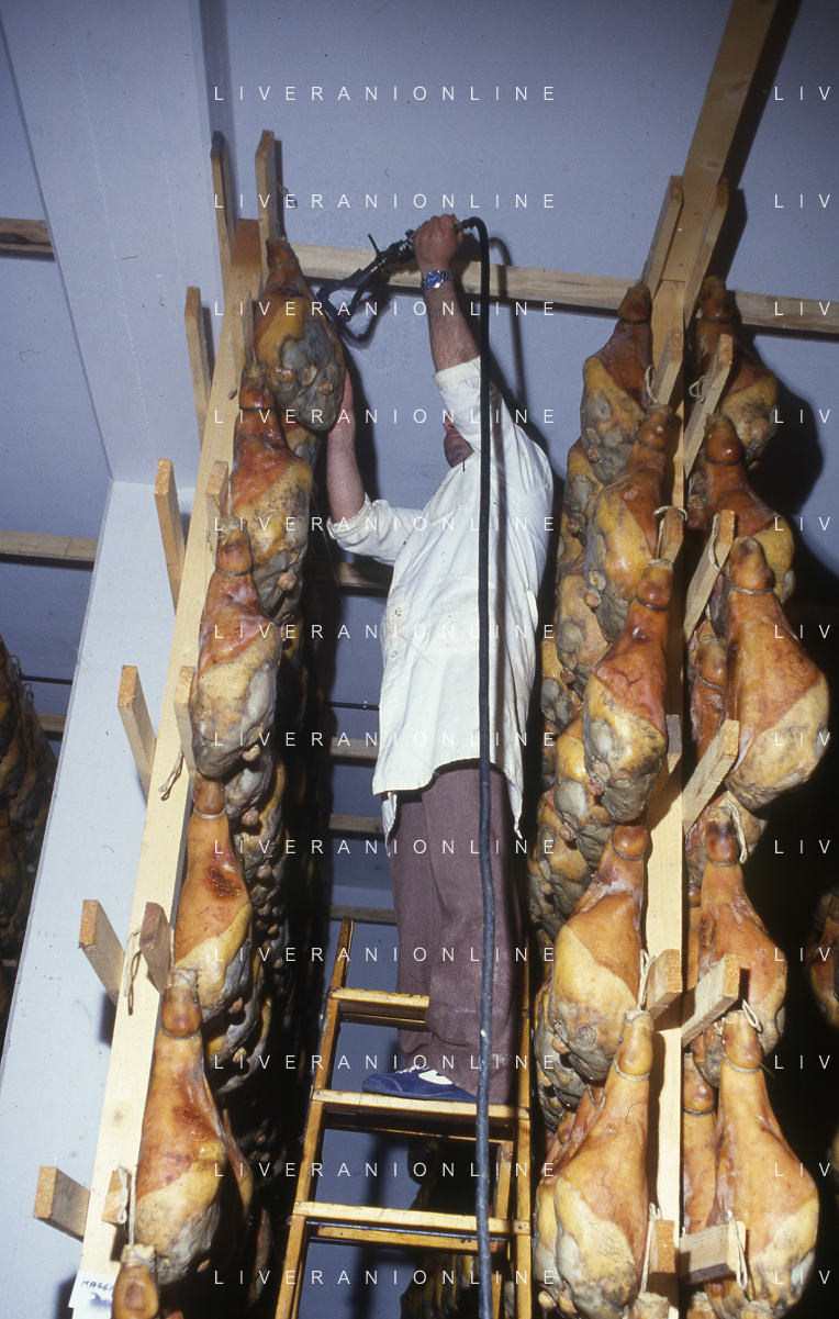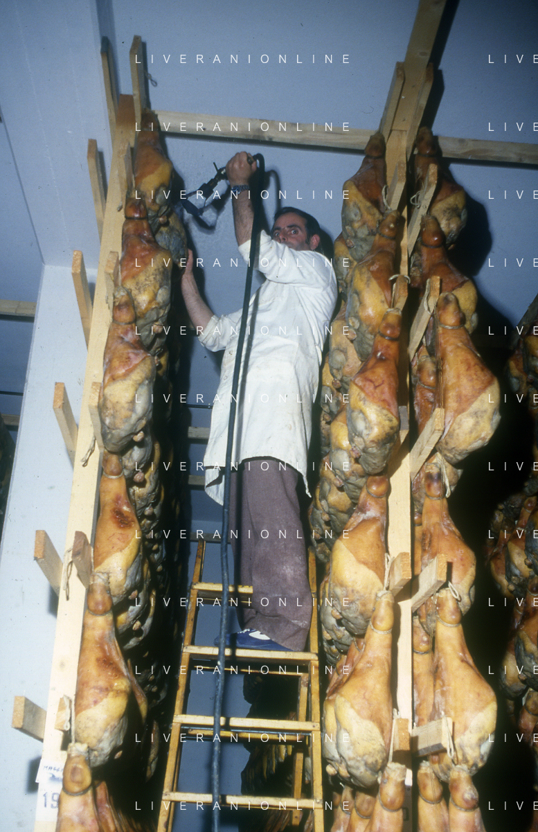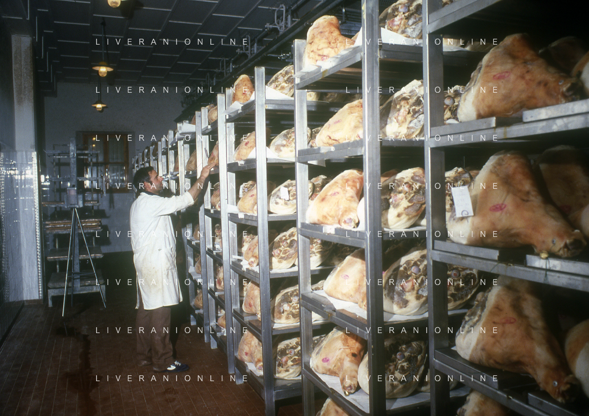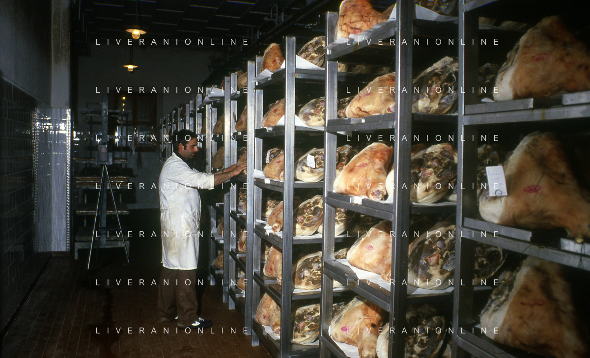 1990 LANGHIRANO SALUMIFICIO FRATELLI GALLONI NELLA FOTO LA LAVORAZIONE DEL PROSCIUTTO CRUDO NEL SALUMIFICIO DEI FRATELLI GALLONI A LANGHIRANO NELL'ANNO 1982 AG ALDO LIVERANI SAS