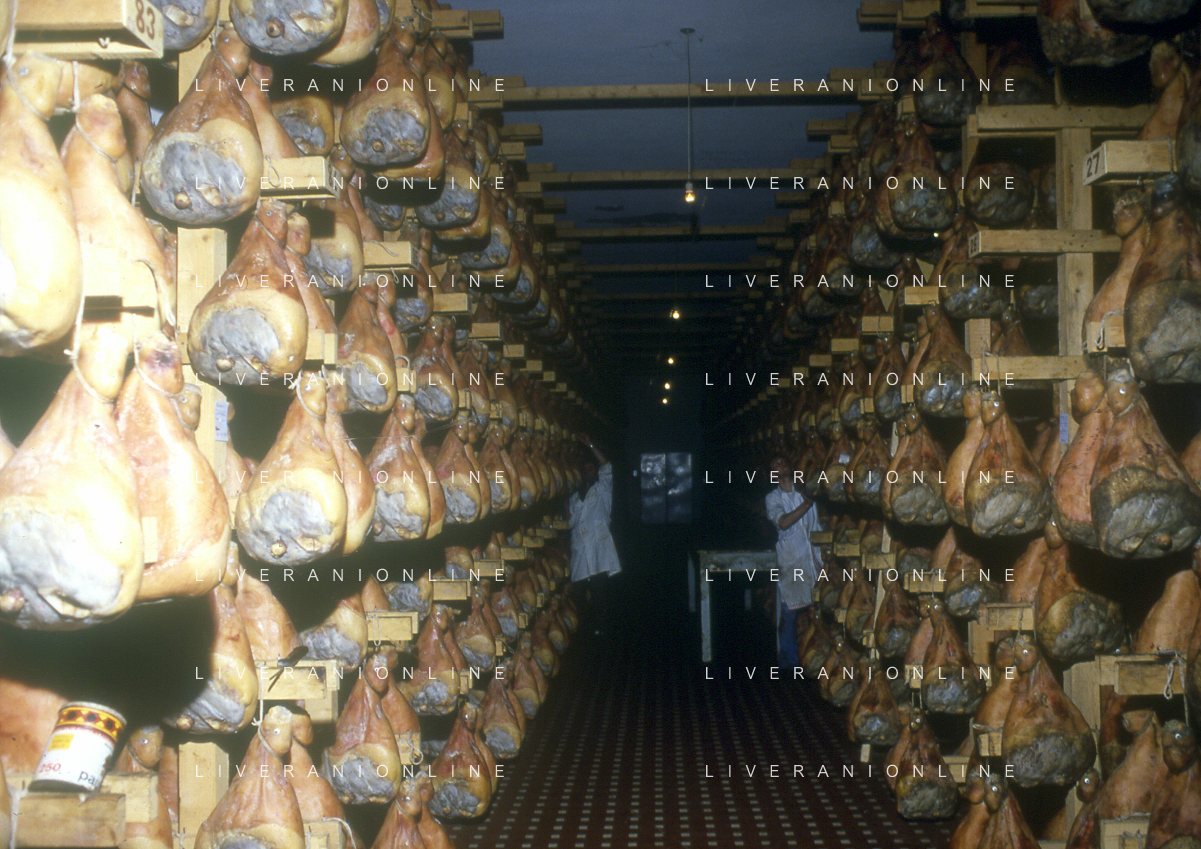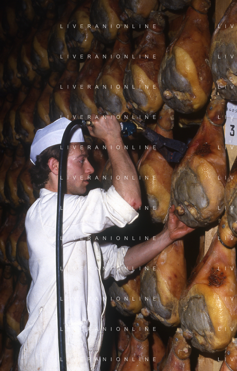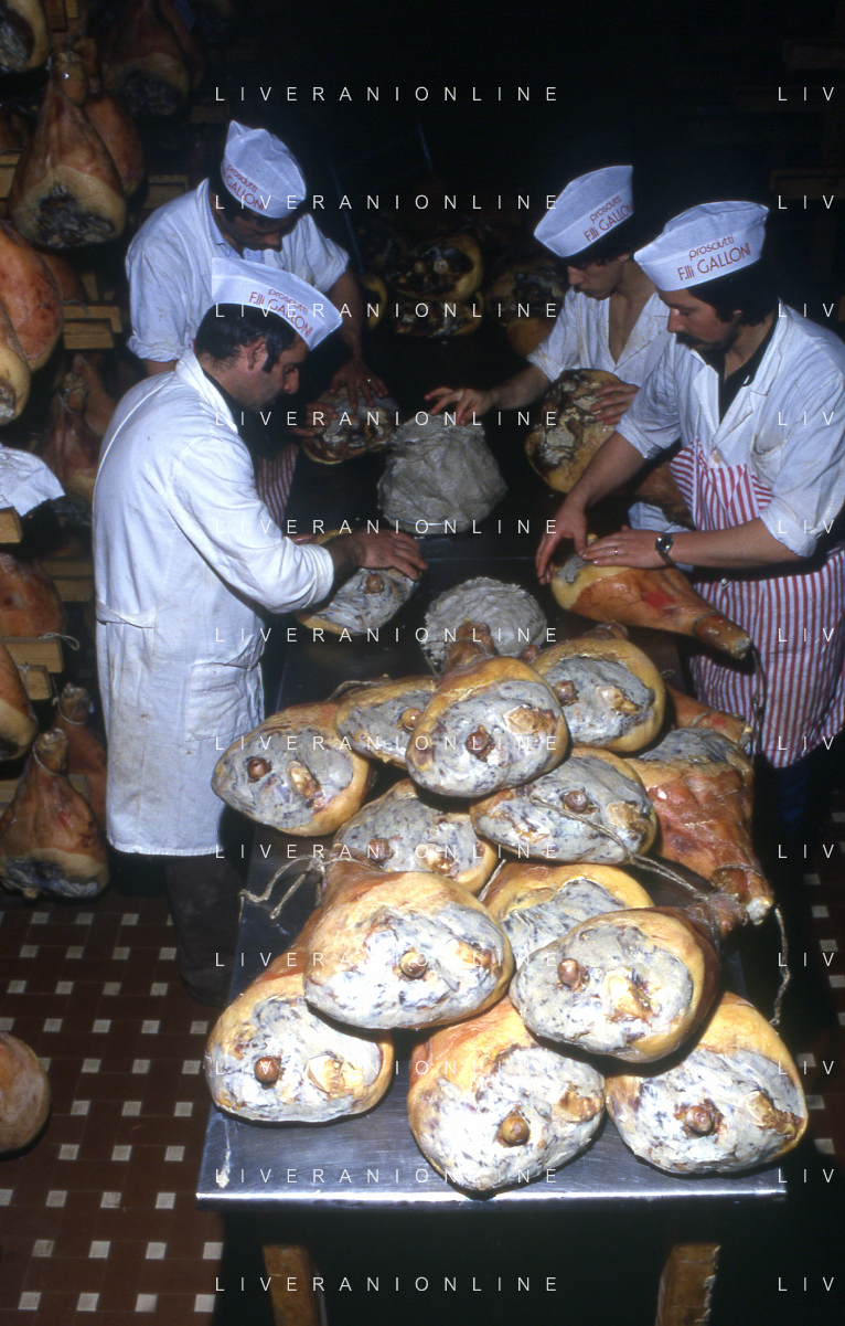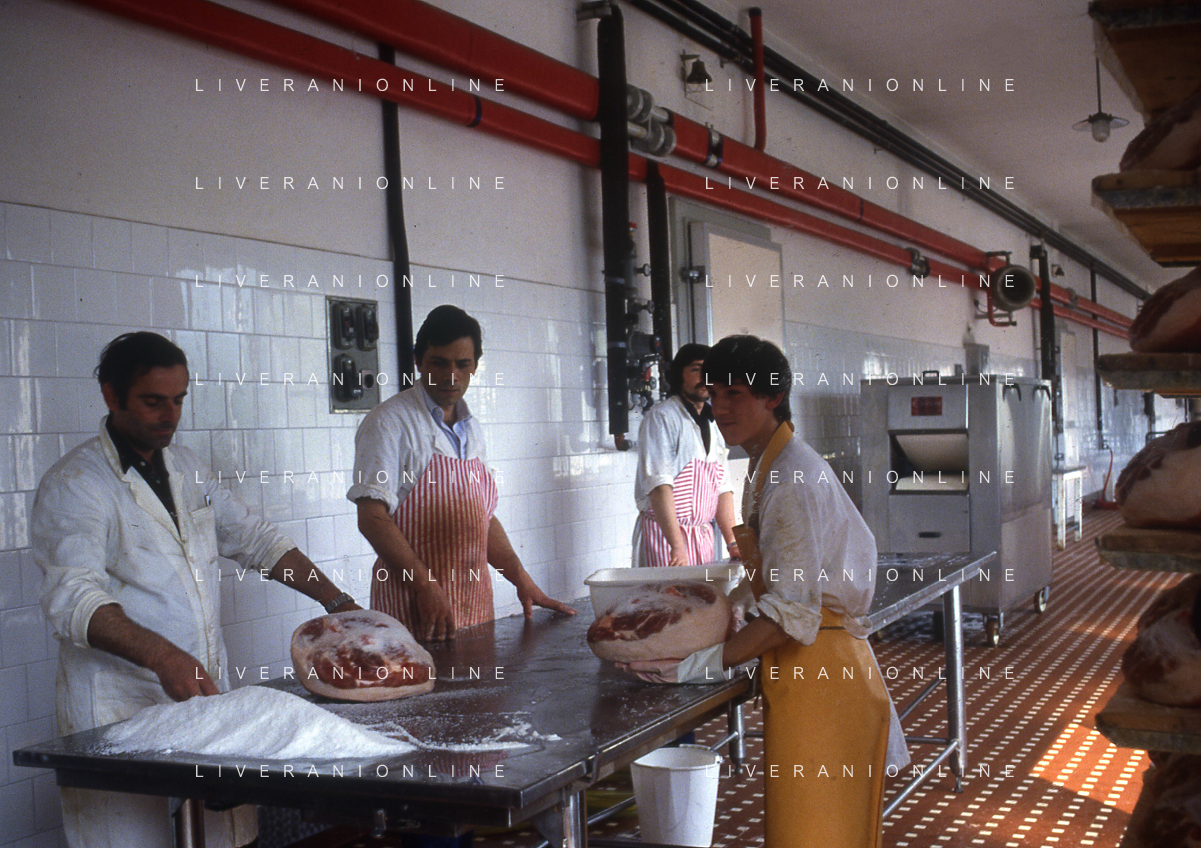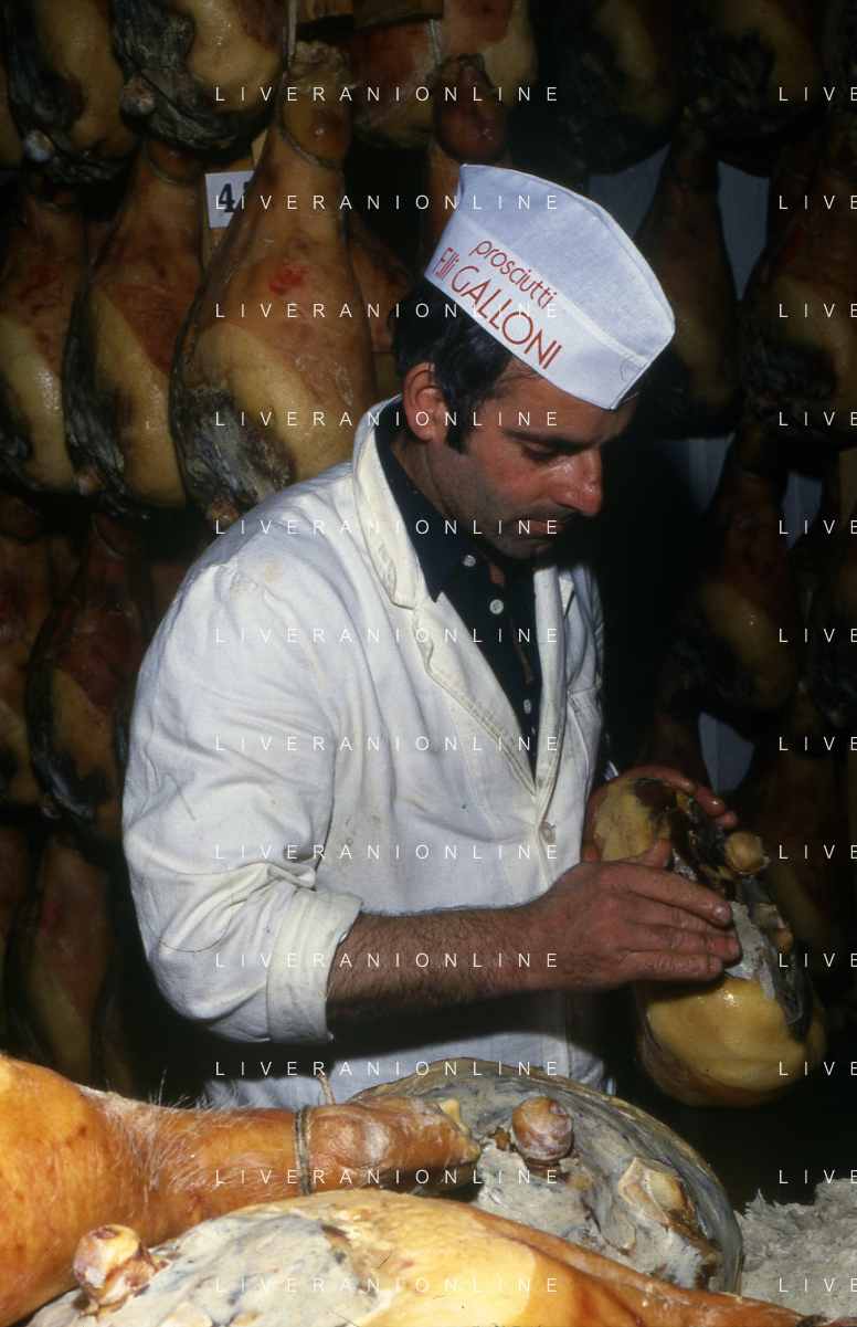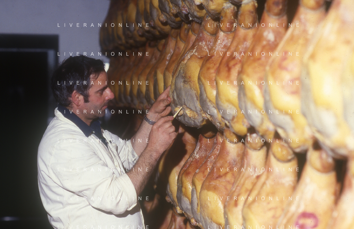 1990 LANGHIRANO SALUMIFICIO FRATELLI GALLONI NELLA FOTO LA LAVORAZIONE DEL PROSCIUTTO CRUDO NEL SALUMIFICIO DEI FRATELLI GALLONI A LANGHIRANO NELL'ANNO 1982 AG ALDO LIVERANI SAS