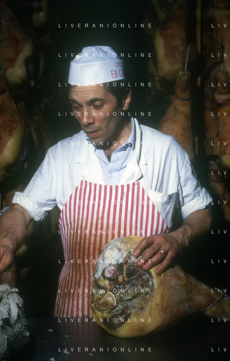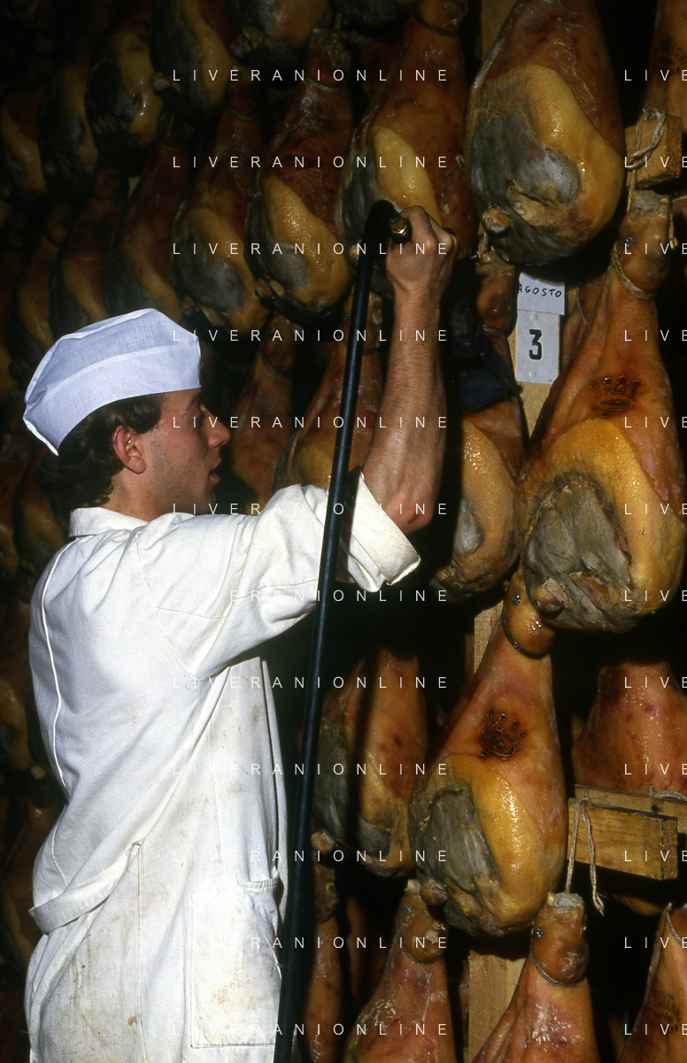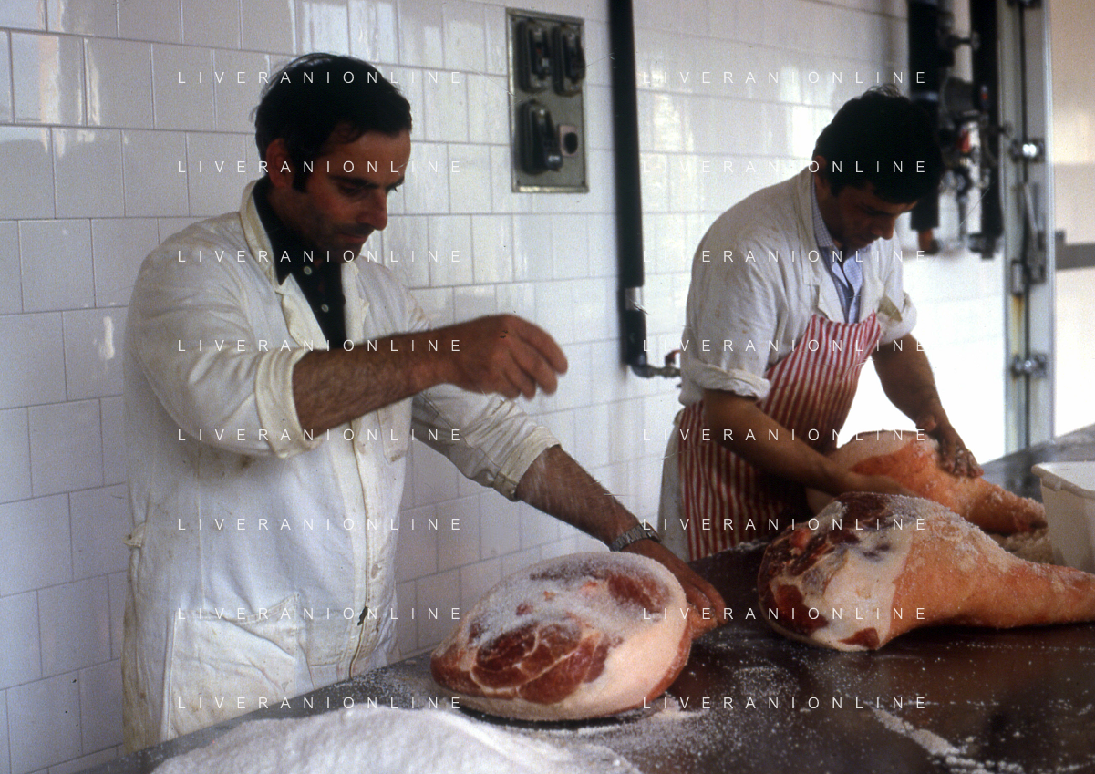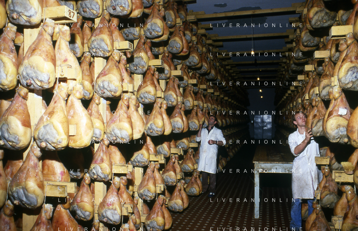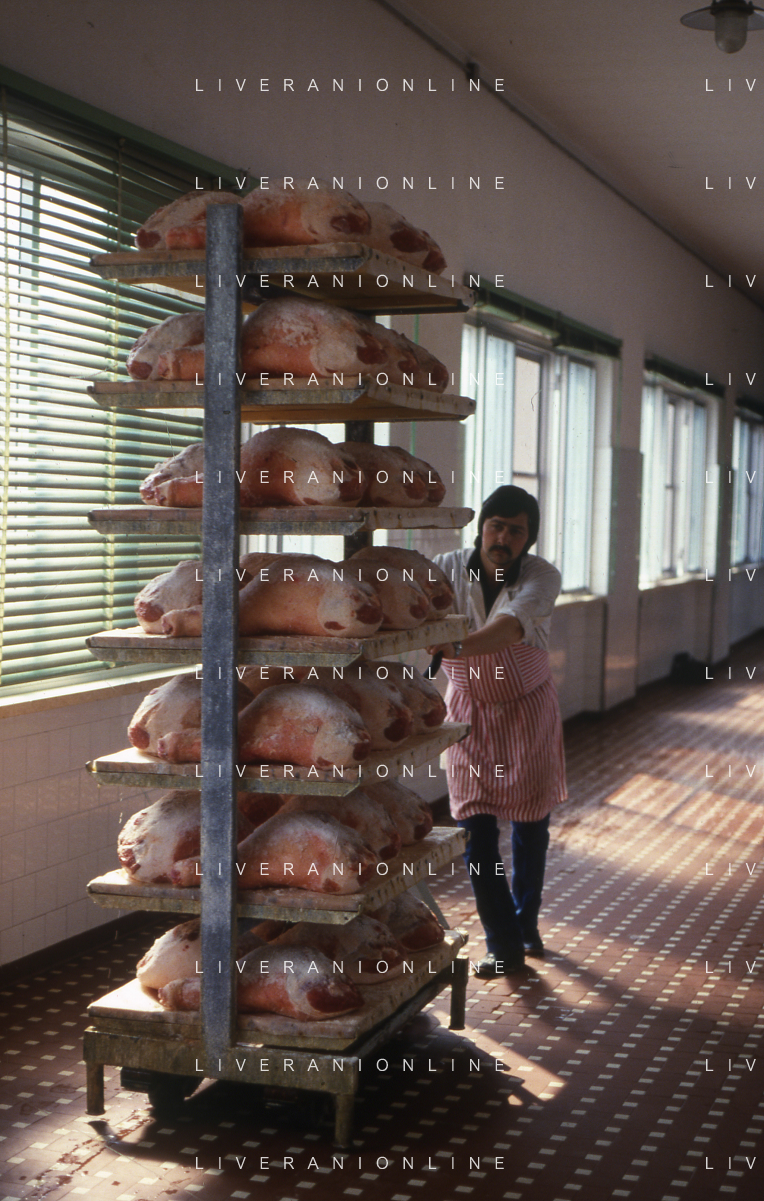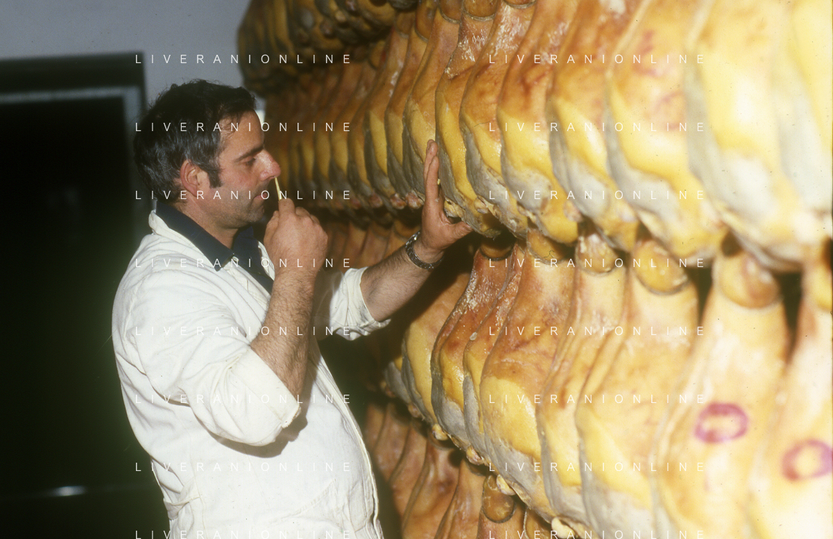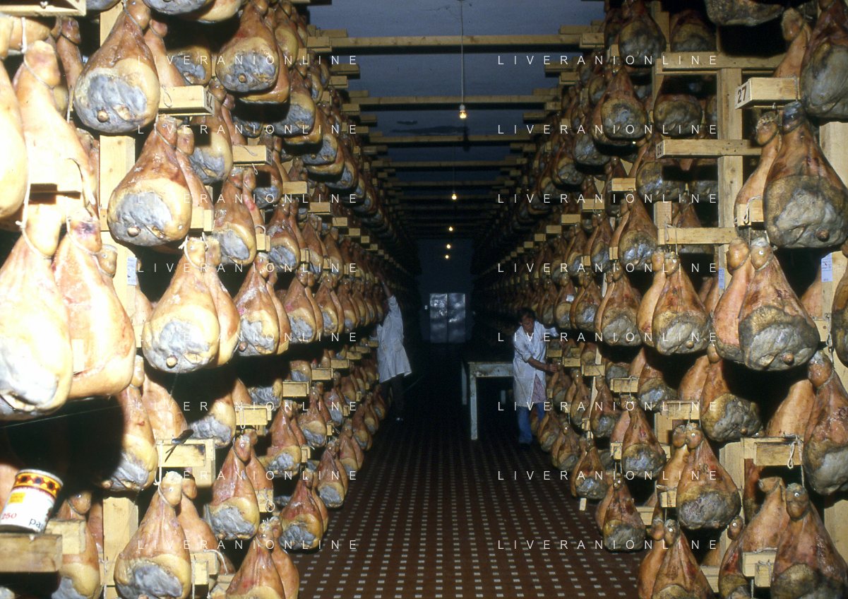 1990 LANGHIRANO SALUMIFICIO FRATELLI GALLONI NELLA FOTO LA LAVORAZIONE DEL PROSCIUTTO CRUDO NEL SALUMIFICIO DEI FRATELLI GALLONI A LANGHIRANO NELL'ANNO 1982 AG ALDO LIVERANI SAS