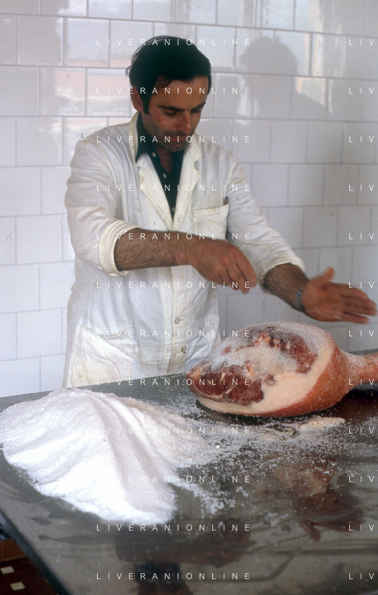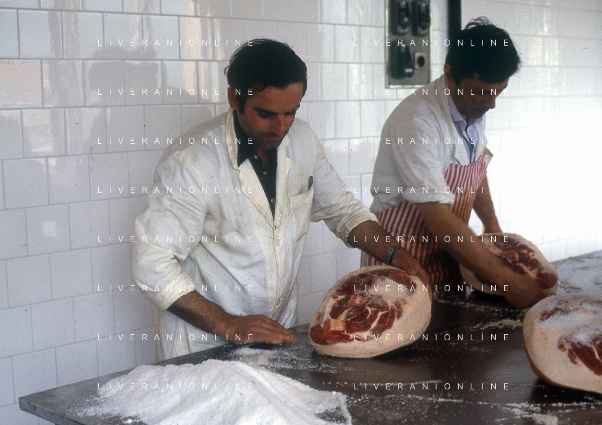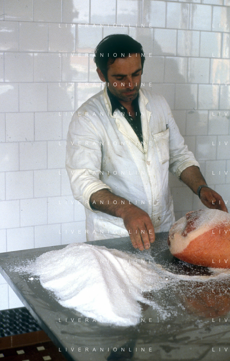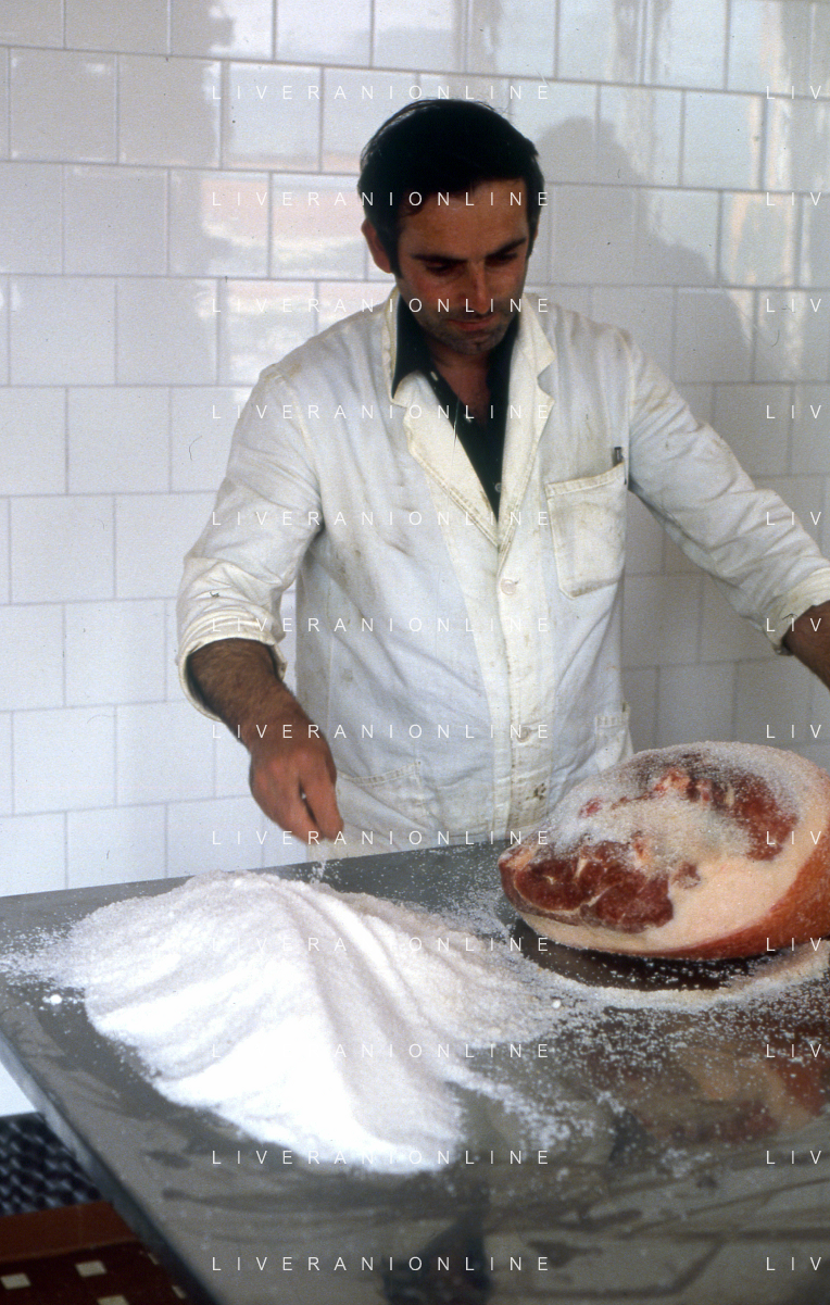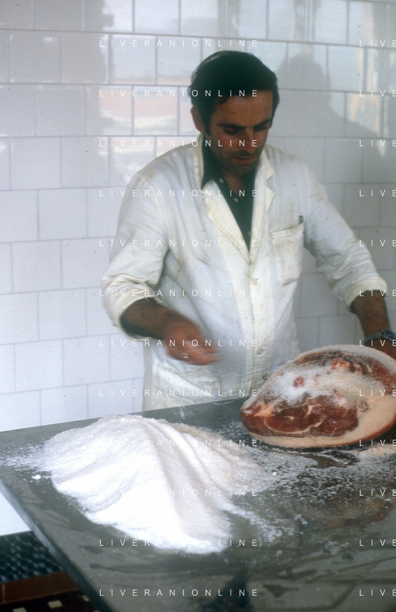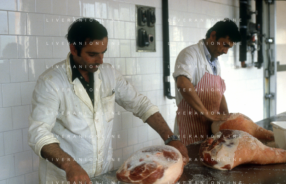 1990 LANGHIRANO SALUMIFICIO FRATELLI GALLONI NELLA FOTO LA LAVORAZIONE DEL PROSCIUTTO CRUDO NEL SALUMIFICIO DEI FRATELLI GALLONI A LANGHIRANO NELL'ANNO 1982 AG ALDO LIVERANI SAS