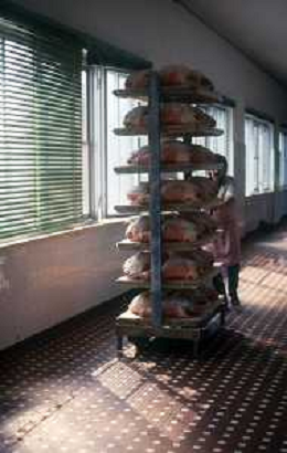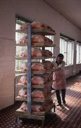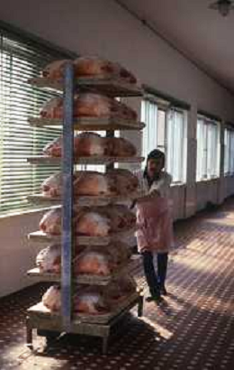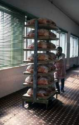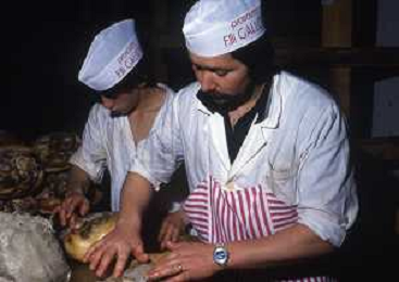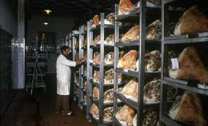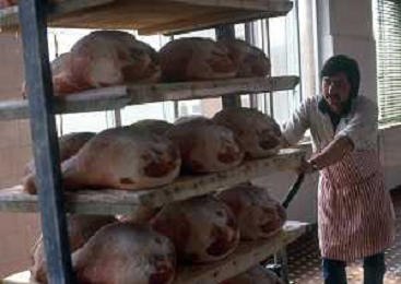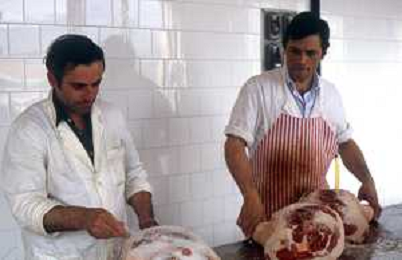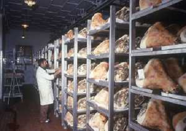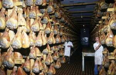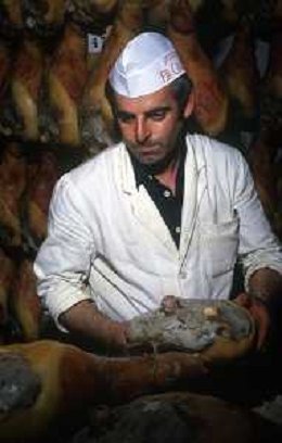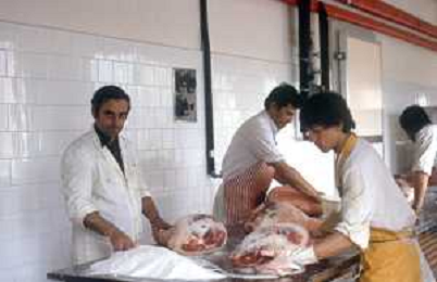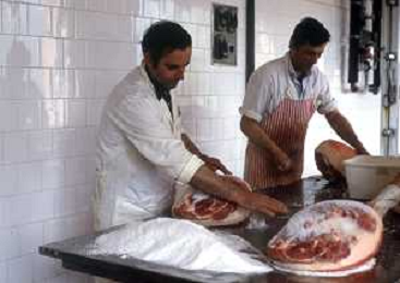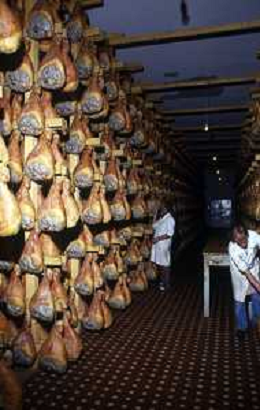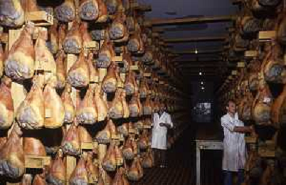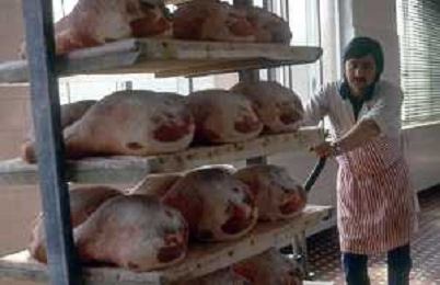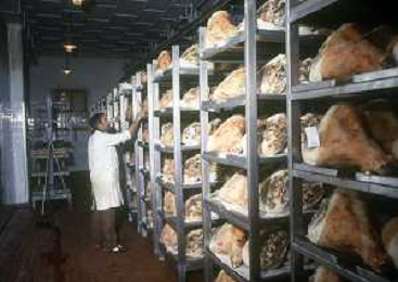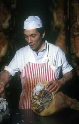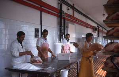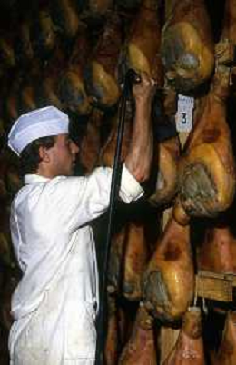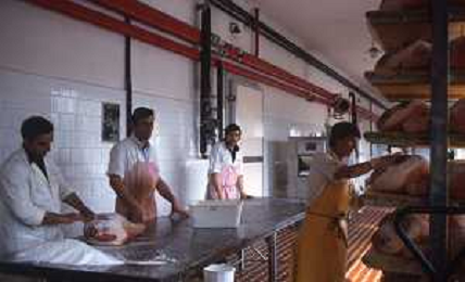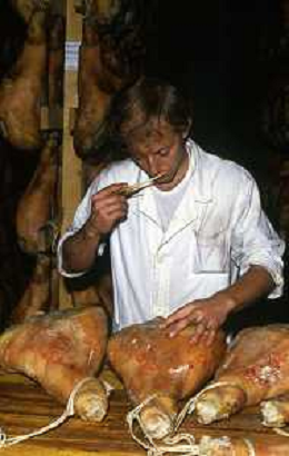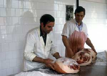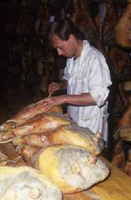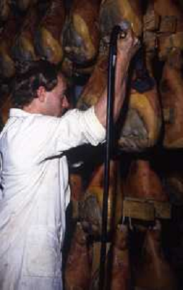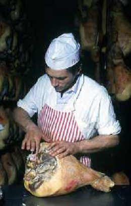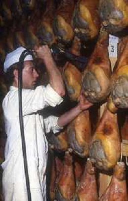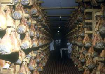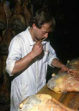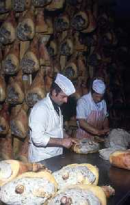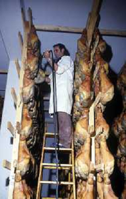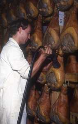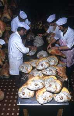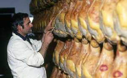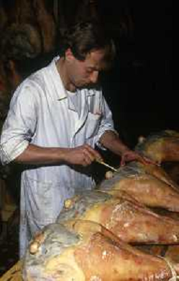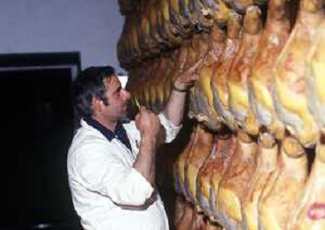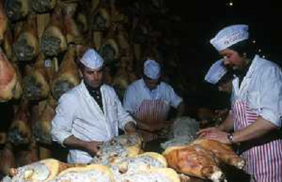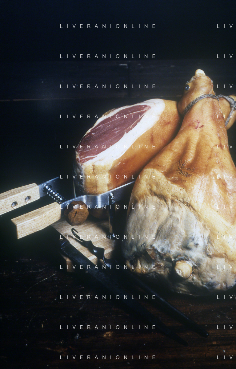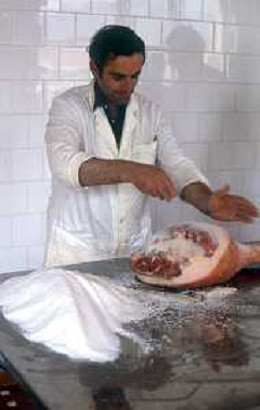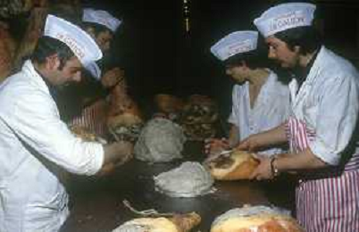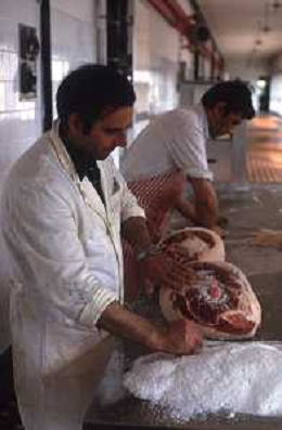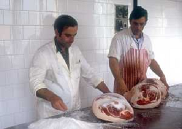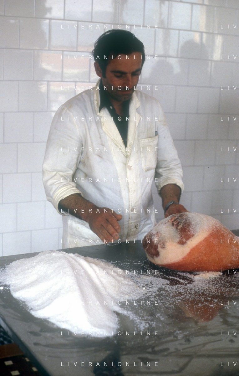 1990 LANGHIRANO SALUMIFICIO FRATELLI GALLONI NELLA FOTO LA LAVORAZIONE DEL PROSCIUTTO CRUDO NEL SALUMIFICIO DEI FRATELLI GALLONI A LANGHIRANO NELL'ANNO 1982 AG ALDO LIVERANI SAS
