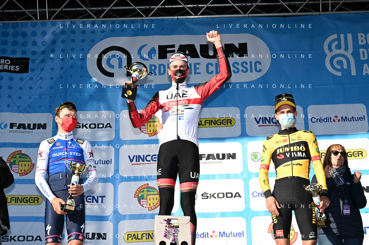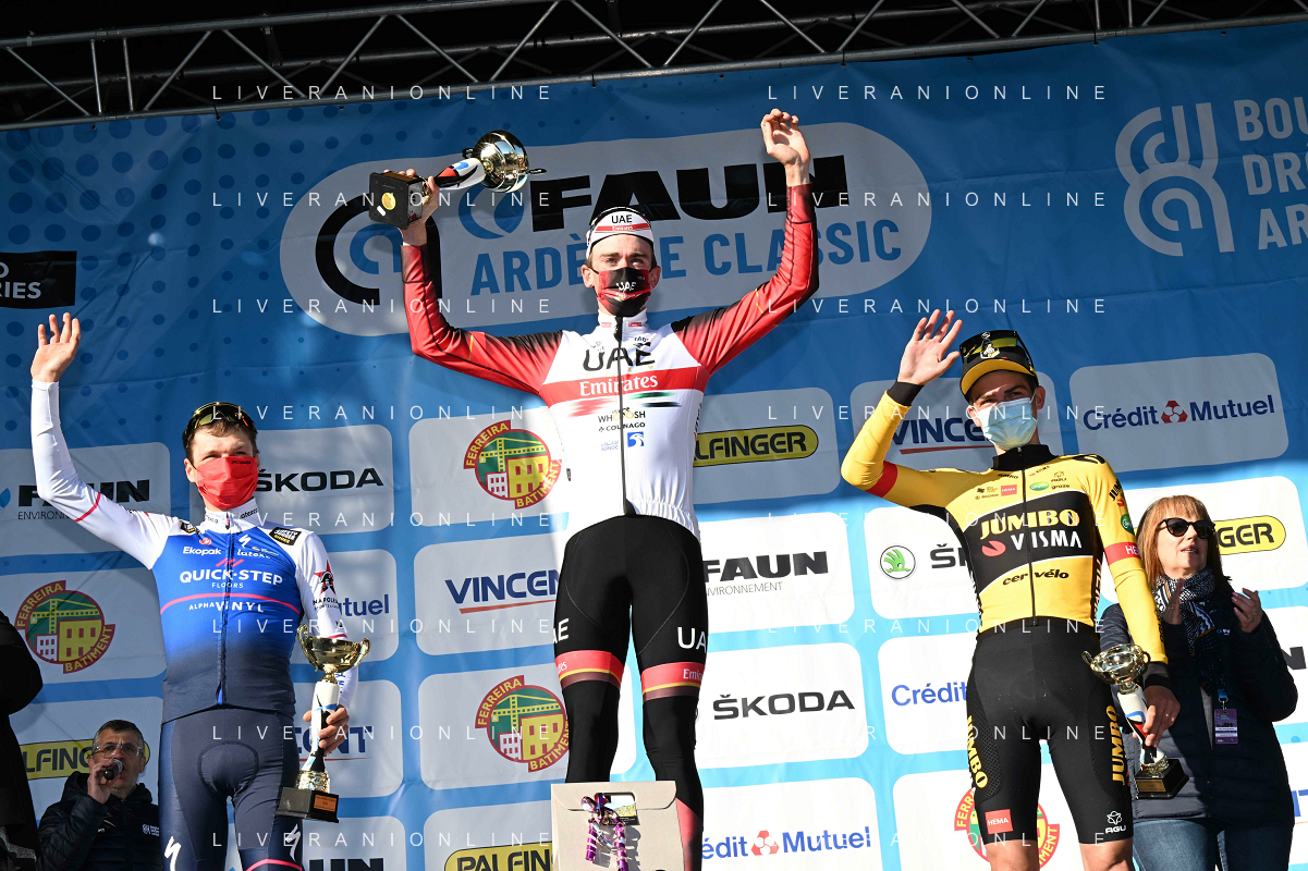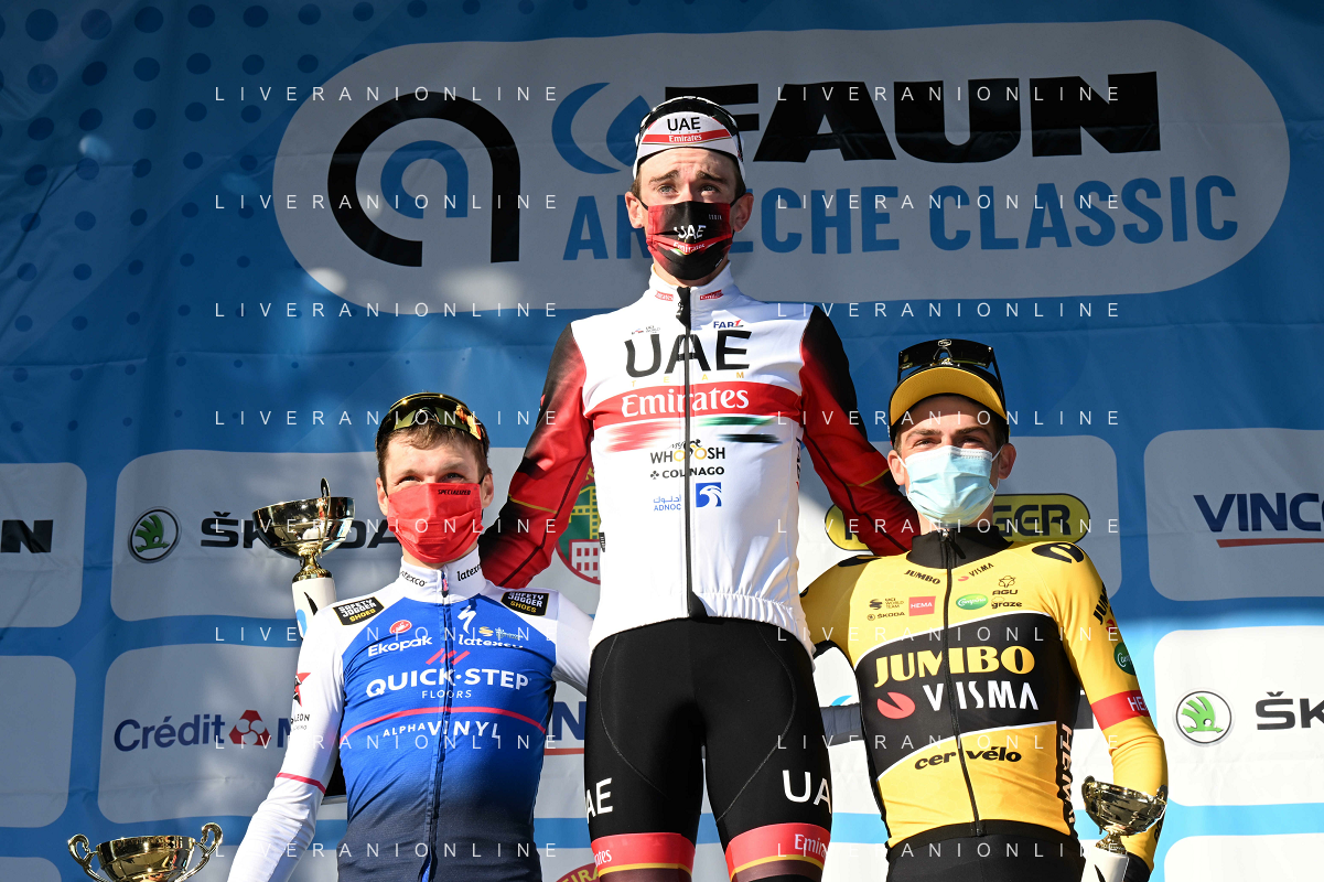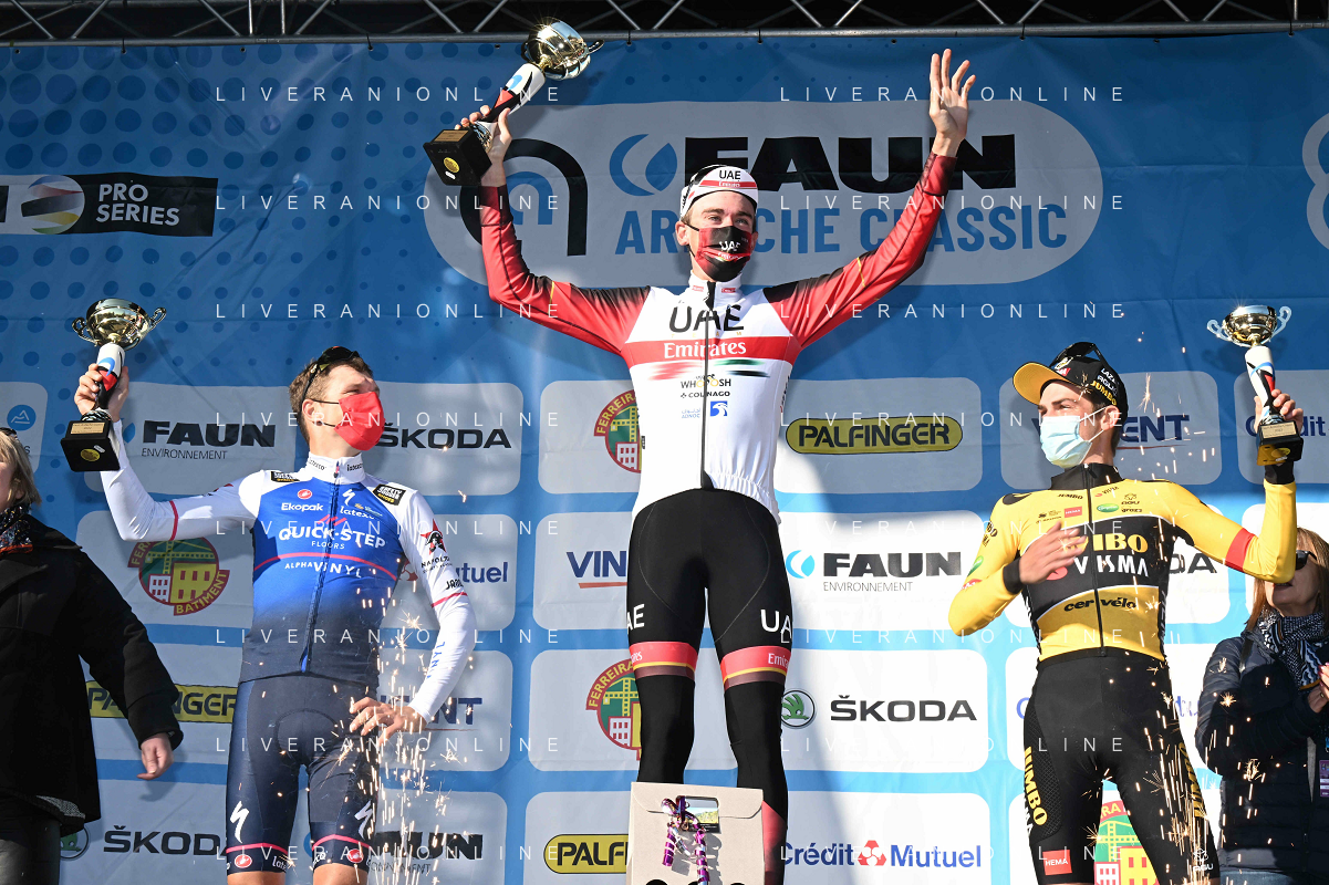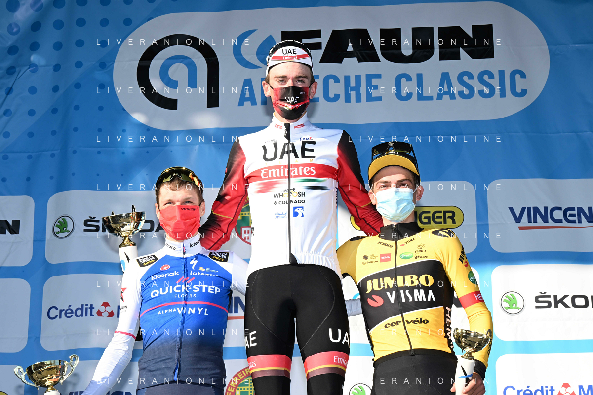26-02-2022 Faun Ardeche Classic; 2022, Uae Emirates; 2022, Quick Step - Alpha Vinyl; 2022, Jumbo - Visma; Mcnulty, Brandon; Vansevenant, Mauri; Kuss, Sepp; Guilherand Granges; ©SIROTTI/AGENZIA ALDO LIVERANI SAS