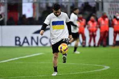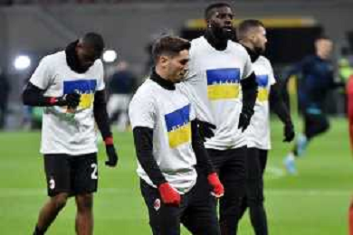 i giocatori del Milan durante il riscaldamento con una maglietta per la pace, contro la guerra in ucraina - Milan vs Inter Coppa Italia Frecciarossa - semifinale gara di andata Milano 01-03-2022 Stadio Giuseppe Meazza - San Siro foto Roberto Garavaglia/ag. Aldo Liverani sas /AGENZIA ALDO LIVERANI SAS