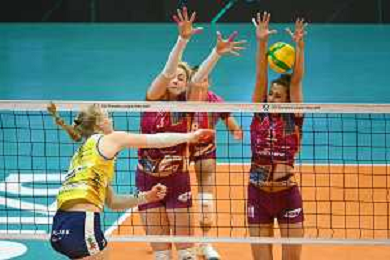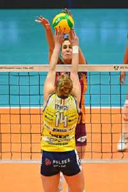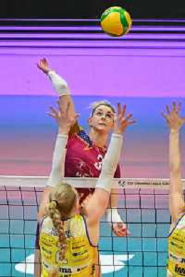 © TVRG Kathryn Rose Plummer (Conegliano) contro il muro di Magdalena Stysiak (Monza) SX e Anna Danesi (Monza) DX Vero Volley Monza vs Antonio Carraro Imoco Volley Conegliano CEV Champions League - quarti di finale gara di andata Monza 09-03-2022 Arena di Monza foto Roberto Garavaglia/ag. Aldo Liverani sas/AGENZIA ALDO LIVERANI SAS