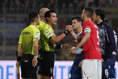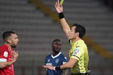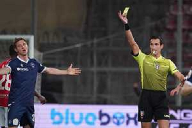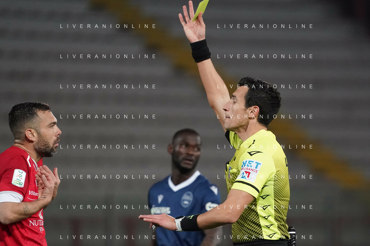 Loris Cerquiglini/LMedia - AC Perugia vs SPAL - Italian soccer Serie B match 2021/2022 March 16 2022 - Stadio Renato Curi Perugia, Italy AC Perugia vs SPAL Photo showing: a. di martino (referee sez. teramo) vido luca (n.28 spal) cautioned @Loris Cerquiglini/LiveMedia /AGENZIA ALDO LIVERANI SAS