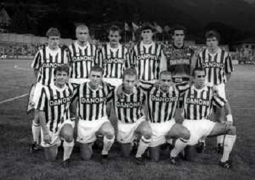 24-08-1992 SAINT VINCENT TORNEO CESARE BARETTI JUVENTUS -NAZIONALE USA 3-0 NELLA FOTO LA FORMAZIONE DELLA JUVENTUS 1992 DA SIN IN PIEDI GIANCARLO MAROCCHI-FABRIZIO RAVANELLI-JURGEN KOLLER-DINO BAGGIO-MICHELANGELO RAMPULLA-ANDREAS MOLLER SED DA SIN ANTONIO CONTE-MASSIMO CARRERA-DAVID PLATT-GIANLUCA VIALLI E PAOLO DI CANIO AG ALDO LIVERANI SAS
