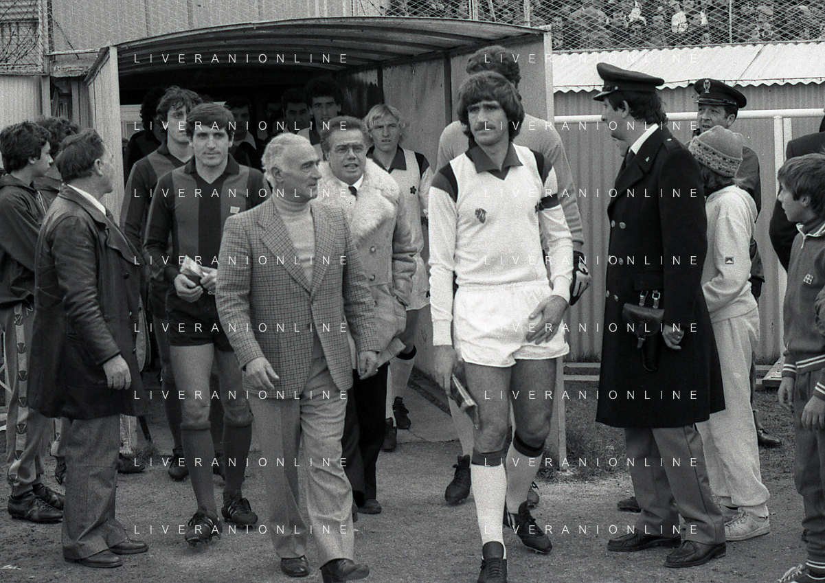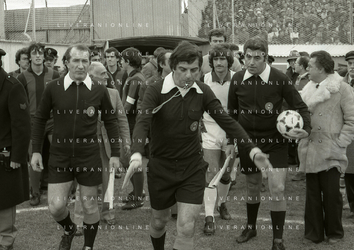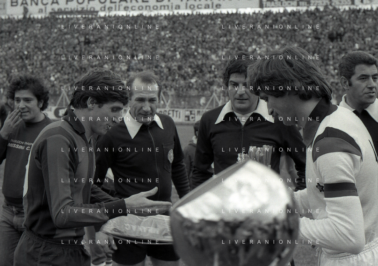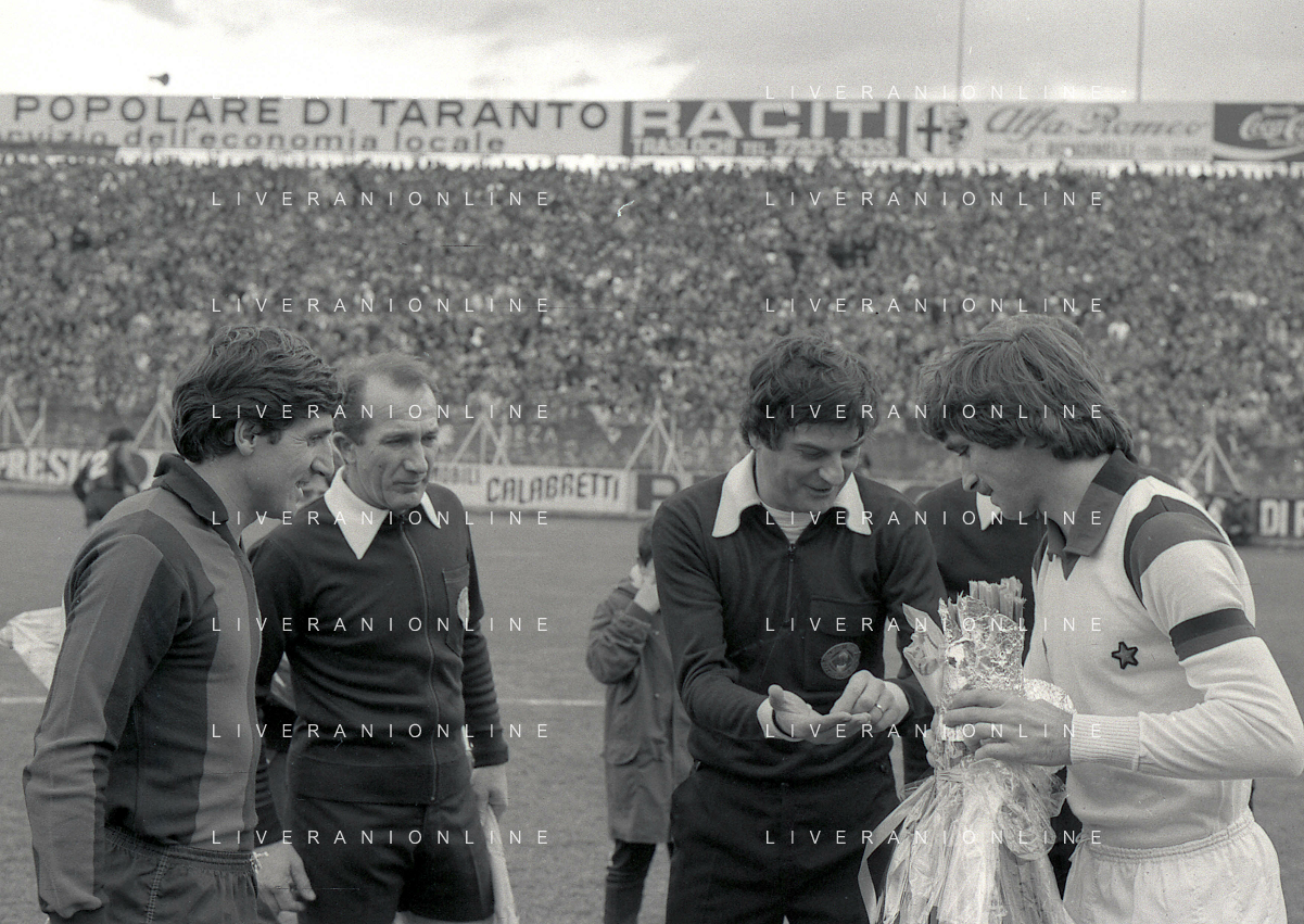 07-12-1980 TARANTO CAMPIONATO DI CALCIO SERIE B TARANTO-MILAN 3-0 NELLA FOTO ARBITRO ARNALDO PRATI COI DUE CAPITANI GIUSEPPE PAVONE E ALDO MALDERA AG ALDO LIVERANI SAS