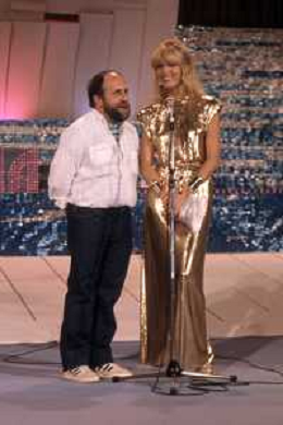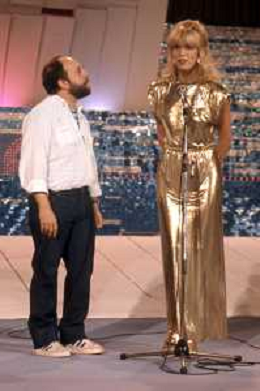 RETROSPETTIVA AMANDA LEAR CANTANTE NELLA FOTO CON ENRICO BERUSCHI ALLA GONDOLA D'ORO A VENEZIA NEL 1980 ©Archivio Giovanni Liverani/AGENZIA ALDO LIVERANI SAS