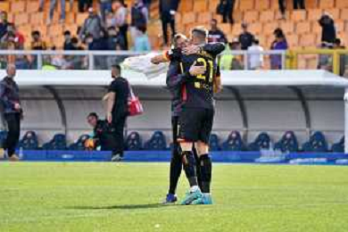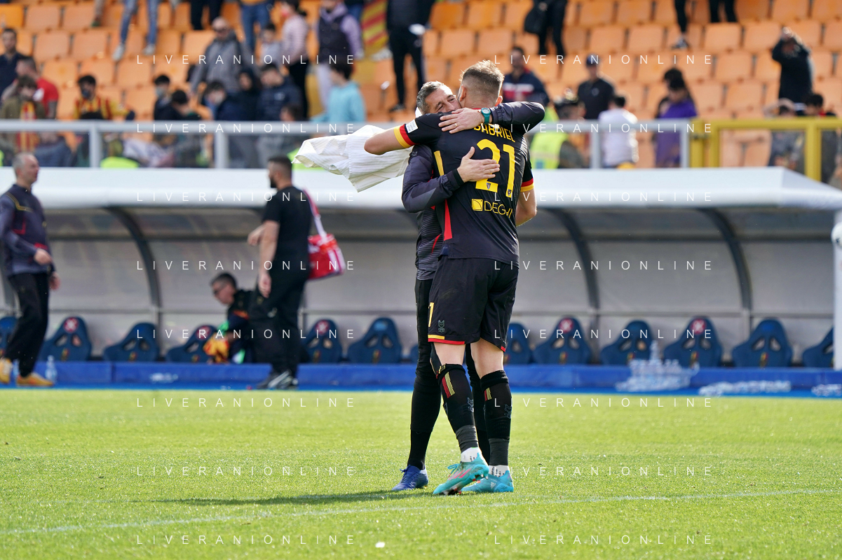 Emmanuele Mastrodonato/LMedia - US Lecce vs SPAL - Italian soccer Serie B match 2021/2022 April 09 2022 - Stadio Via del Mare Lecce, Italy US Lecce vs SPAL Photo showing: Gabriel and coach Sassanelli (US Lecce) esultanza @Emmanuele Mastrodonato/LiveMedia /AGENZIA ALDO LIVERANI SAS
