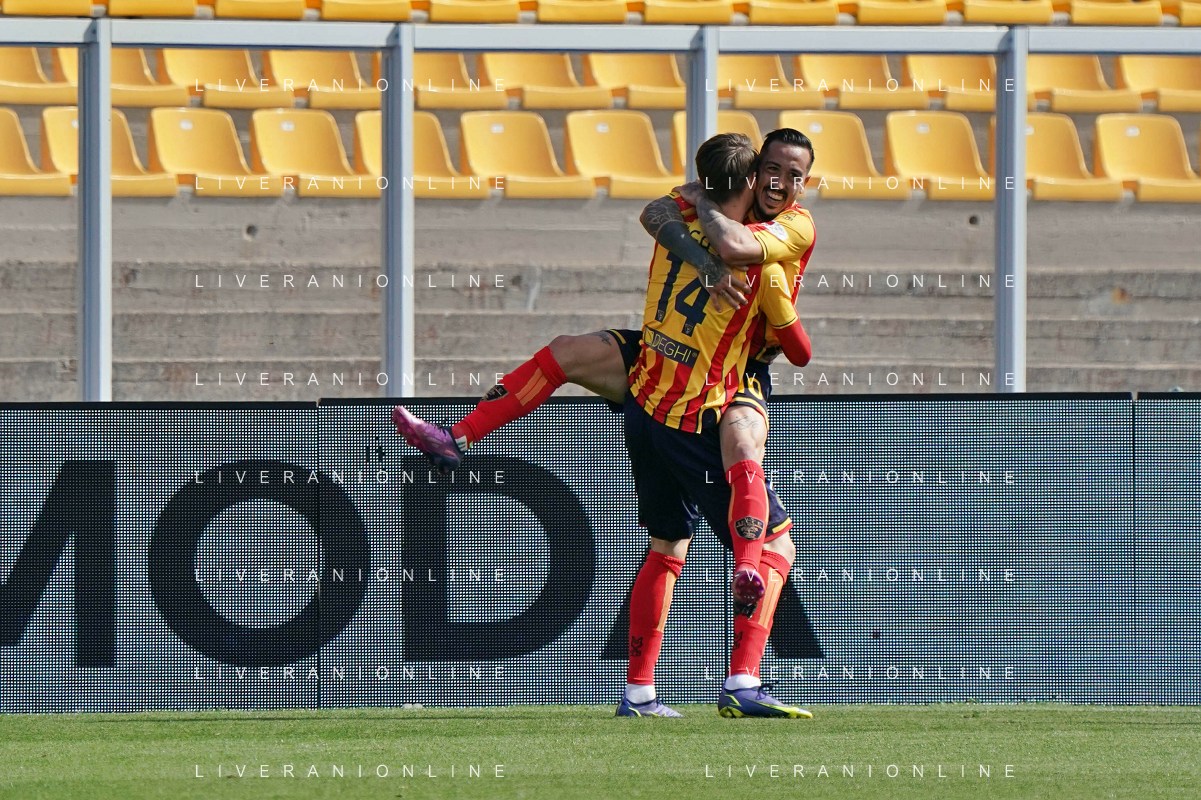 Emmanuele Mastrodonato/LMedia - US Lecce vs SPAL - Italian soccer Serie B match 2021/2022 April 09 2022 - Stadio Via del Mare Lecce, Italy US Lecce vs SPAL Photo showing: Thorir Johann Helgason and Francesco Di Mariano (US Lecce) celebrates after scoring a goal of 1-0 @Emmanuele Mastrodonato/LiveMedia /AGENZIA ALDO LIVERANI SAS