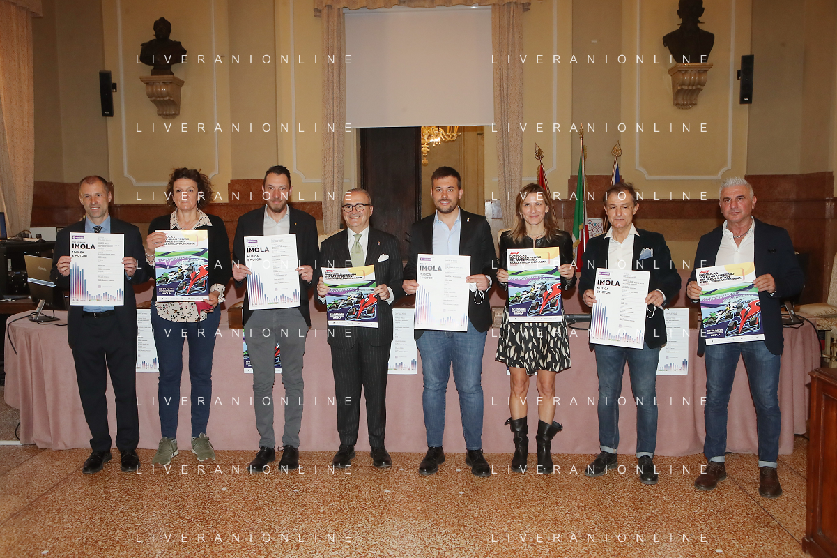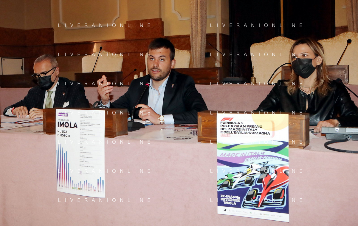 IMOLA 15 04 2022 CONFERENZA STAMPA FORMULA 1 EVENTI ORGANIZZATI DAL COMUNE DI IMOLA NELLA FOTO IN CENTRO SINDACO MARCO PANIERI ASSESSORE PIERANGELO RAFFINI ASSESSORE ELENA PENAZZI AUTODROMO E LE CATEGORIE foto gianni sanna-ag aldo liverani sas
