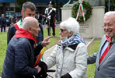 IMOLA 25/04 2022 77 ANNIVERSARIO DELLA LIBERAZIONE D'ITALIA NELLA FOTO SCHERZI TRA DUE PARTIGGIANI VITTORIO GARDI E GINA MANARESI IN PRESENZA ANCHE SINDACO MARCO PANIERI E GABRIO SALLIERI PRESIDENTE ANPI IMOLA FOTO GIANNI SANNA-AG ALDO LIVERANI SAS