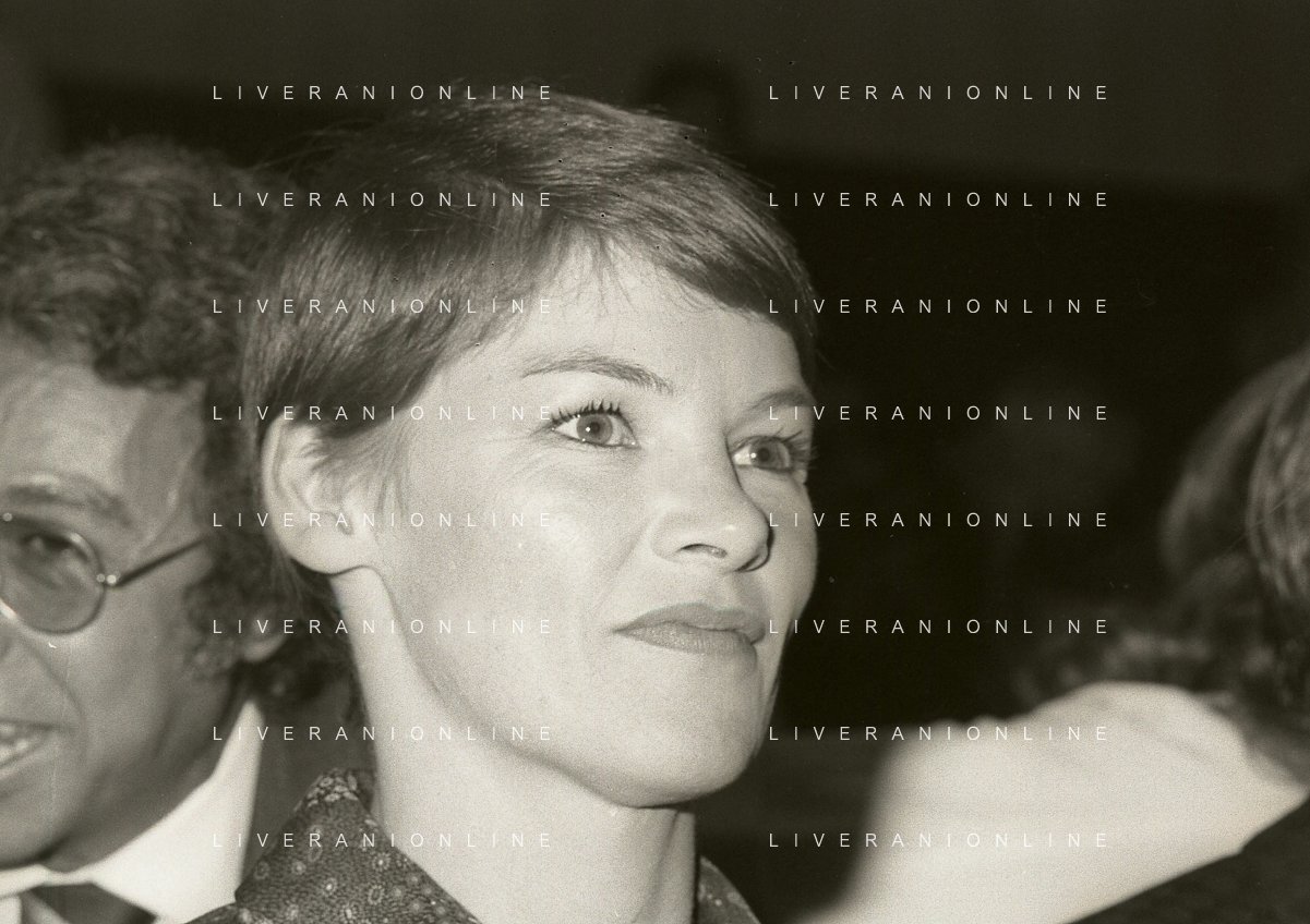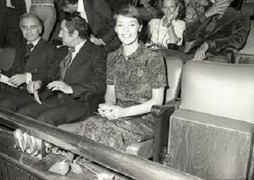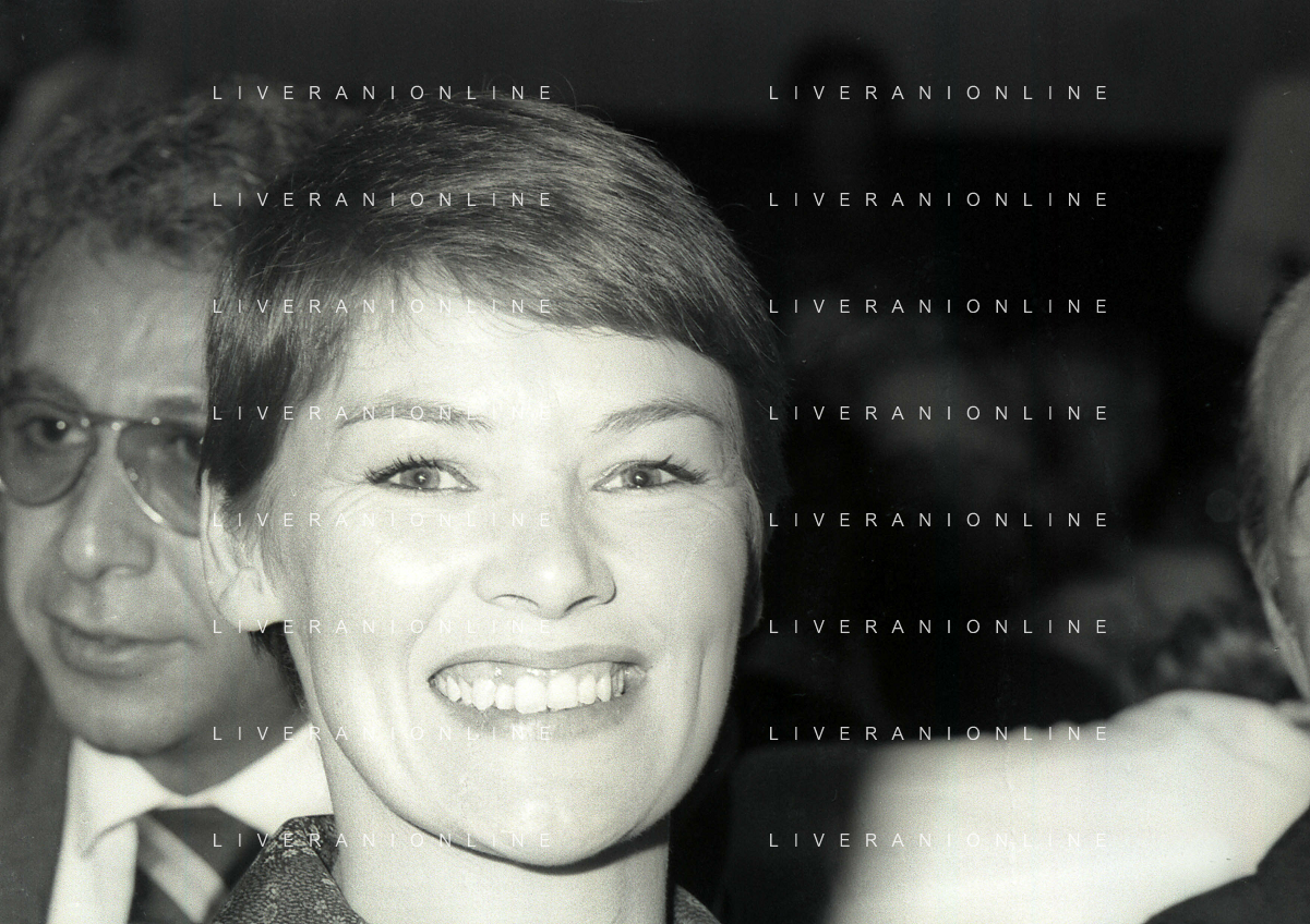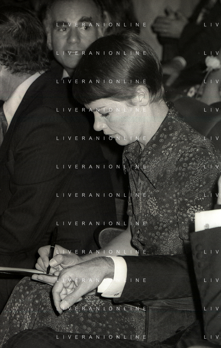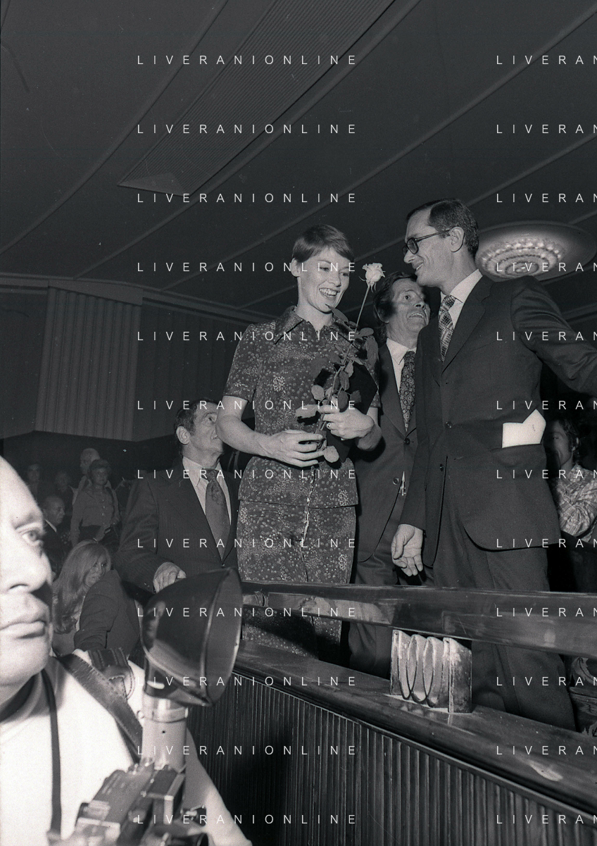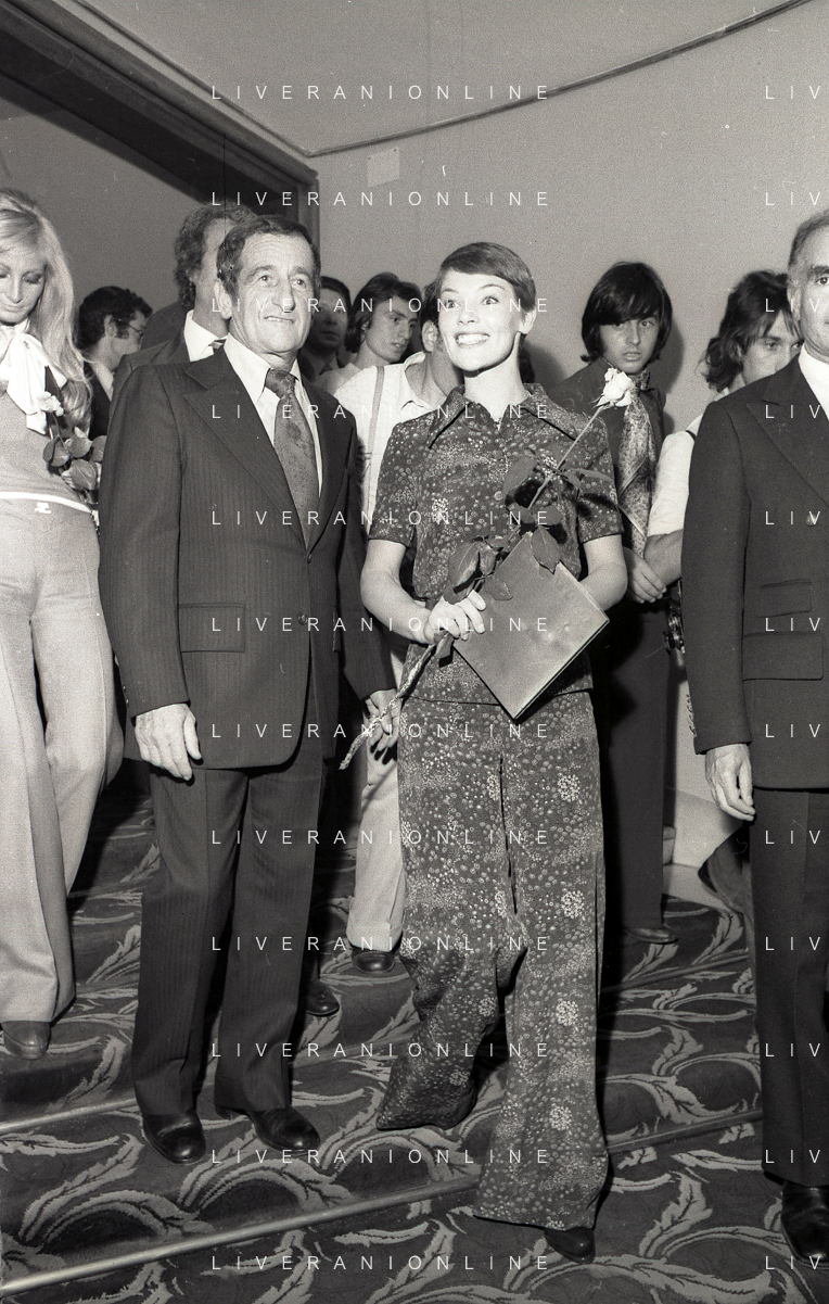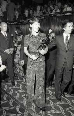 RETROSPETTIVA GLENDA JACKSON ATTRICE NELLA FOTO GLENDA JACKSON A MILANO NELL'ANNO 1973 IVANOE FRAIZZOLI PRESIDENTE INTER CON GIUSEPPE PRISCO E RENATA FRAIZZOLI AG ALDO LIVERANI SAS