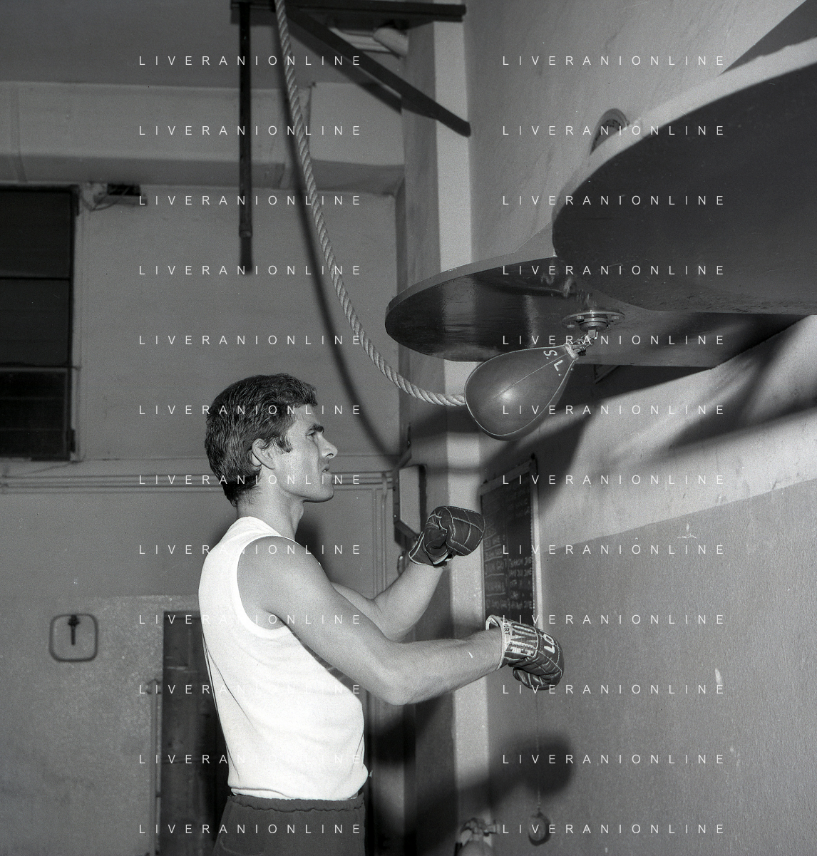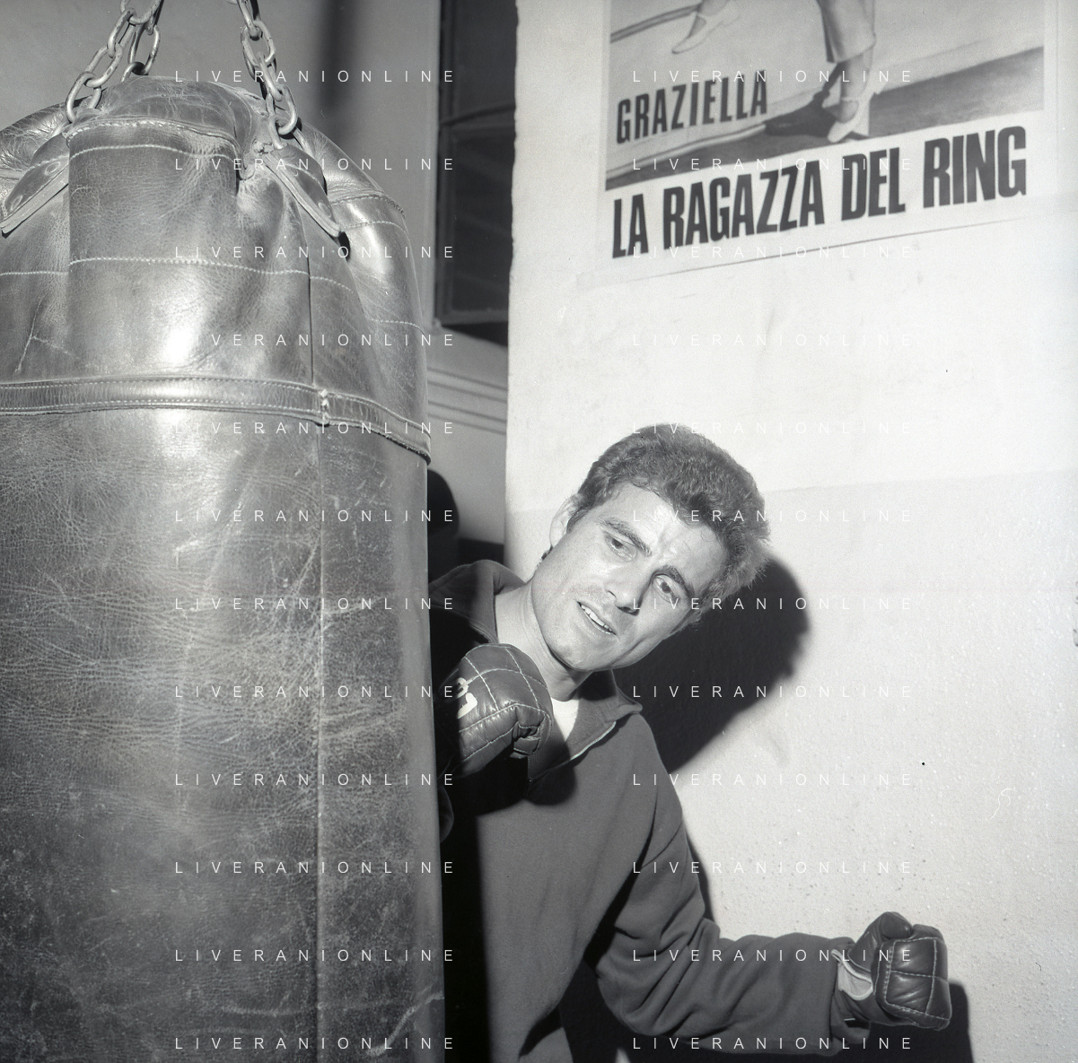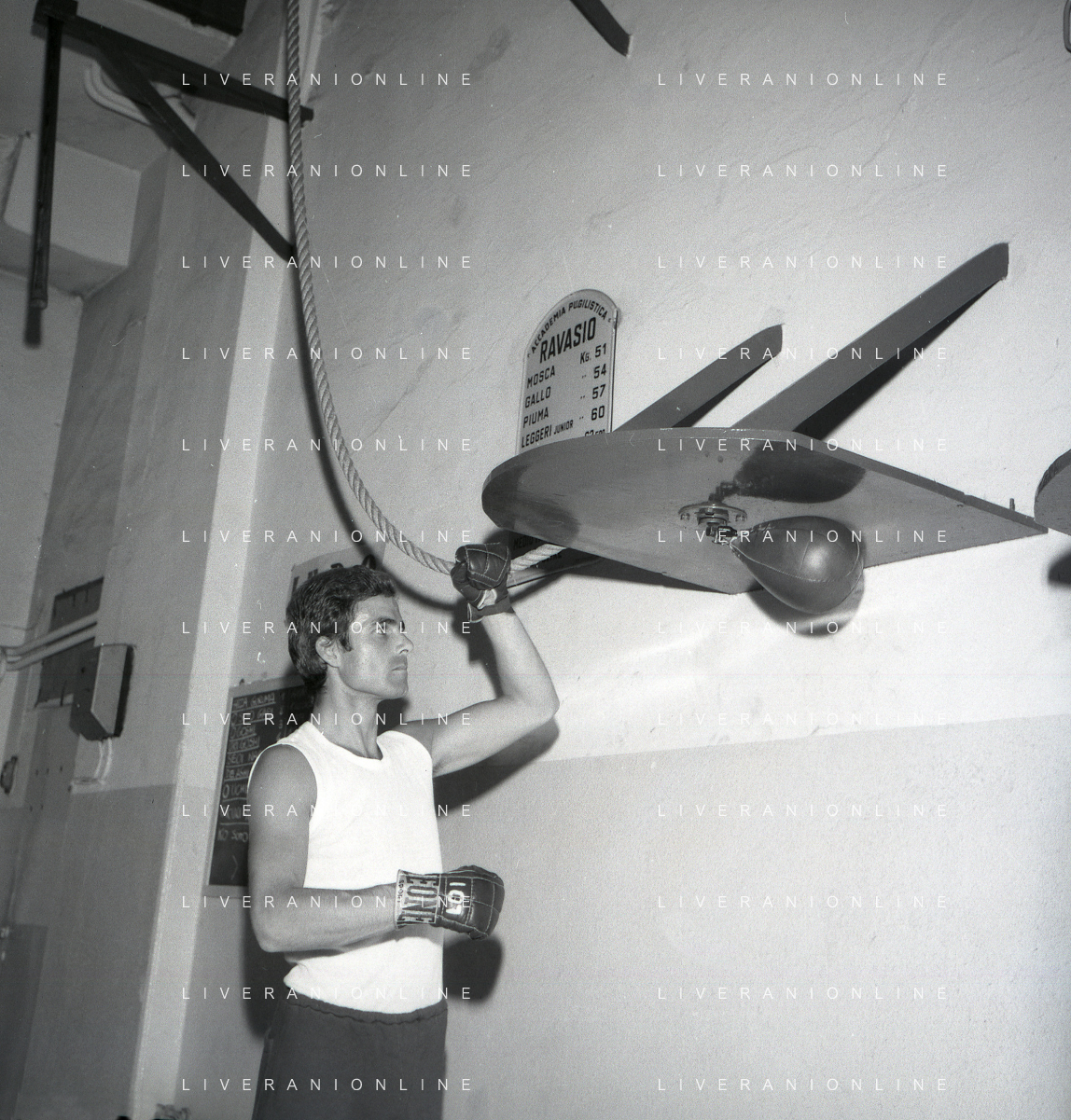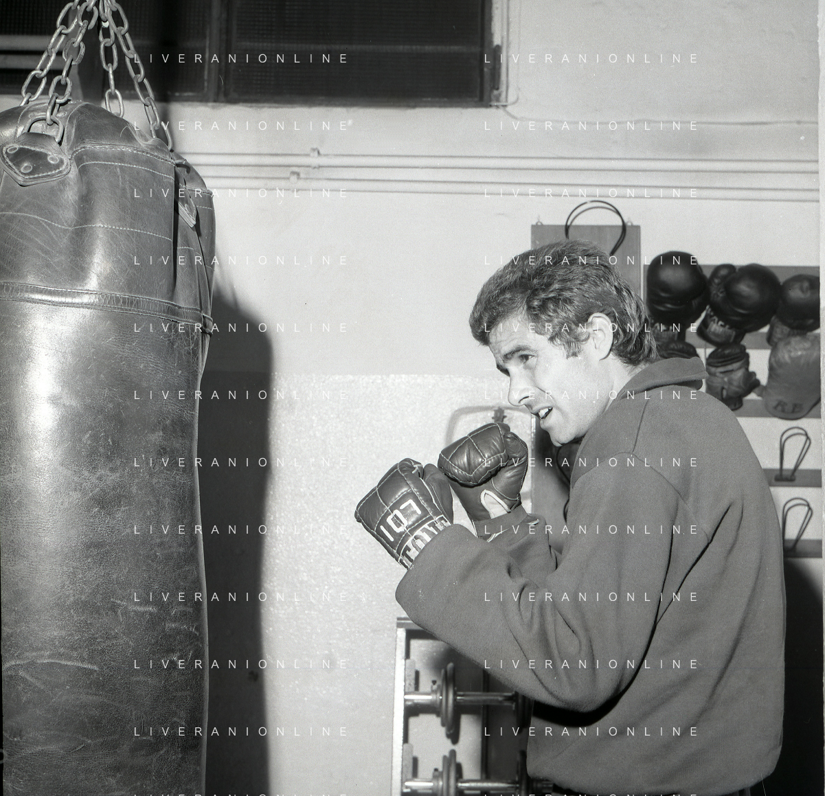 RETROSPETTIVA NINO CASTELNUOVO ATTORE NELLA FOTO NINO CASTELNUOVO A MILANO NELL'ANNO 1968 SI ALLENA NELLA PALESTRA DEL EX PUGILE DUILIO LOI AG ALDO LIVERANI SAS