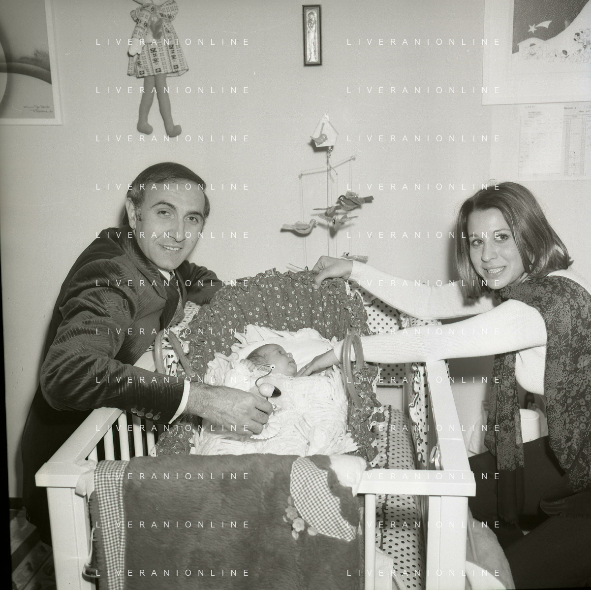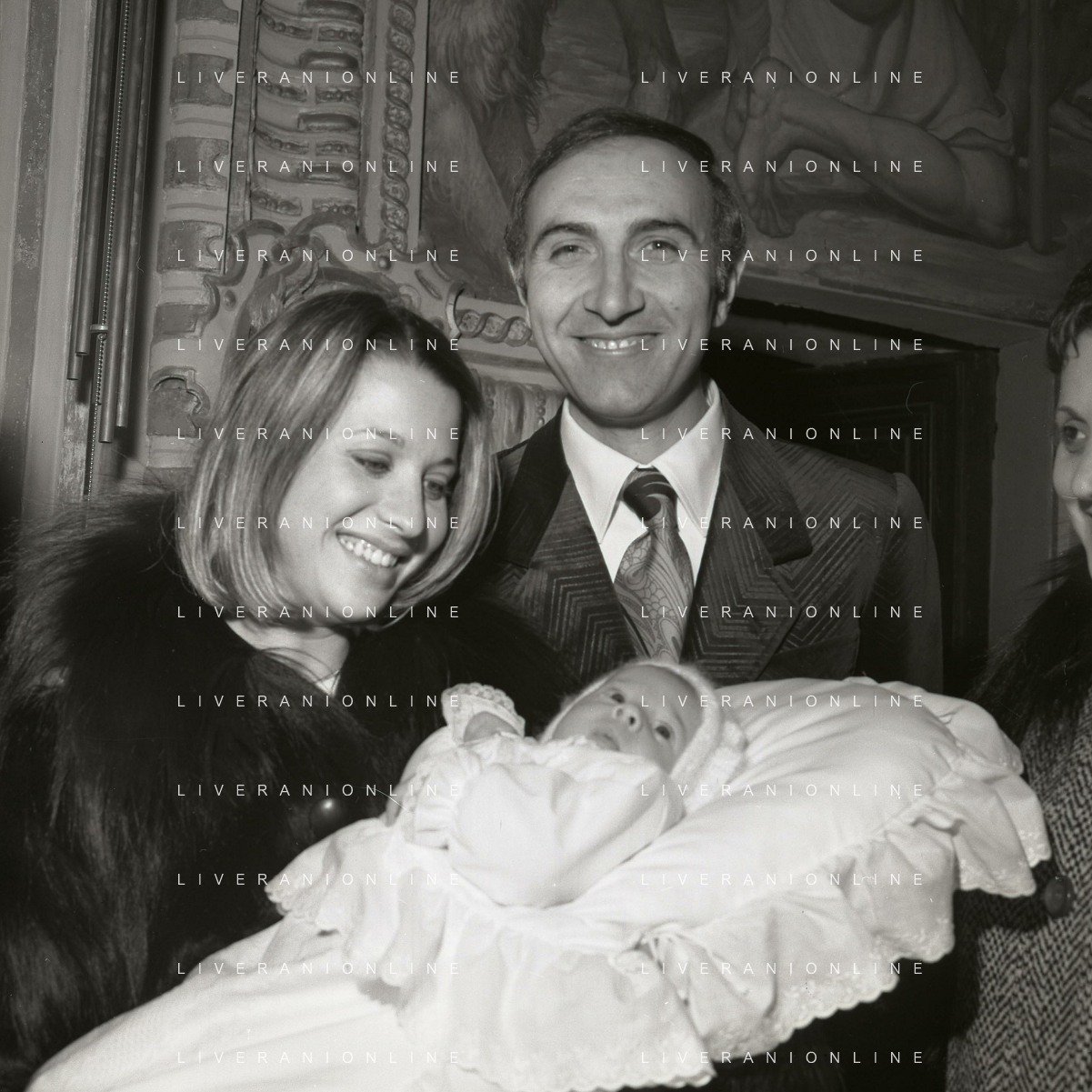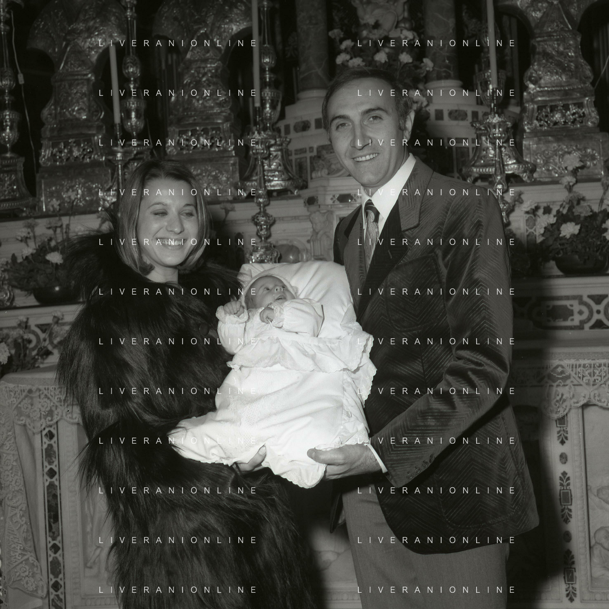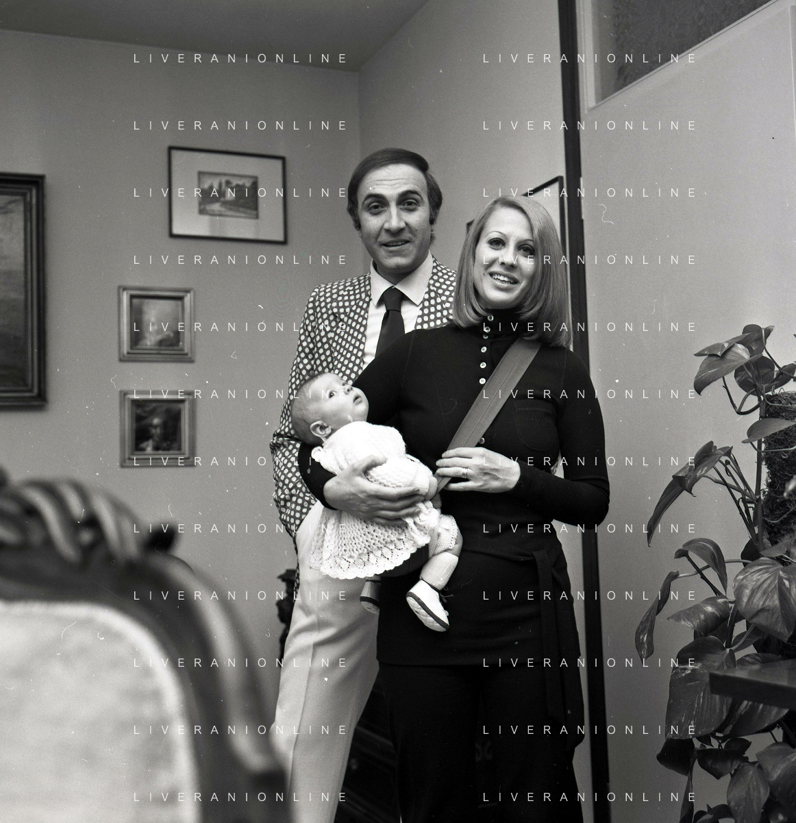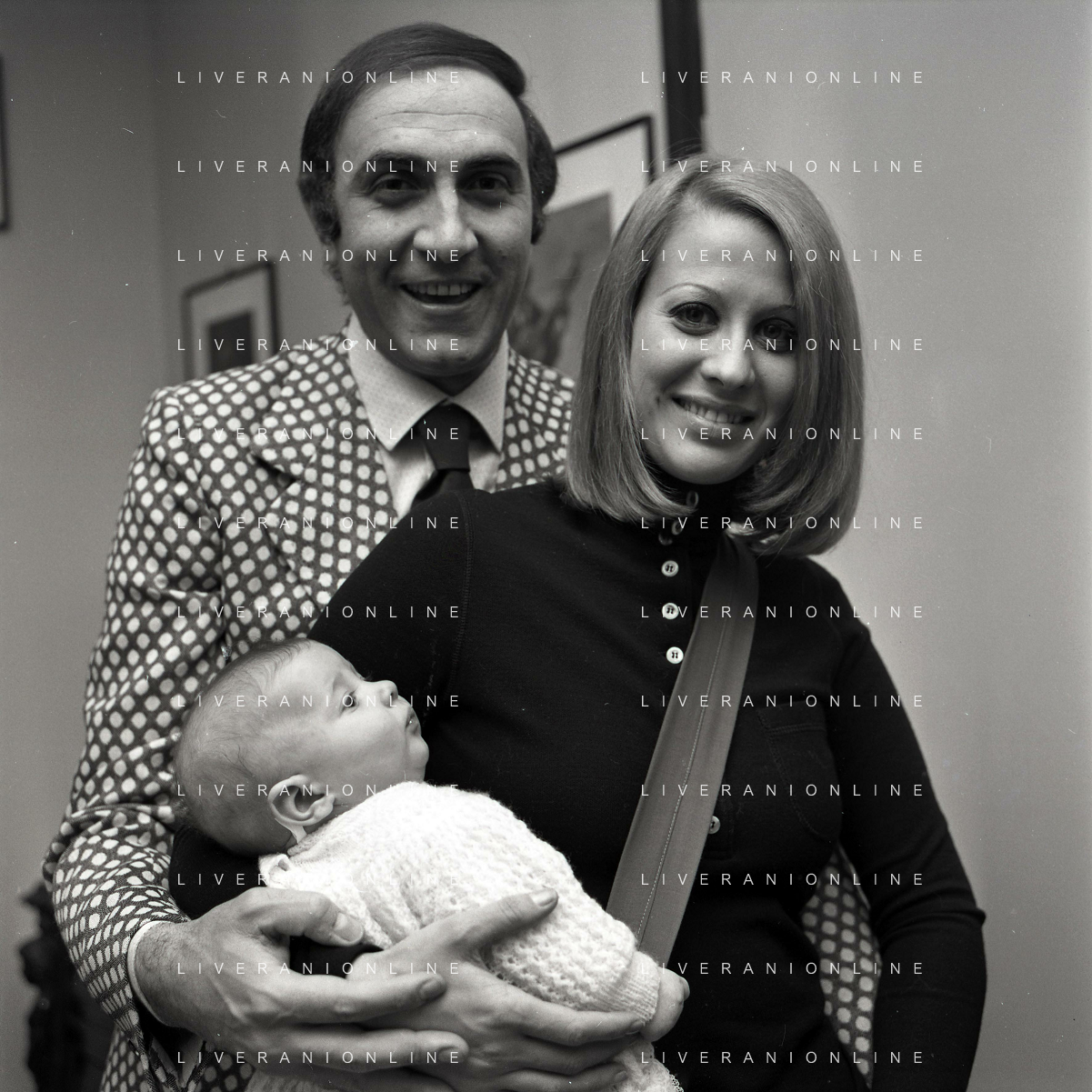 MILANO 1970 RETROSPETTIVA PIPPO BAUDO PRESENTATORE TELEVISIVO NELLA FOTO PIPPO BAUDO CON ANGELA LIPPI IL GIORNO DEL BATTESIMO DELLA FIGLIA TIZIANA AG ALDO LIVERANI SAS