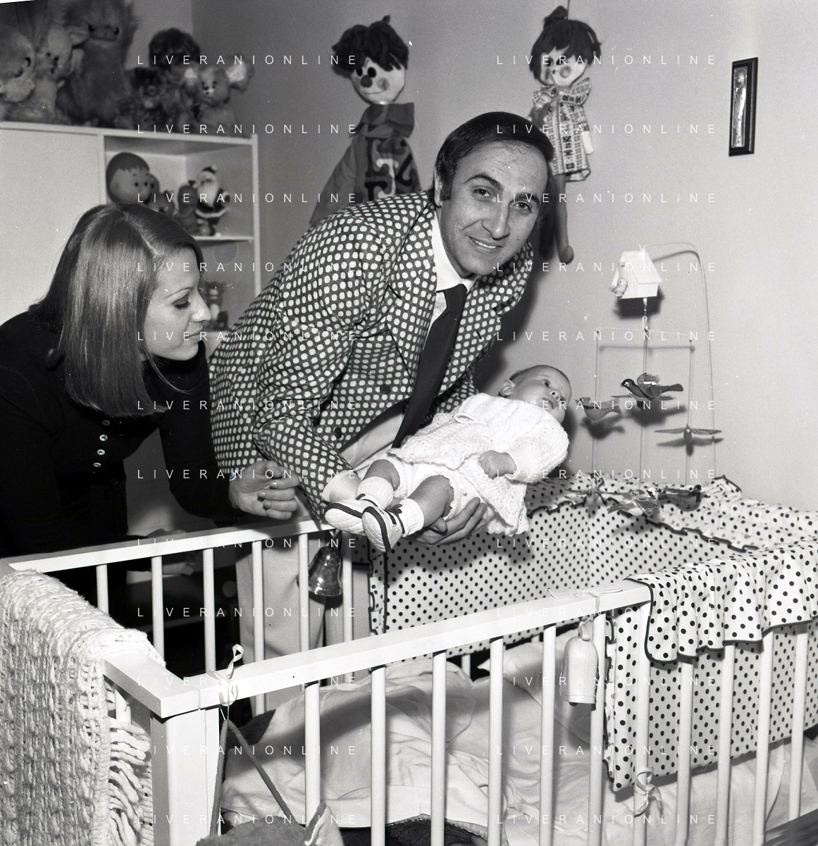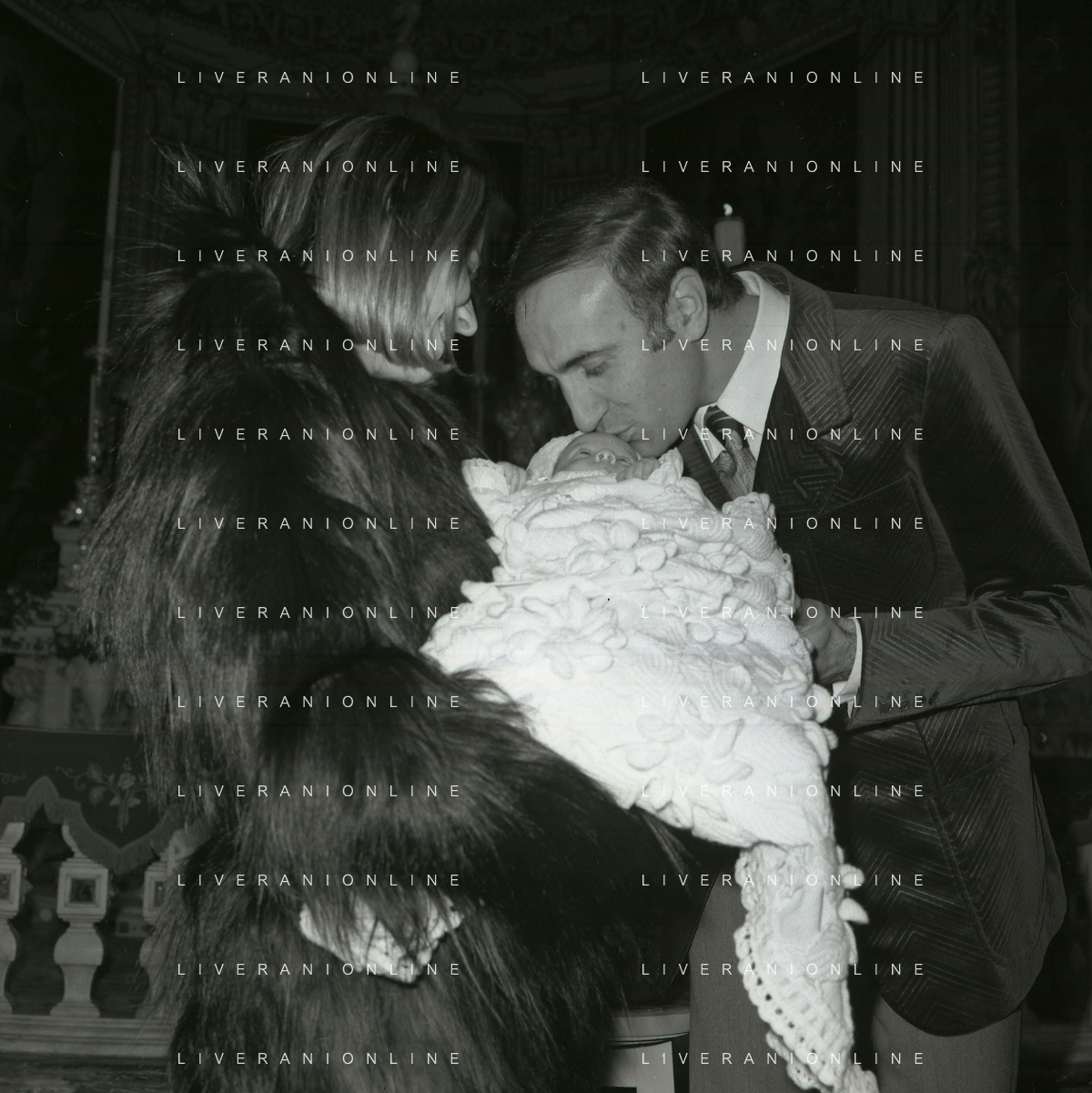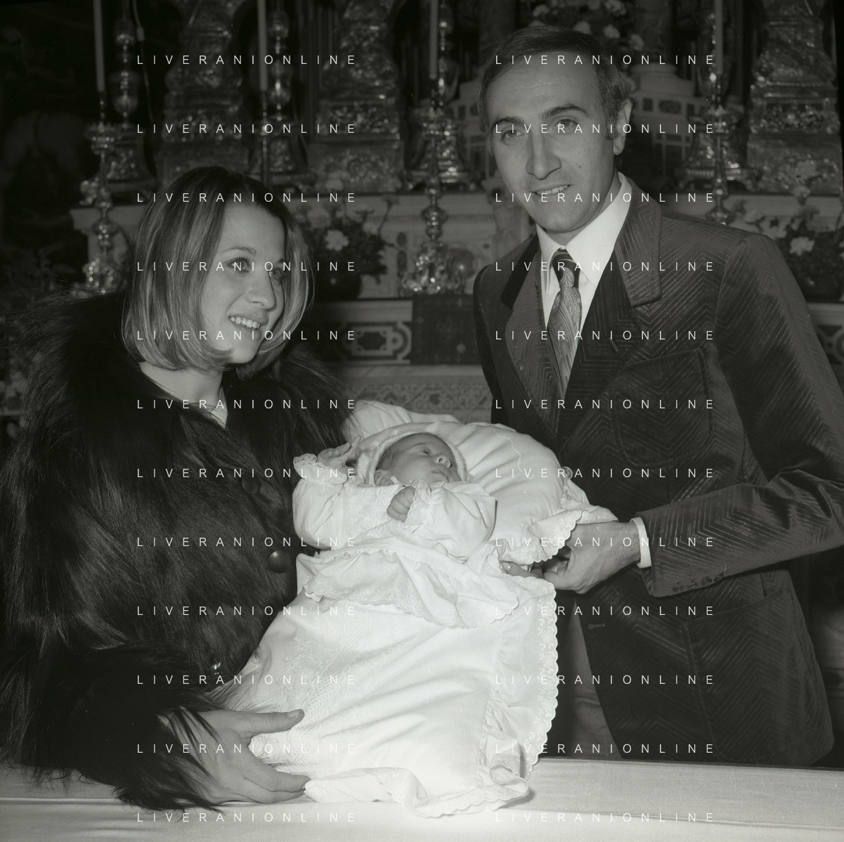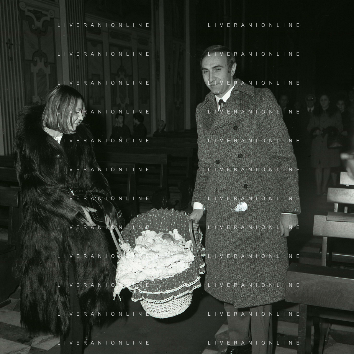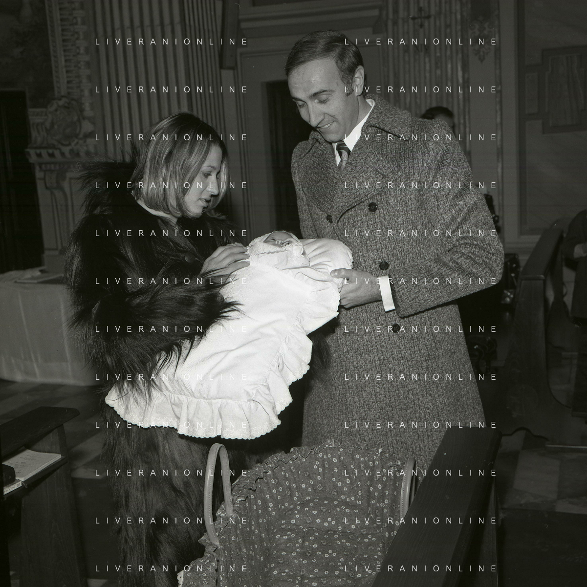 MILANO 1970 RETROSPETTIVA PIPPO BAUDO PRESENTATORE TELEVISIVO NELLA FOTO PIPPO BAUDO CON ANGELA LIPPI IL GIORNO DEL BATTESIMO DELLA FIGLIA TIZIANA AG ALDO LIVERANI SAS