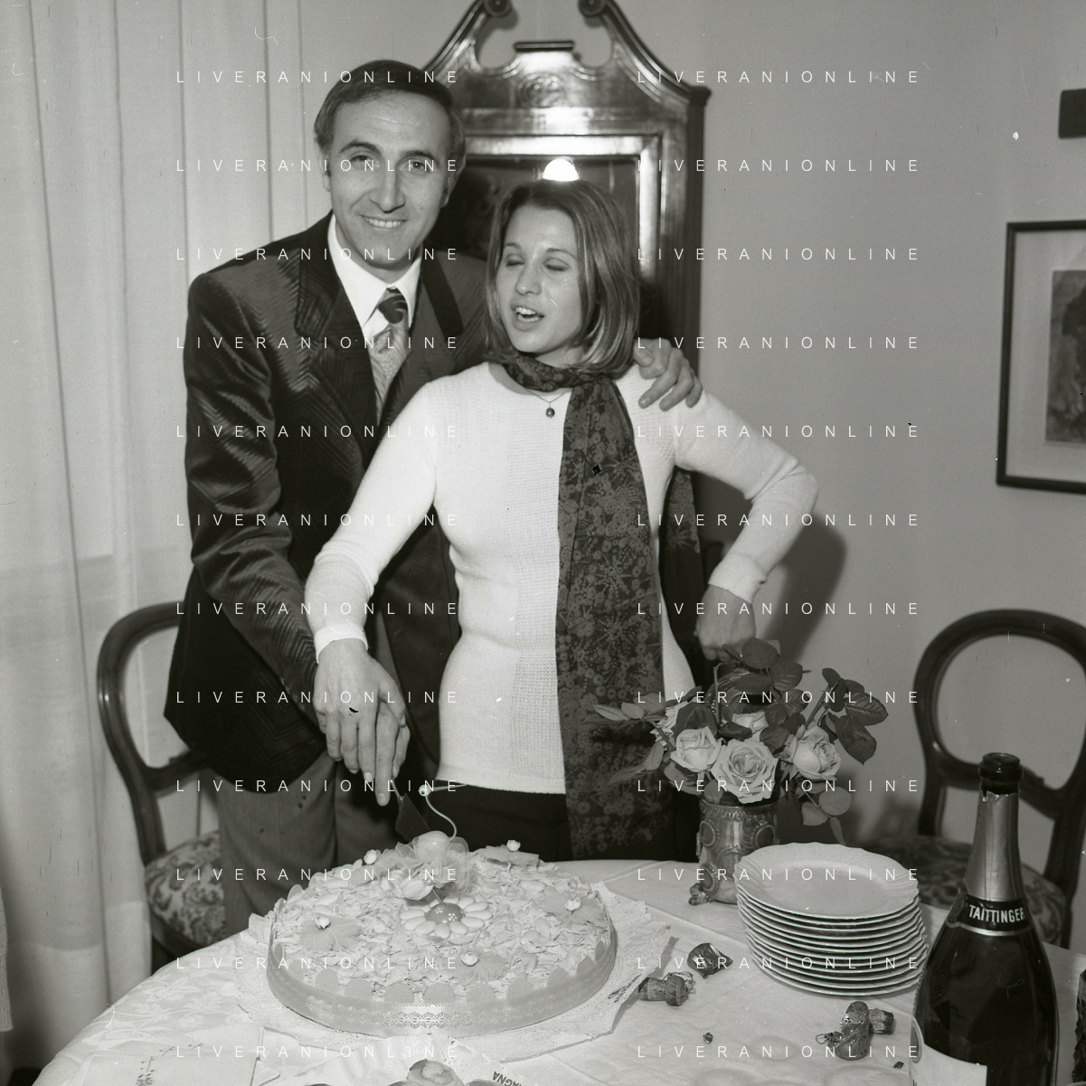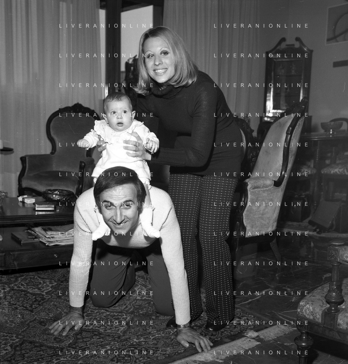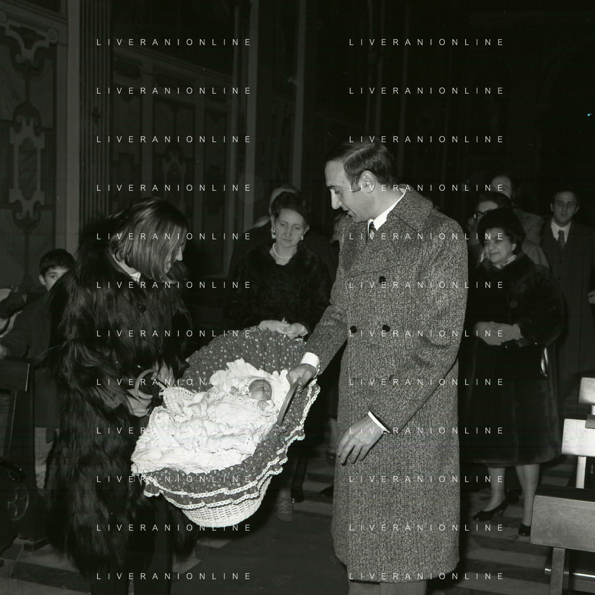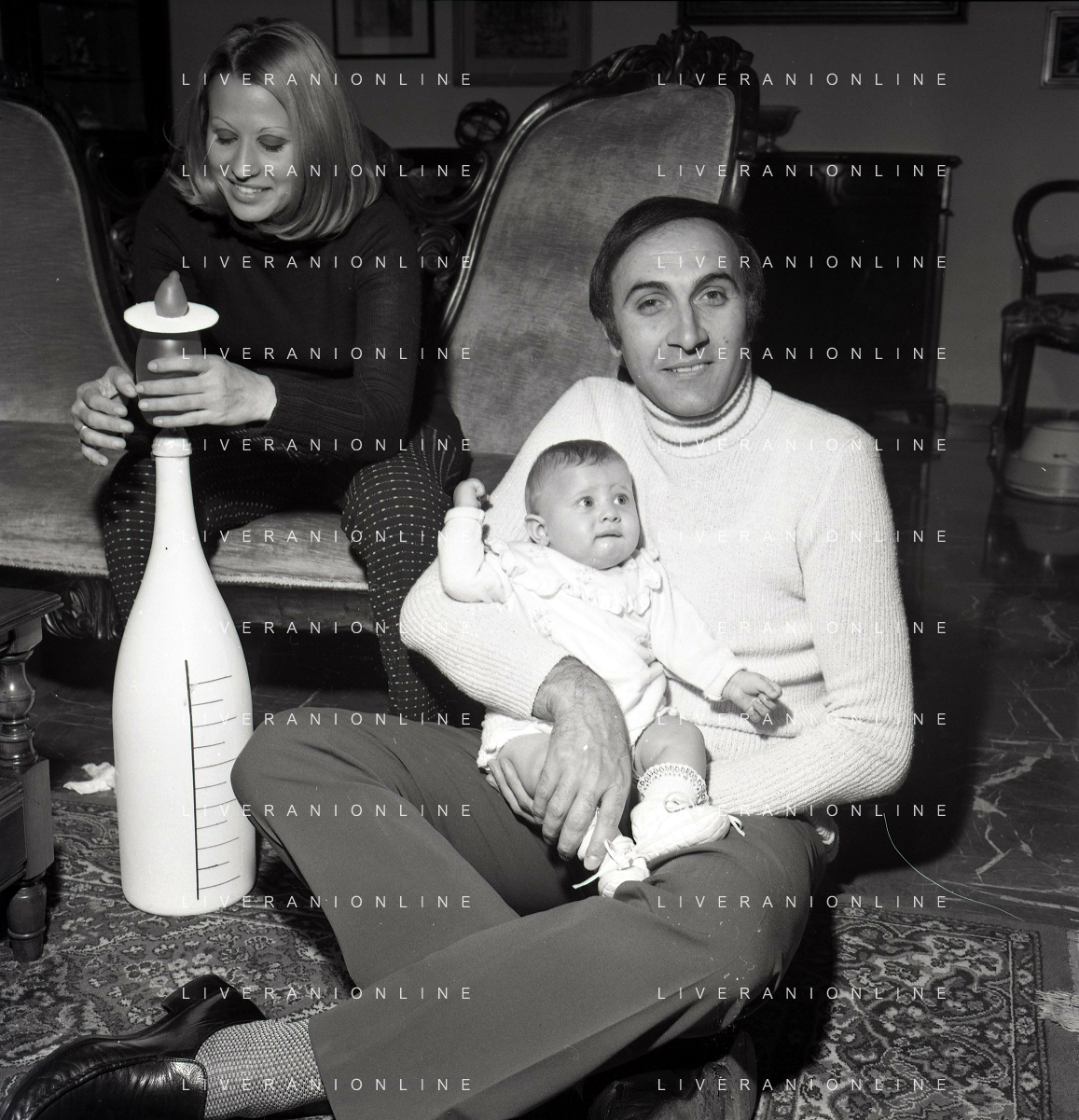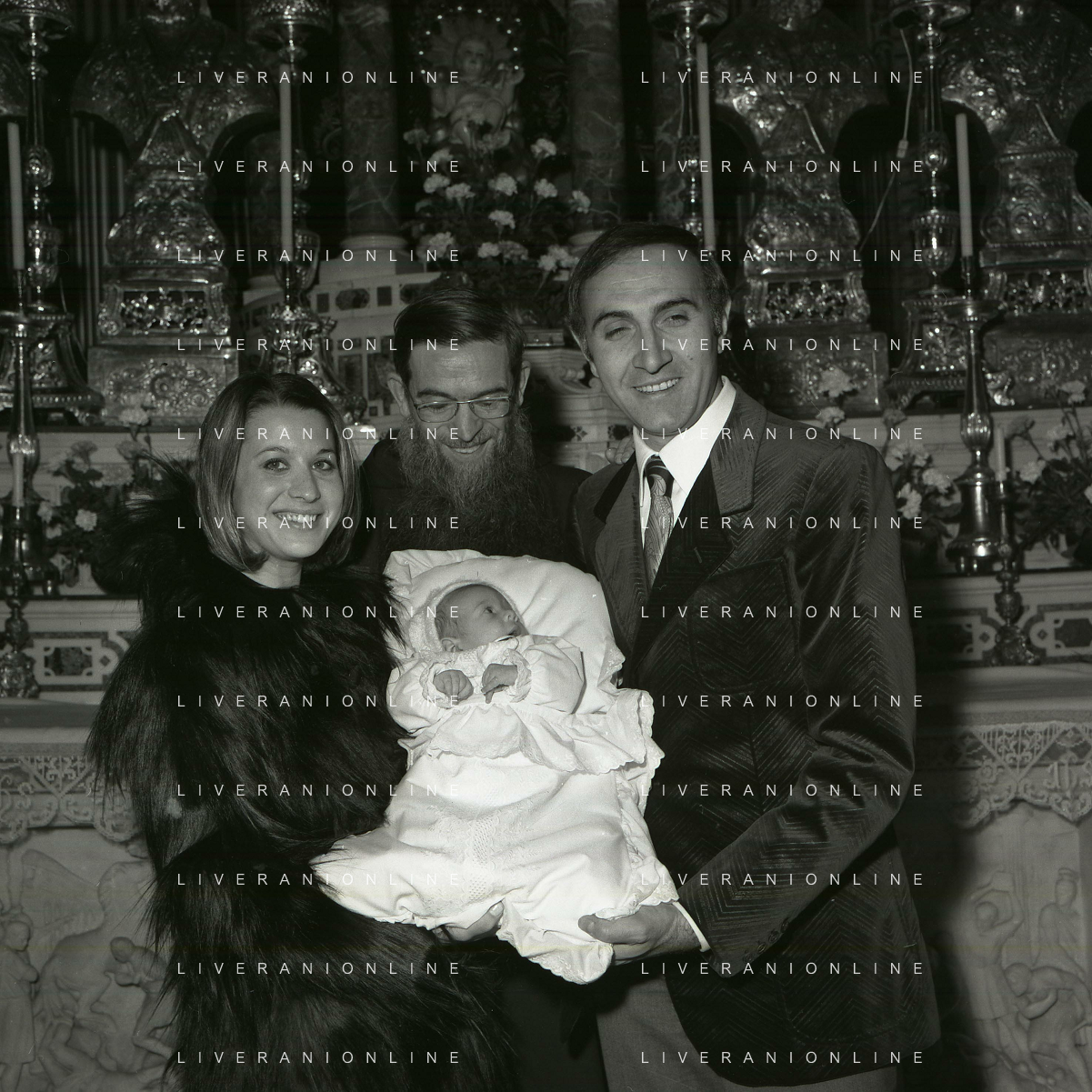 MILANO 1970 RETROSPETTIVA PIPPO BAUDO PRESENTATORE TELEVISIVO NELLA FOTO PIPPO BAUDO CON ANGELA LIPPI IL GIORNO DEL BATTESIMO DELLA FIGLIA TIZIANA AG ALDO LIVERANI SAS