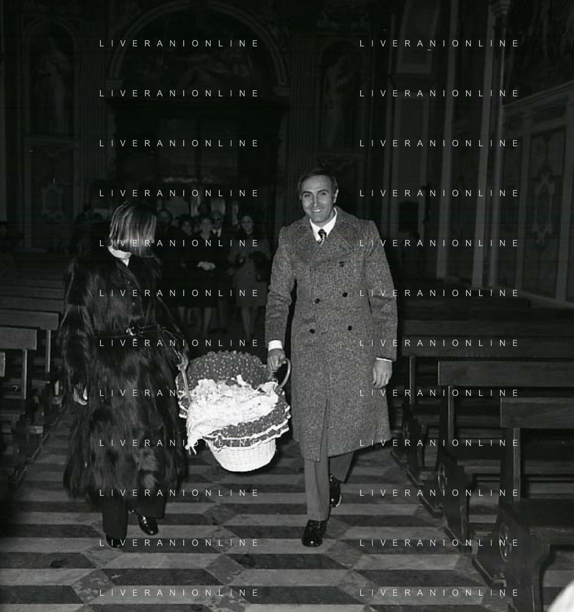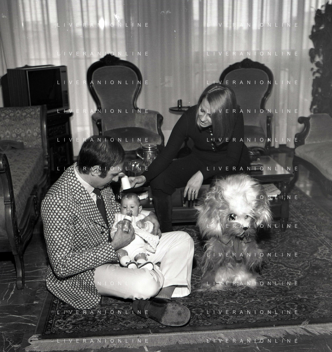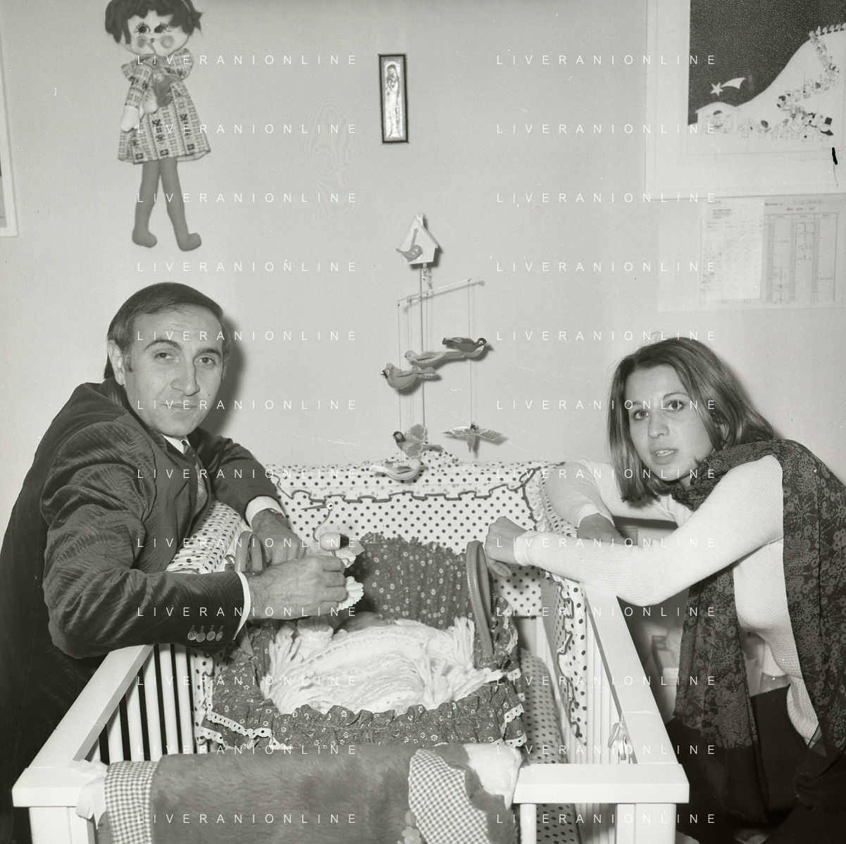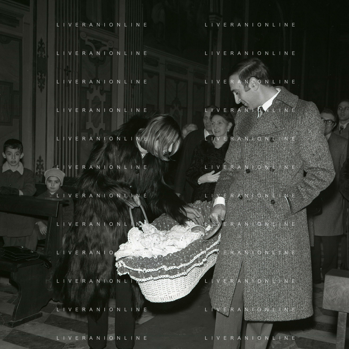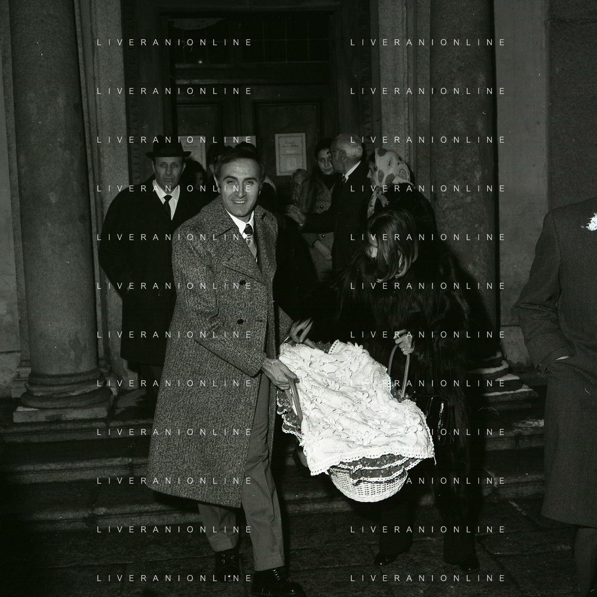 MILANO 1970 RETROSPETTIVA PIPPO BAUDO PRESENTATORE TELEVISIVO NELLA FOTO PIPPO BAUDO CON ANGELA LIPPI IL GIORNO DEL BATTESIMO DELLA FIGLIA TIZIANA AG ALDO LIVERANI SAS