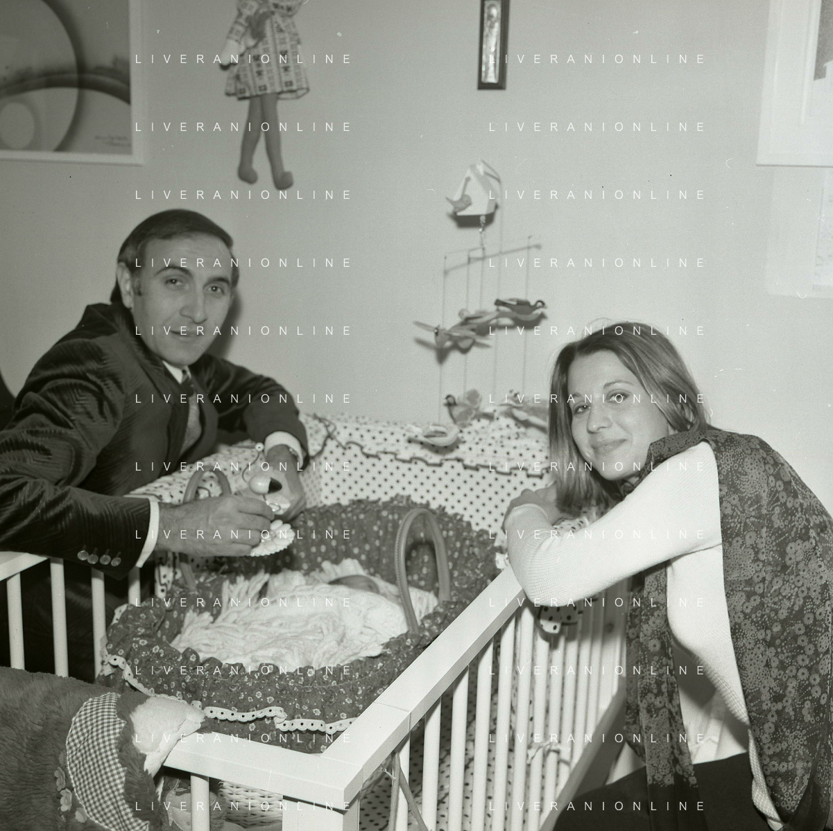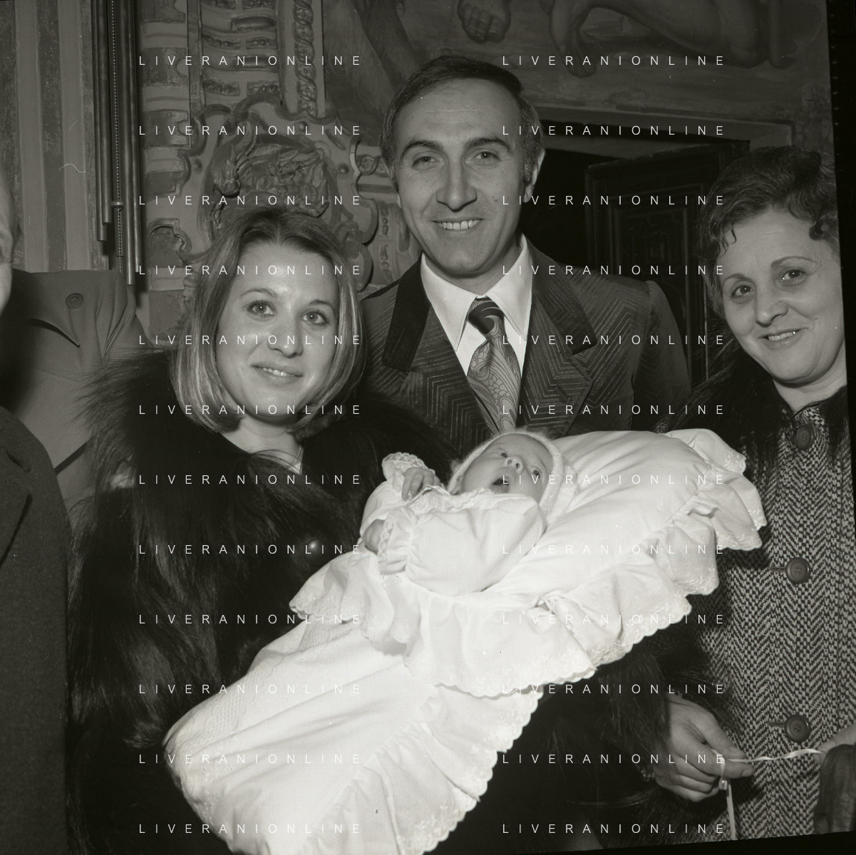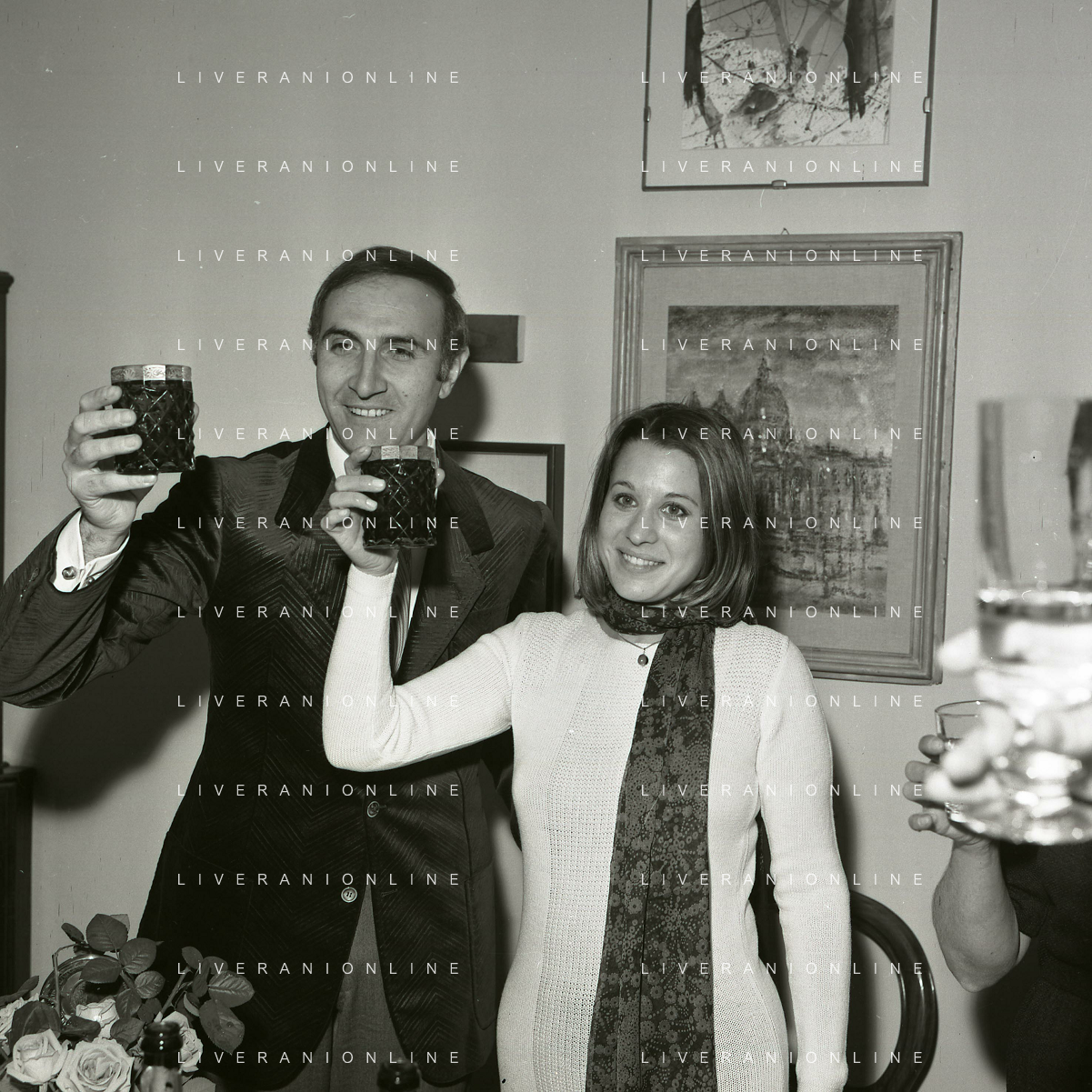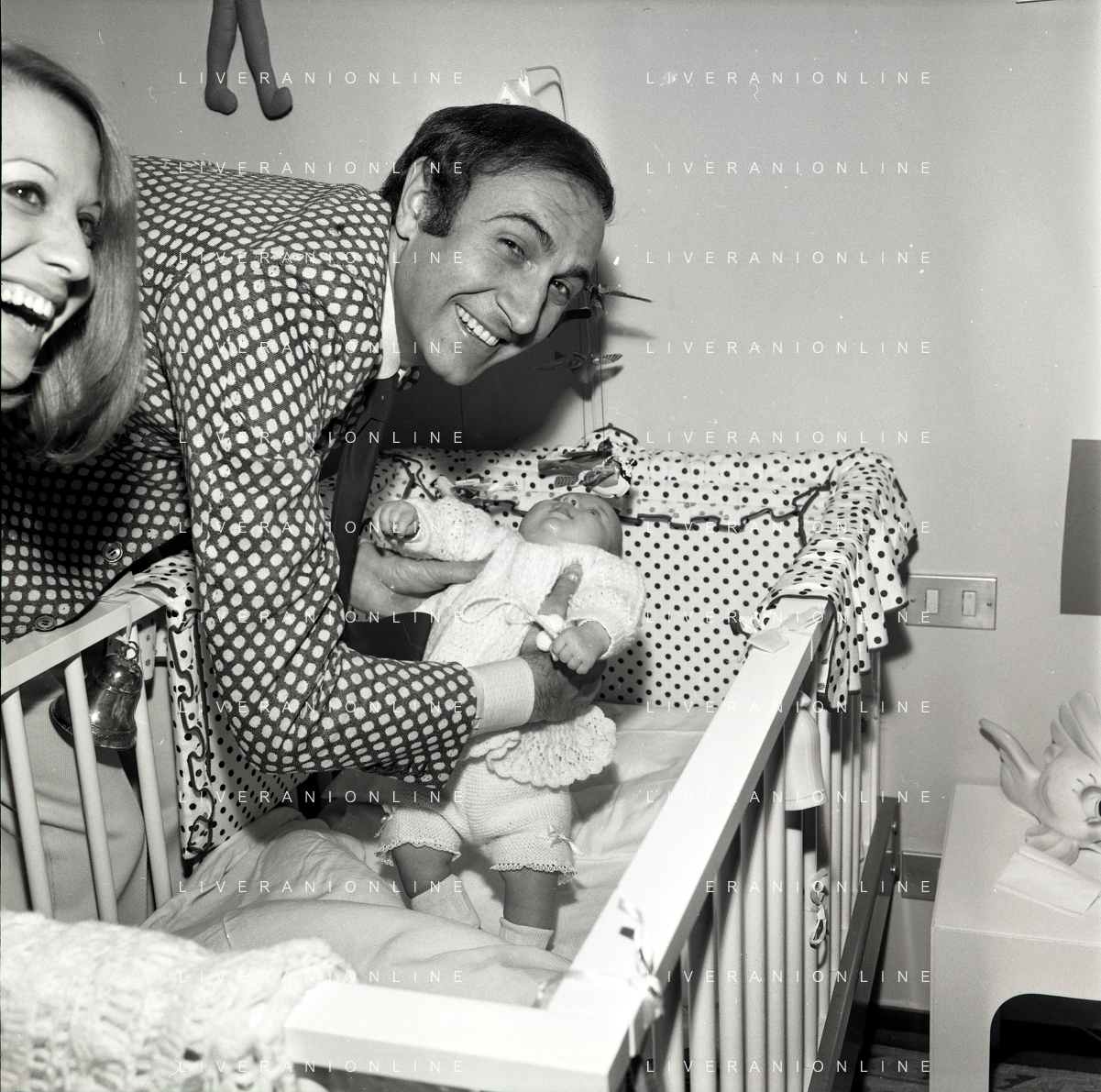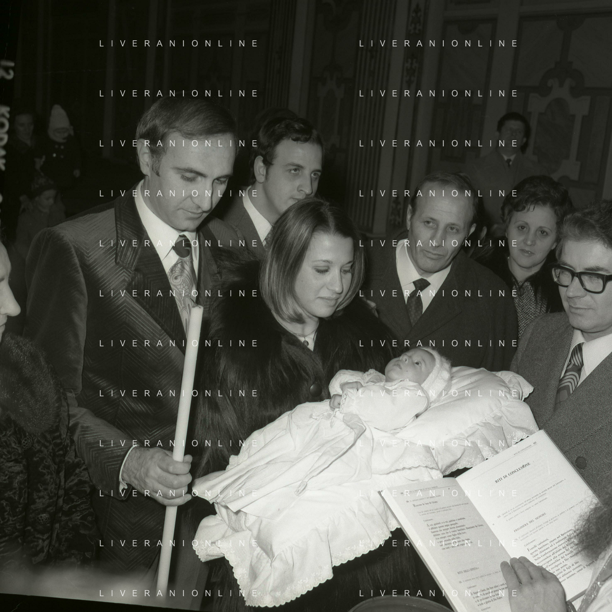 MILANO 1970 RETROSPETTIVA PIPPO BAUDO PRESENTATORE TELEVISIVO NELLA FOTO PIPPO BAUDO CON ANGELA LIPPI IL GIORNO DEL BATTESIMO DELLA FIGLIA TIZIANA AG ALDO LIVERANI SAS