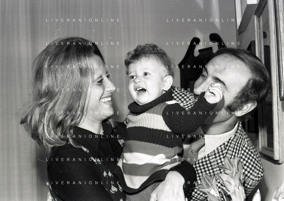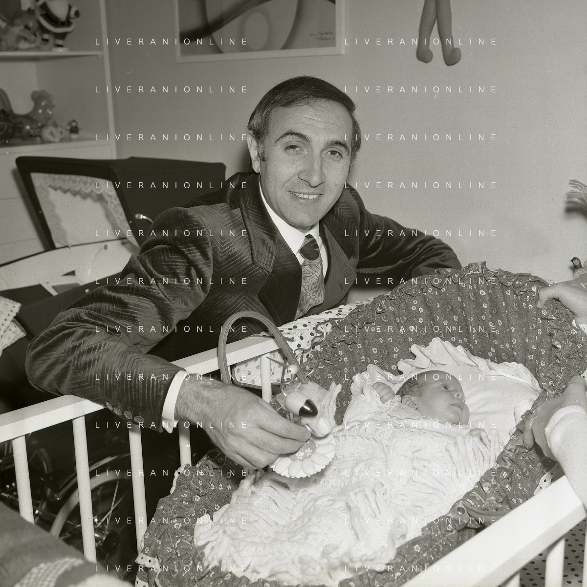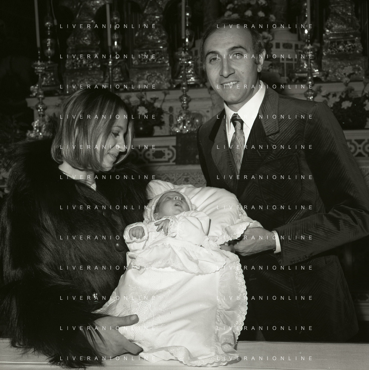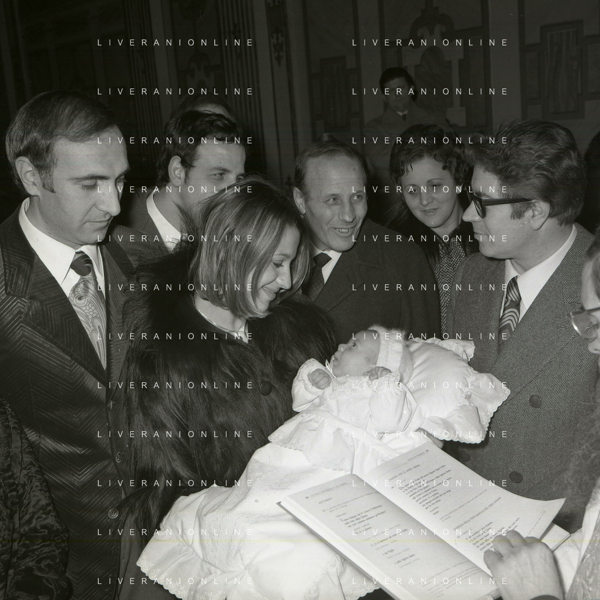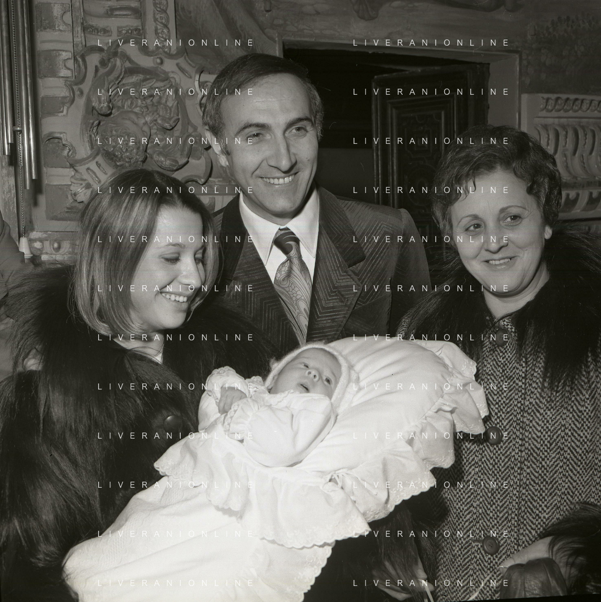 MILANO 1970 RETROSPETTIVA PIPPO BAUDO PRESENTATORE TELEVISIVO NELLA FOTO PIPPO BAUDO CON ANGELA LIPPI IL GIORNO DEL BATTESIMO DELLA FIGLIA TIZIANA AG ALDO LIVERANI SAS