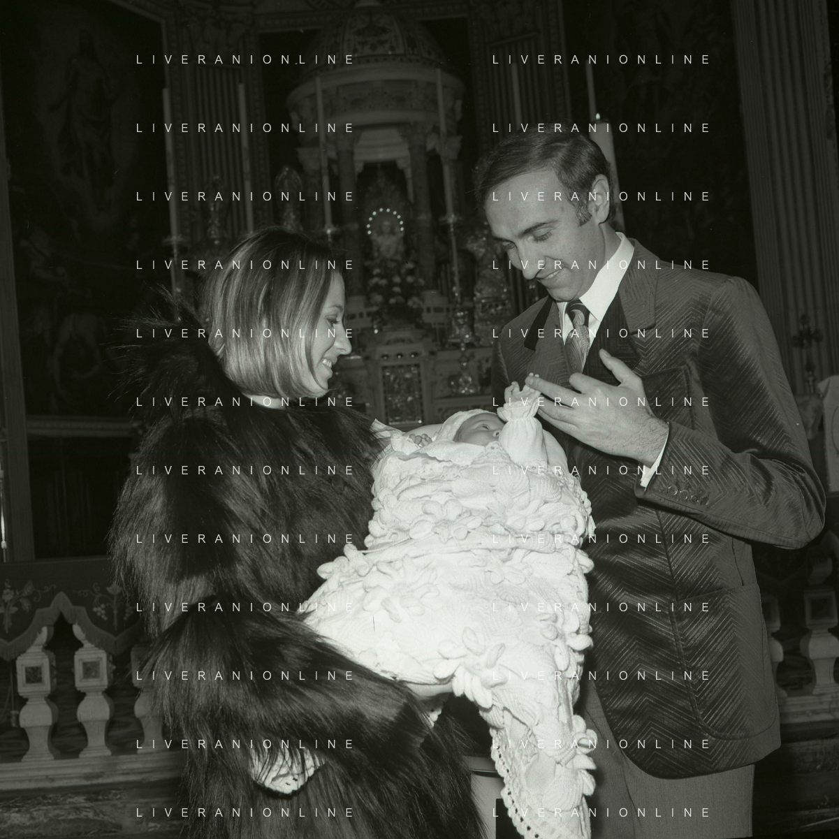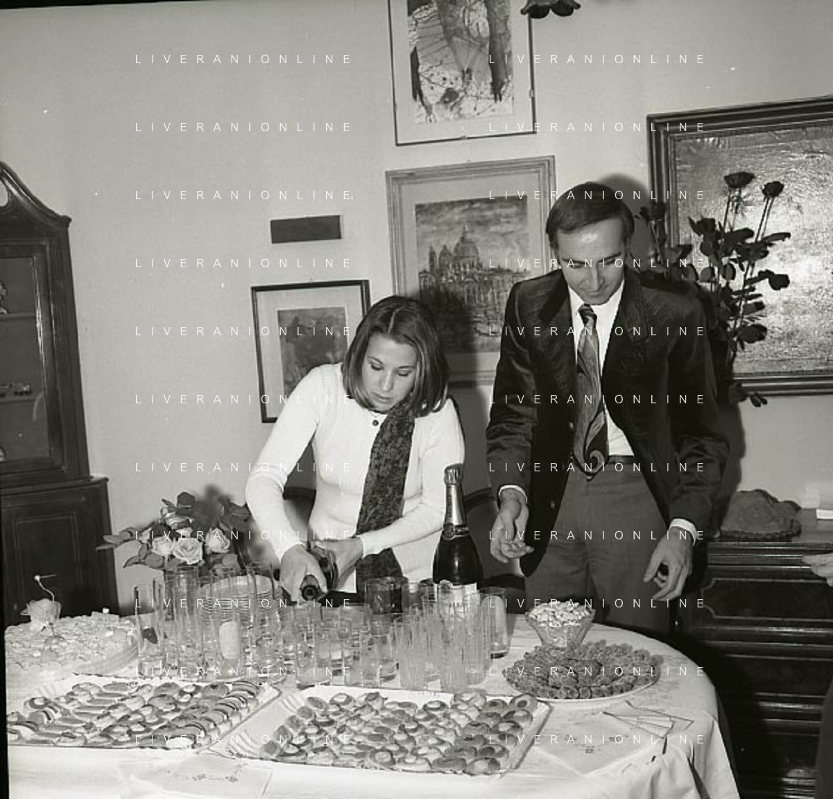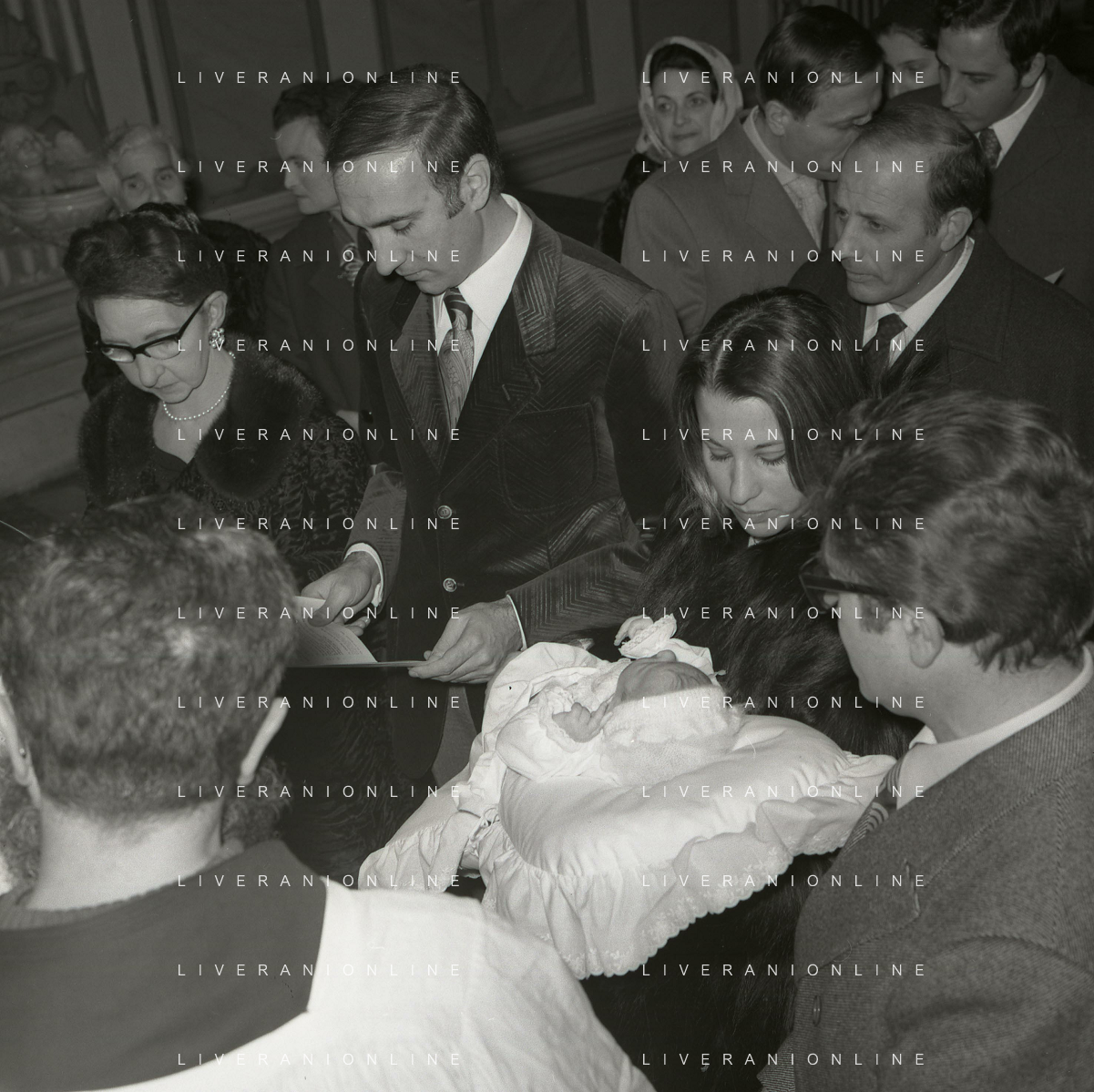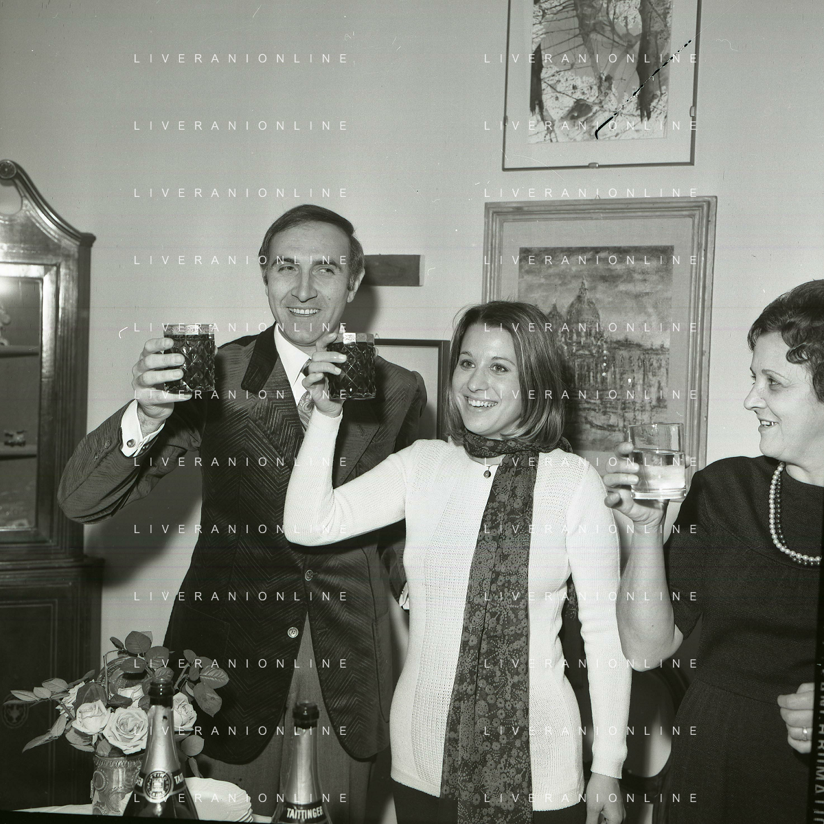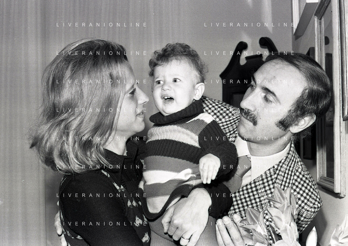 MILANO 1970 RETROSPETTIVA PIPPO BAUDO PRESENTATORE TELEVISIVO NELLA FOTO PIPPO BAUDO CON ANGELA LIPPI IL GIORNO DEL BATTESIMO DELLA FIGLIA TIZIANA AG ALDO LIVERANI SAS