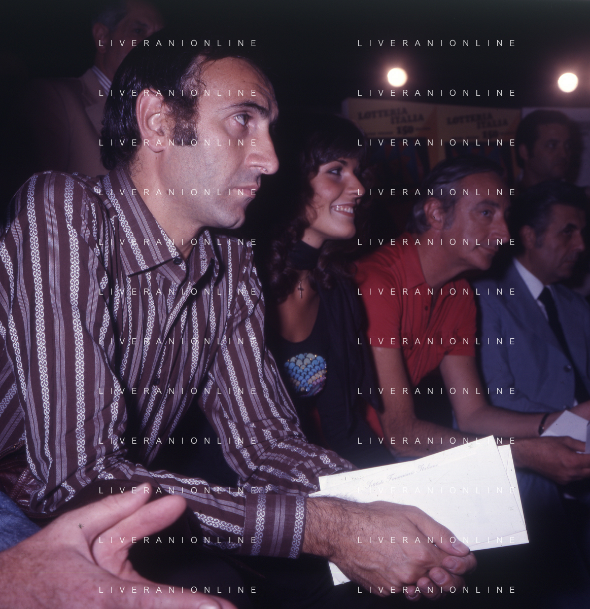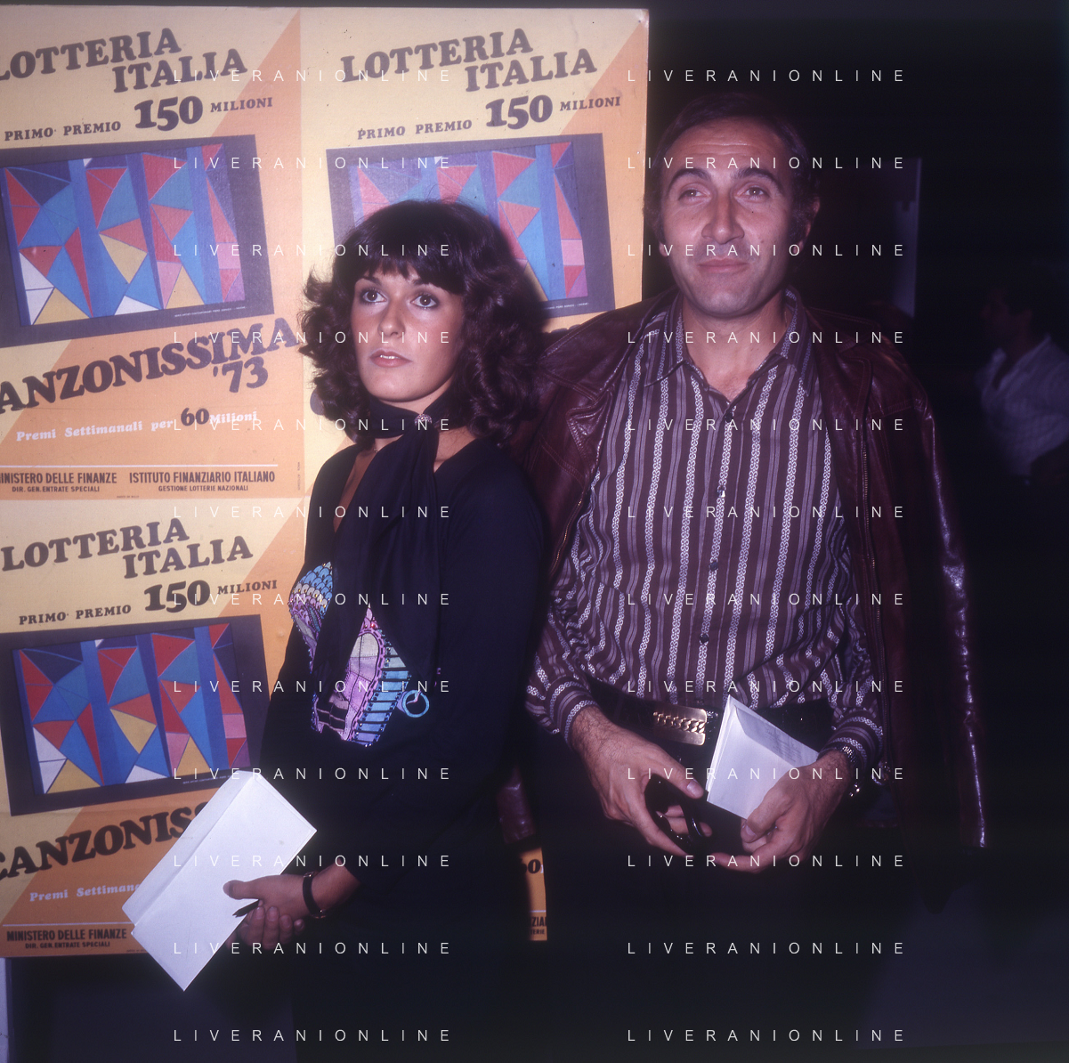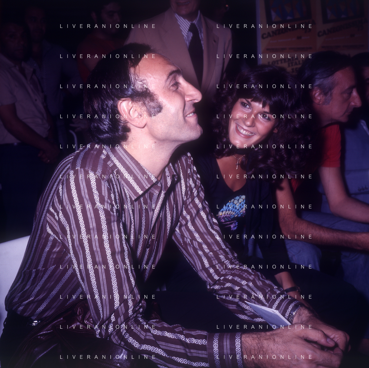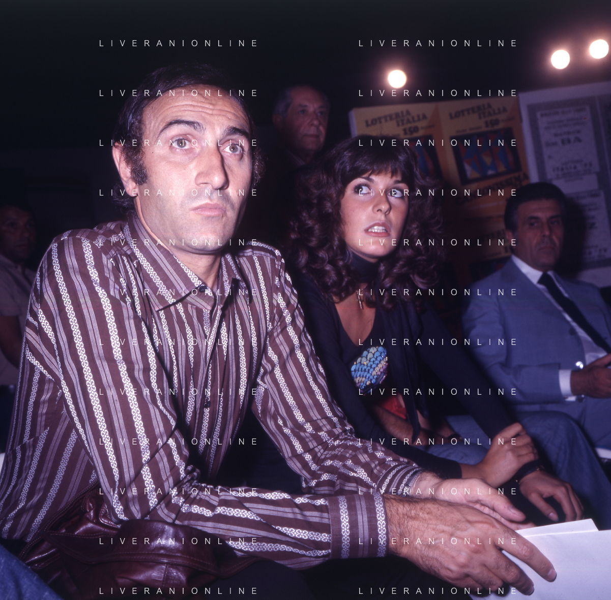 RETROSPETTIVA PIPPO BAUDO PRESENTATORE TELEVISIVO NELLA FOTO PIPPO BAUDO CON MITA MEDICI ALLA PRESENTAZIONE DELLA LOTETRIA ITALIA NELL'ANNO 1973 AG ALDO LIVERANI SAS