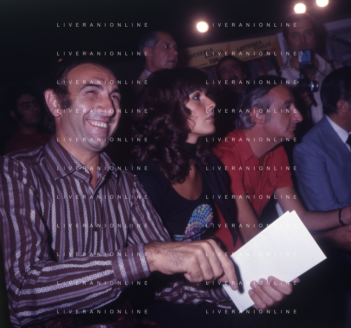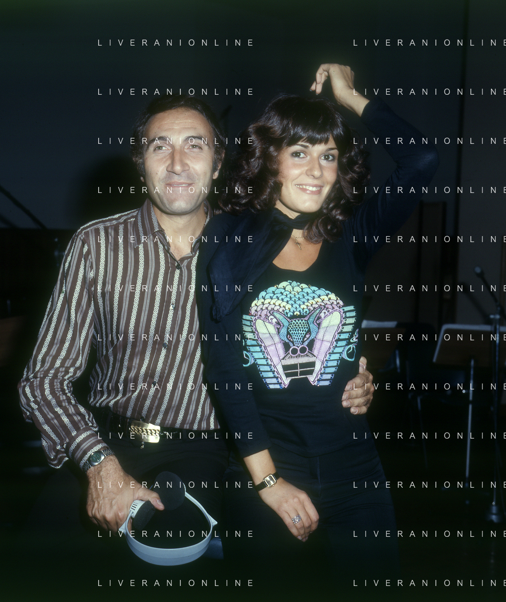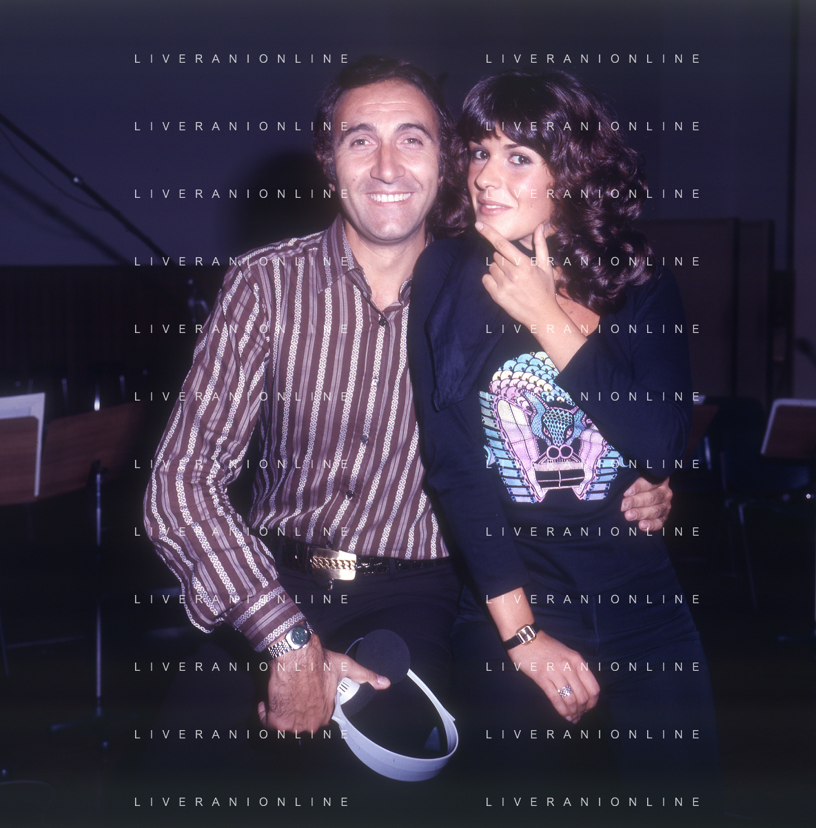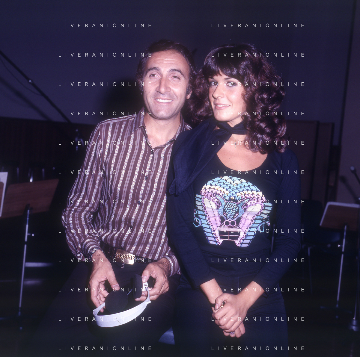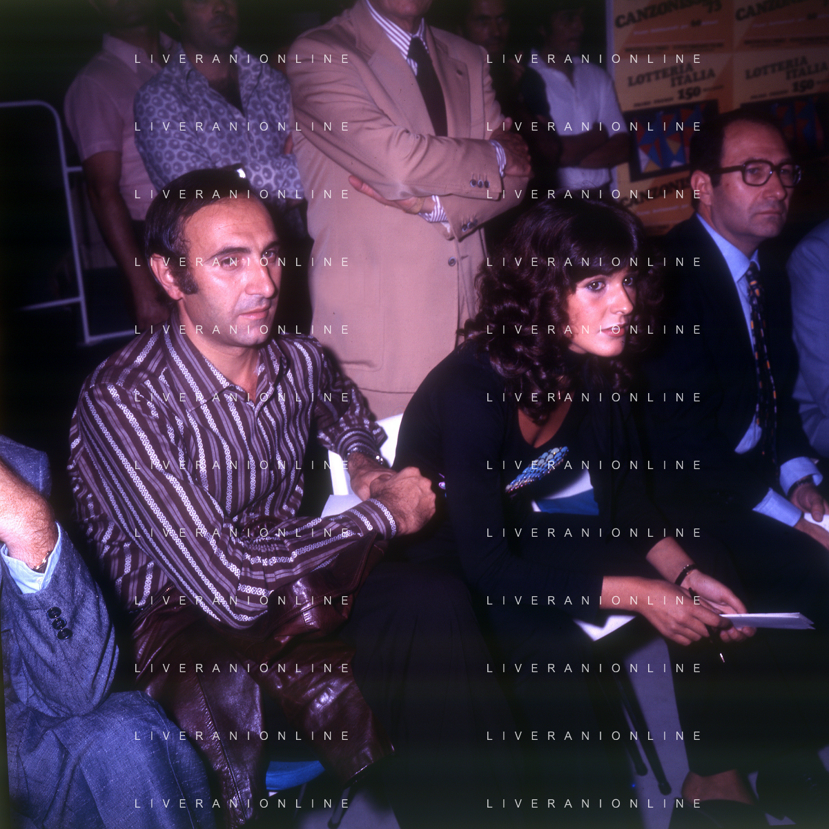 RETROSPETTIVA PIPPO BAUDO PRESENTATORE TELEVISIVO NELLA FOTO PIPPO BAUDO CON MITA MEDICI ALLA PRESENTAZIONE DELLA LOTETRIA ITALIA NELL'ANNO 1973 AG ALDO LIVERANI SAS