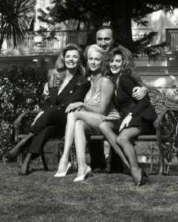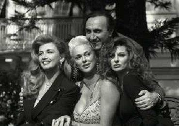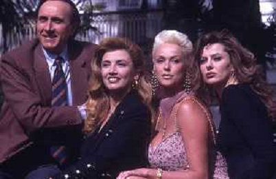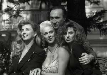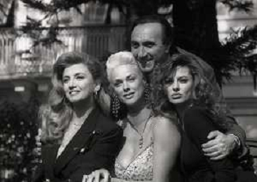 RETROSPETTIVA PIPPO BAUDO PRESENTATORE TELEVISIVO NELLA FOTO PIPPO BAUDO ALLA PRESENTAZIONE DELLE VALLETTE DELLE SERATE DEL FESTIVAL DI SANREMO MILLY CARLUCCI-BRIGITTE NILSEN E ALBA PARIETTI NELL'ANNO 1992 AG ALDO LIVERANI SAS