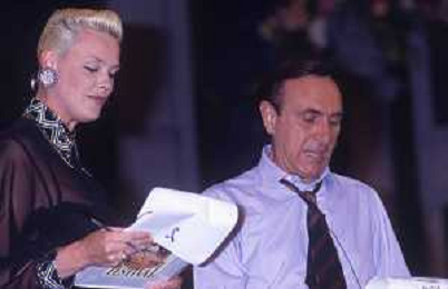 RETROSPETTIVA PIPPO BAUDO PRESENTATORE TELEVISIVO NELLA FOTO PIPPO BAUDO ALLA PRESENTAZIONE DELLE VALLETTE DELLE SERATE DEL FESTIVAL DI SANREMO CON ALBA PARIETTI NELL'ANNO 1992 AG ALDO LIVERANI SAS