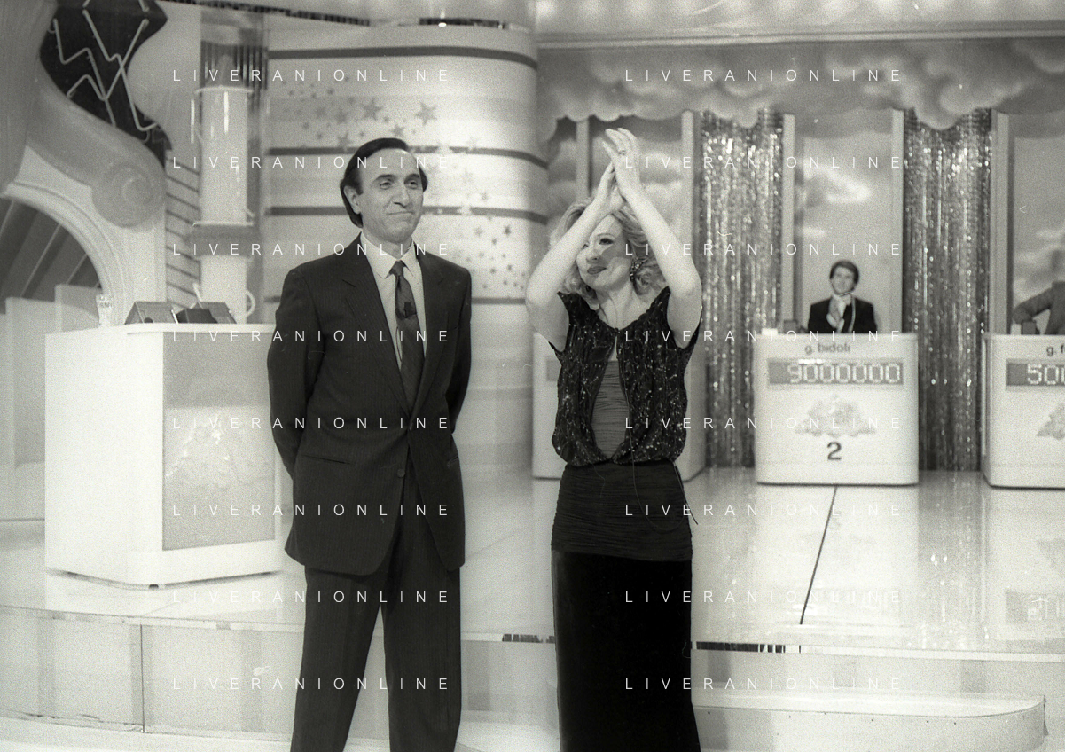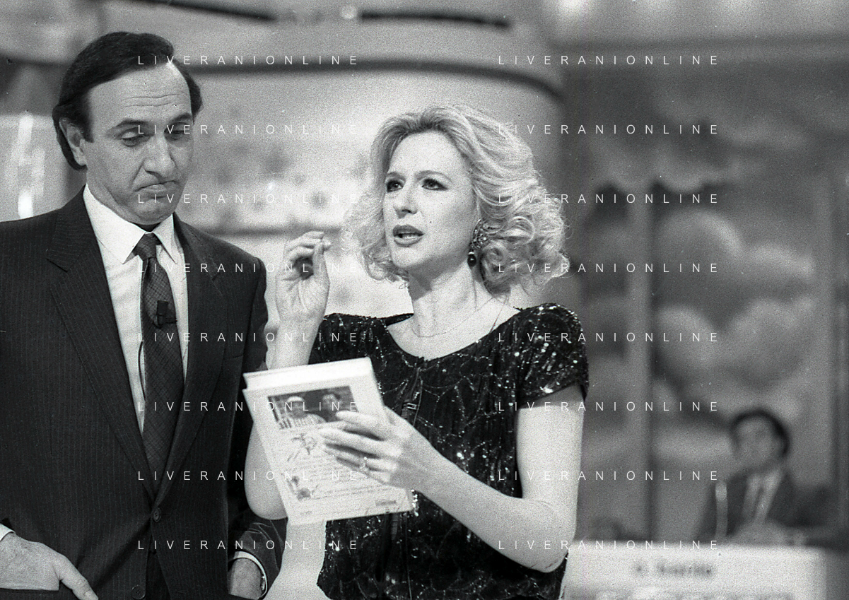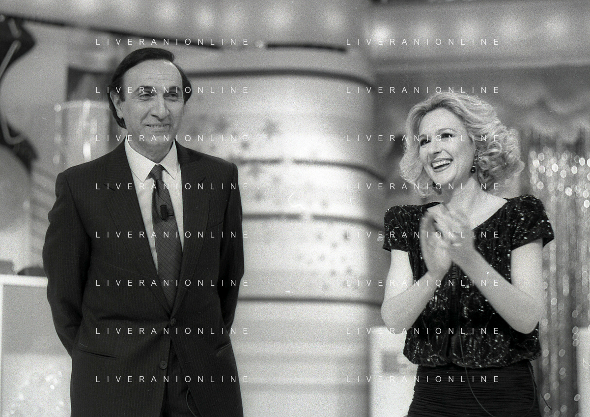 RETROSPETTIVA PIPPO BAUDO PRESENTATORE TELEVISIVO NELLA FOTO FABIO FAZIO CON LORETTA GOGGI NELLA TRASMISSIONE TELEVISIVA “FANTASTICO“ AG ALDO LIVERANI SAS